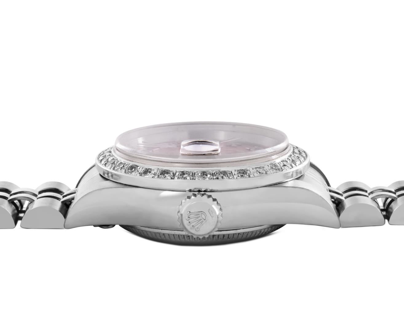 One Rolex Ladies Pre Owned Quickset Stainless Steel Datejust Wristwatch Polished Bright with Satin Finish, Serviced & Electronically Tested, Stainless Steel Case: 26mm, Stainless Steel Crown, Custom Bezel: New 18K White Gold Beadset Diamond Bezel, Diamond Count: 32 Diamonds. Custom Crystal: New Sapphire With Magnified Date Window. Custom Hands: New Luminescent Hands. Rolex Movement: 2235 Automatic Winding Movement. Rolex Dial: Factory Salmon With Roman Hour Markers, and Square Track. Date Window: 3 O'Clock Position Date Display, Model: Quickset Datejust. Condition: G-6 Extra Fine. Rolex Bracelet: Stainless Steel Jubilee Band. Bright Polish & Satin Finish. 6.0 Inch Length, Adjustable. Standard Clasp, With Rolex Logo. This Watch Has Been Serviced Time Tested And Is In Excellent Condition. It Is Free Of All Scratches And Dents.