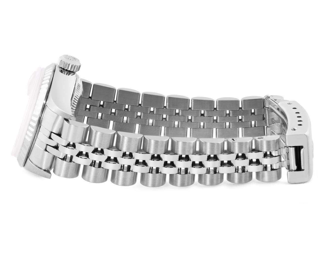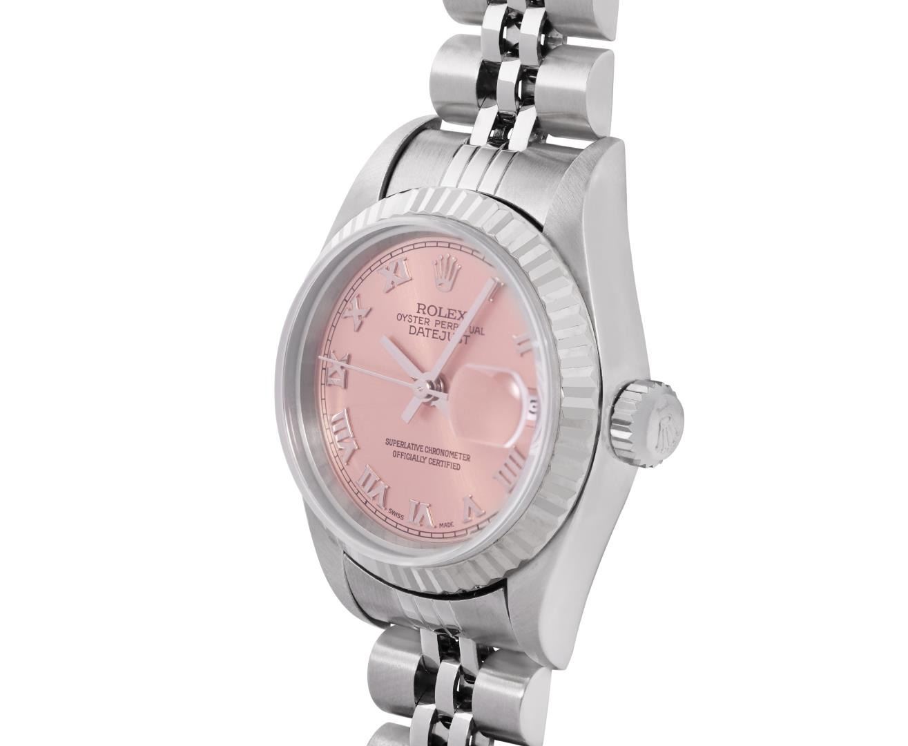 One Rolex Ladies Pre Owned Quickset Stainless Steel Datejust Wristwatch Polished Bright with Satin Finish, Serviced And Electronically Tested, Stainless Steel Case: 26mm, Stainless Steel Crown, Rolex Bezel: 18K White Gold Fluted Bezel. Crystal: Sapphire With Magnified Date Window. Hands: Solid Hands. Rolex Movement: 2235 Automatic Winding Movement. Rolex Dial: Factory Salmon With Roman Hour Markers, and Square Track. Date Window: 3 O'Clock Position Date Display, Model: Quickset Datejust. Condition: G-6 Extra Fine. Rolex Bracelet: Stainless Steel Jubilee Band. Bright Polish And Satin Finish. 6.0 Inch Length, Adjustable. Standard Clasp, With Rolex Logo. This Watch Has Been Serviced Time Tested And Is In Excellent Condition. It Is Free Of All Scratches And Dents.
