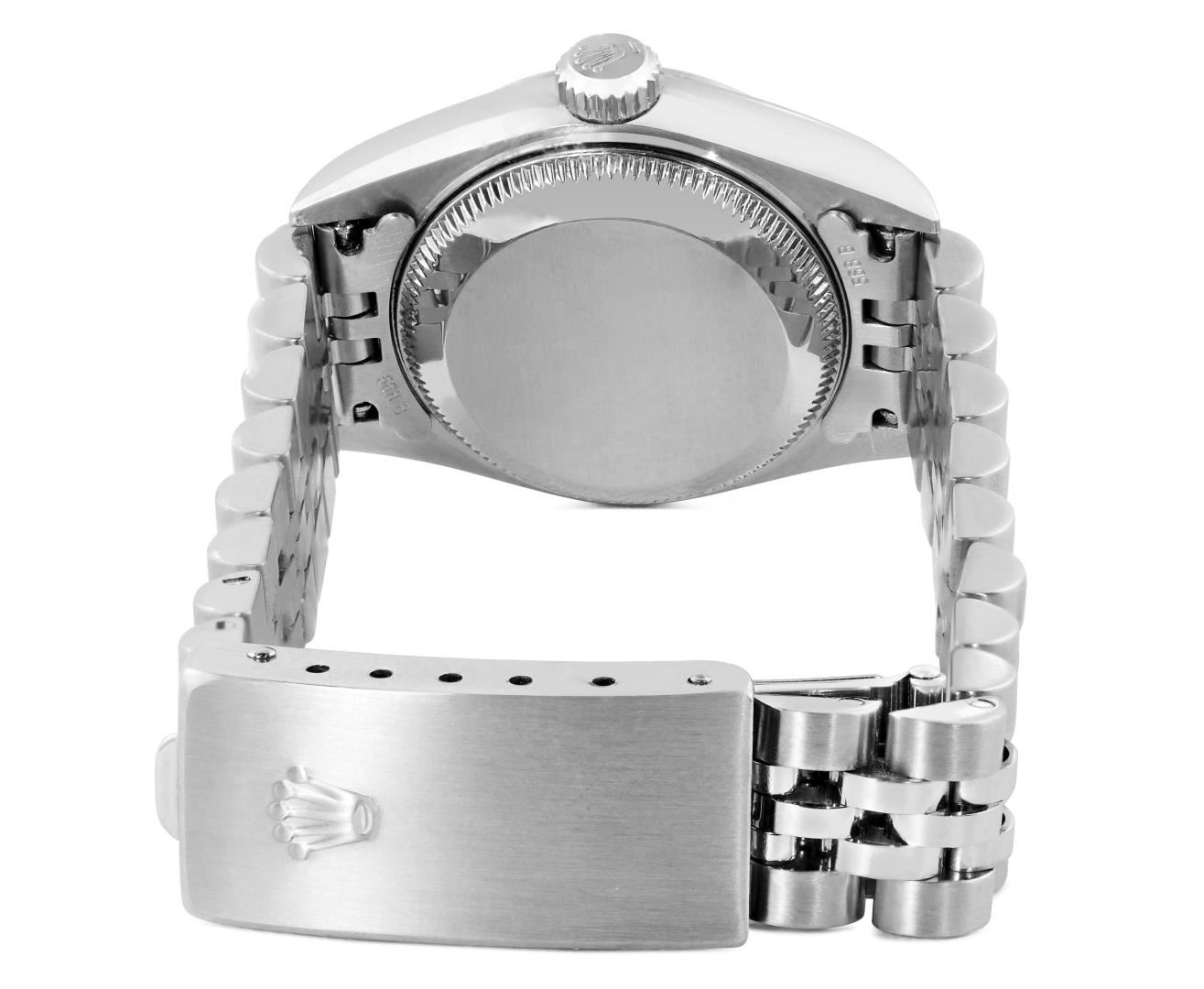One Rolex Ladies Pre Owned Quickset Stainless Steel Datejust Wristwatch Polished Bright with Satin Finish, Serviced And Electronically Tested, Stainless Steel Case: 26mm, Stainless Steel Crown, Rolex Bezel: 18K White Gold Fluted Bezel. Crystal: Sapphire With Magnified Date Window. Hands: Solid Hands. Rolex Movement: 2235 Automatic Winding Movement. Rolex Dial: Factory Salmon With Roman Hour Markers, and Square Track. Date Window: 3 O'Clock Position Date Display, Model: Quickset Datejust. Condition: G-6 Extra Fine. Rolex Bracelet: Stainless Steel Jubilee Band. Bright Polish And Satin Finish. 6.0 Inch Length, Adjustable. Standard Clasp, With Rolex Logo. This Watch Has Been Serviced Time Tested And Is In Excellent Condition. It Is Free Of All Scratches And Dents.