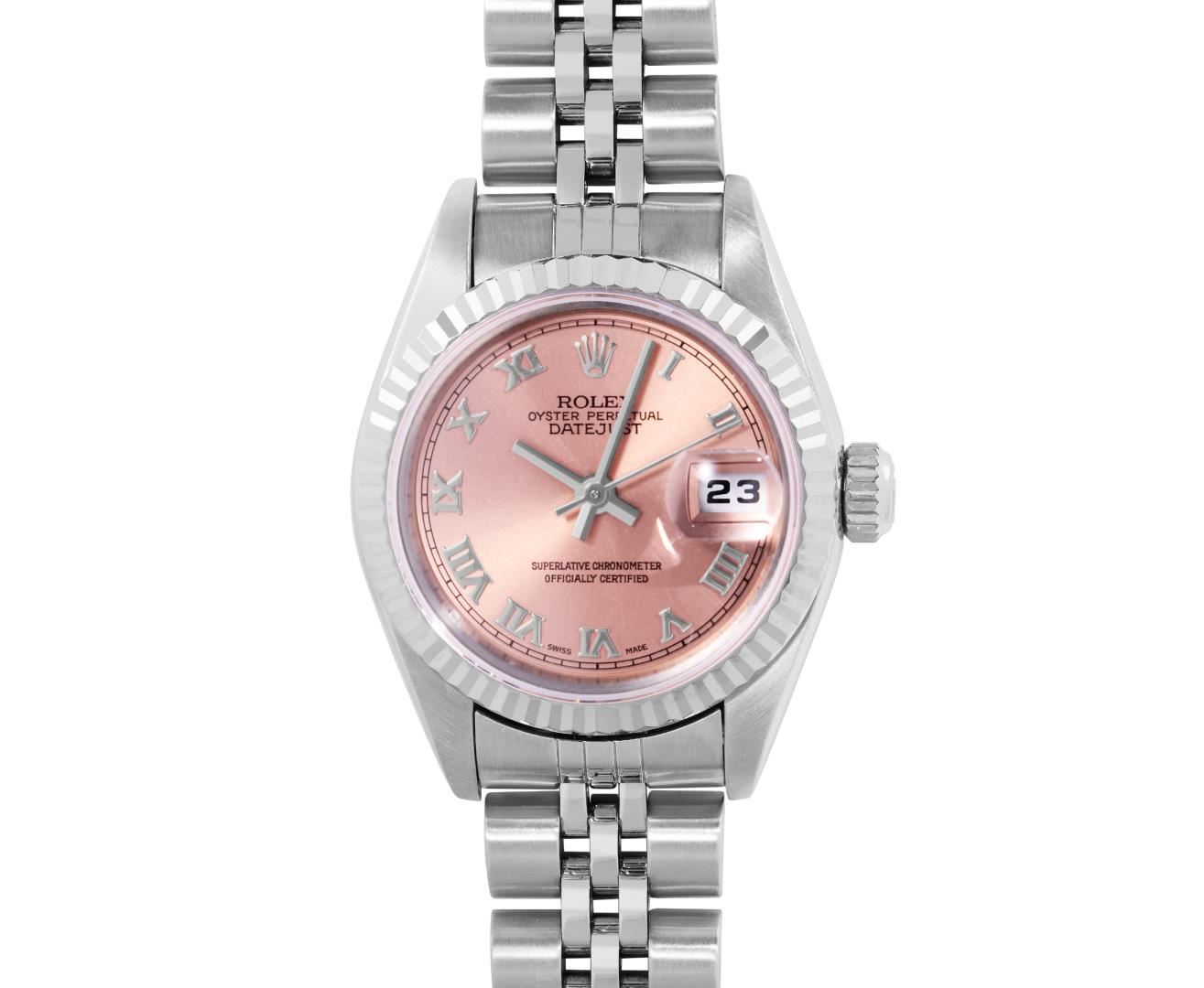 One Rolex Ladies Pre Owned Quickset Stainless Steel Datejust Wristwatch Polished Bright with Satin Finish, Serviced And Electronically Tested, Stainless Steel Case: 26mm, Stainless Steel Crown, Rolex Bezel: 18K White Gold Fluted Bezel. Crystal: Sapphire With Magnified Date Window. Hands: Solid Hands. Rolex Movement: 2235 Automatic Winding Movement. Rolex Dial: Factory Salmon With Roman Hour Markers, and Square Track. Date Window: 3 O'Clock Position Date Display, Model: Quickset Datejust. Condition: G-6 Extra Fine. Rolex Bracelet: Stainless Steel Jubilee Band. Bright Polish And Satin Finish. 6.0 Inch Length, Adjustable. Standard Clasp, With Rolex Logo. This Watch Has Been Serviced Time Tested And Is In Excellent Condition. It Is Free Of All Scratches And Dents.