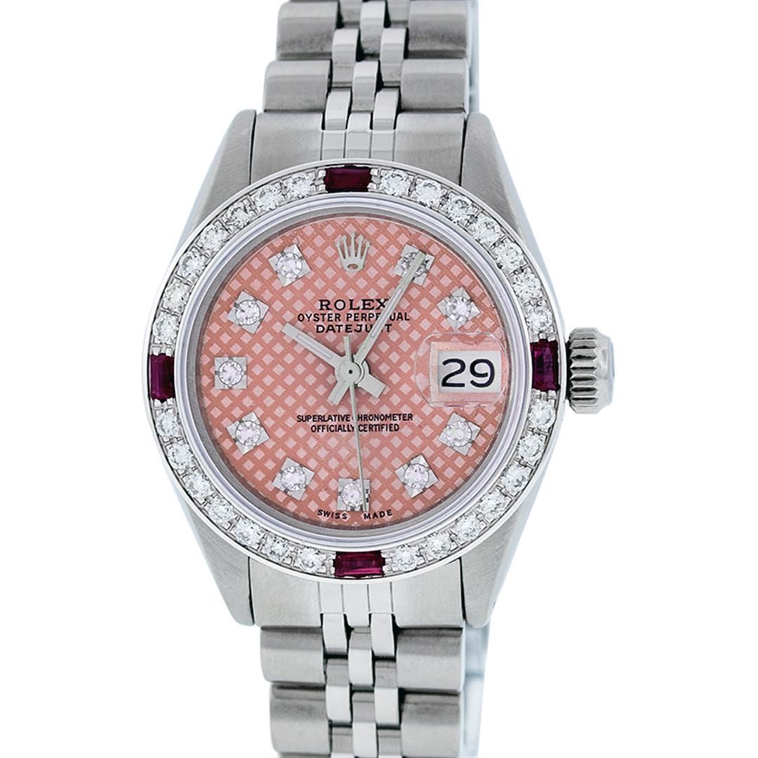 One Ladies Stainless Steel Rolex Datejust Polished Bright with Satin Finish, Serviced & Electronically Tested, Stainless Steel Case: 26mm, Stainless Steel Crown, Custom Bezel: New 18K White Ruby Beadset Diamond Bezel, Diamond + Gem Count: 28 Diamonds + 4 Rubies. Total Weight .70 Carat, Clarity: SI-VS, Color: G to H. Custom Crystal: New Scratch Resistant Synthetic Sapphire Cyclops Lens. Custom Hands: New Luminescent Hands. Movement: Automatic Winding Movement. Custom Dial: Salmon Stamp With Single Cut Diamond Hour Markers, 10 Diamonds in Dial, G To H In Color, Clarity: SI-VS. Date Window: 3 O'Clock Position Date Display, Model: Datejust. Condition: G-6 Extra Fine. Bracelet: Stainless Steel Jubilee Band. Bright Polish & Satin Finish. 6.0 Inch Length, Adjustable. Standard Clasp, With Rolex Logo. This Watch Has Been Serviced Time Tested And Is In Excellent Condition It Is Free Of All Scratches And Dents.
