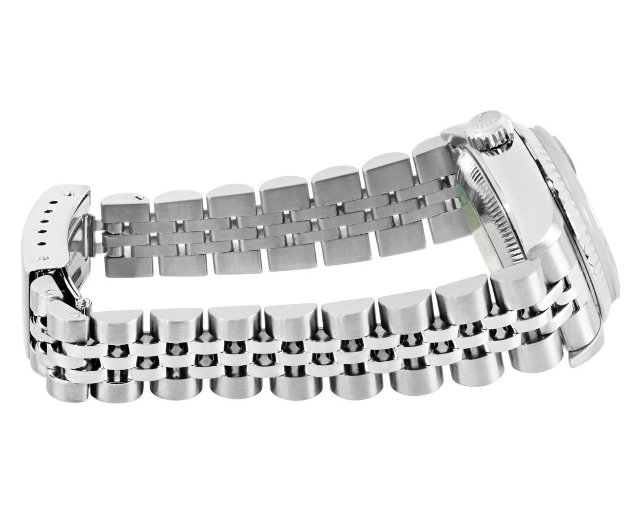 One Rolex Ladies Pre Owned Quickset Stainless Steel Datejust Wristwatch Polished Bright with Satin Finish, Serviced & Electronically Tested, Stainless Steel Case: 26mm, Stainless Steel Crown, Rolex Bezel: 18K White Gold Fluted Bezel, Crystal: Sapphire With Magnifying Date Window. Hands: Luminescent Hands. Rolex Movement: Rolex Automatic Movement Self Winding 2235. Rolex Dial: Factory Black With Index Hour Markers And Dash Track and Lumi Dots. Date Window: 3 O'Clock Position Date Display, Model: Quickset Sapphire Datejust. Condition: G-6 Extra Fine. Rolex Bracelet: Stainless Steel Jubilee Band. Bright Polish & Satin Finish. 6.0 Inch Length, Adjustable. Standard Clasp, With Rolex Logo. This Watch Has Been Serviced Time Tested And Is In Excellent Condition. It Is Free Of All Scratches And Dents.