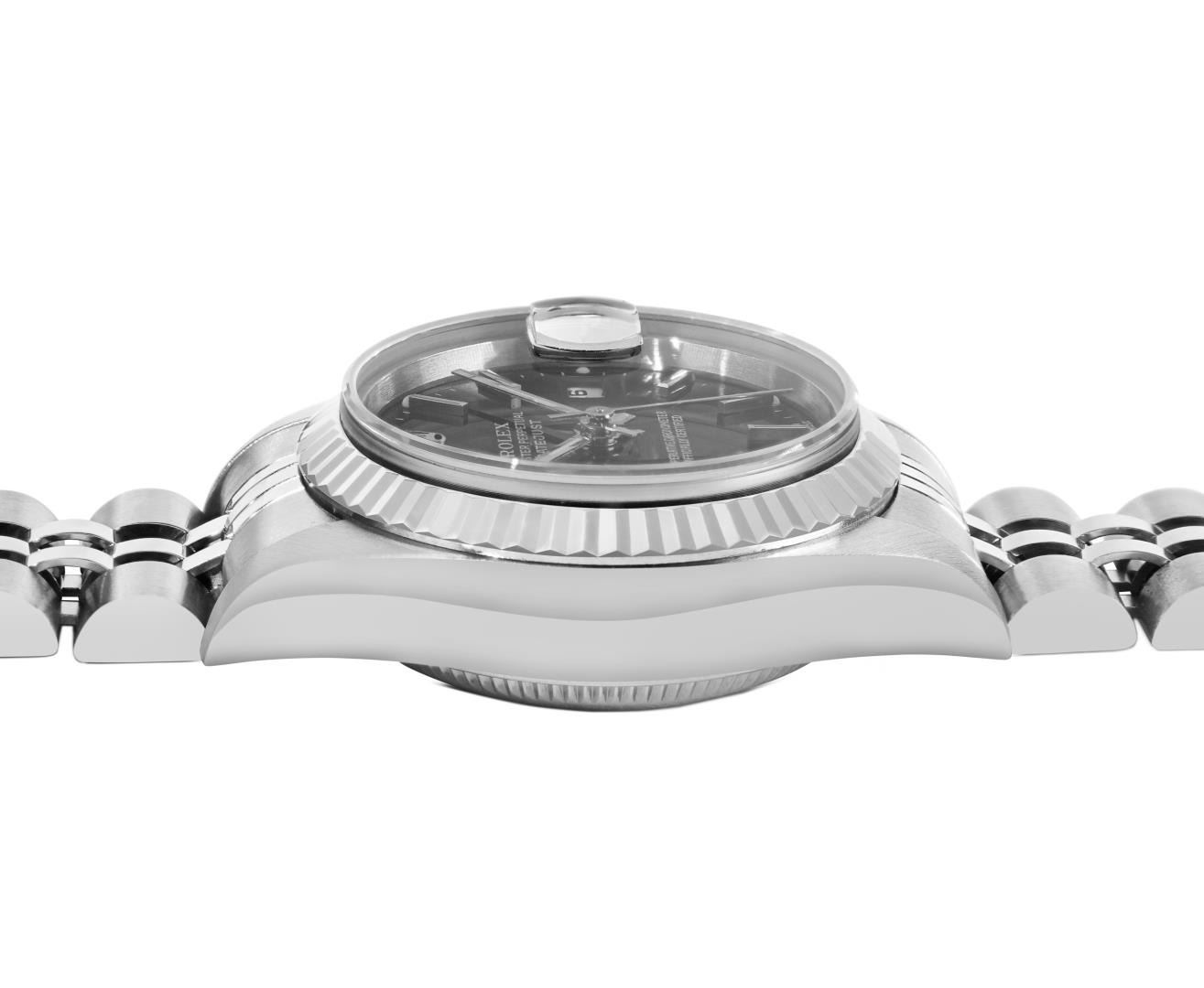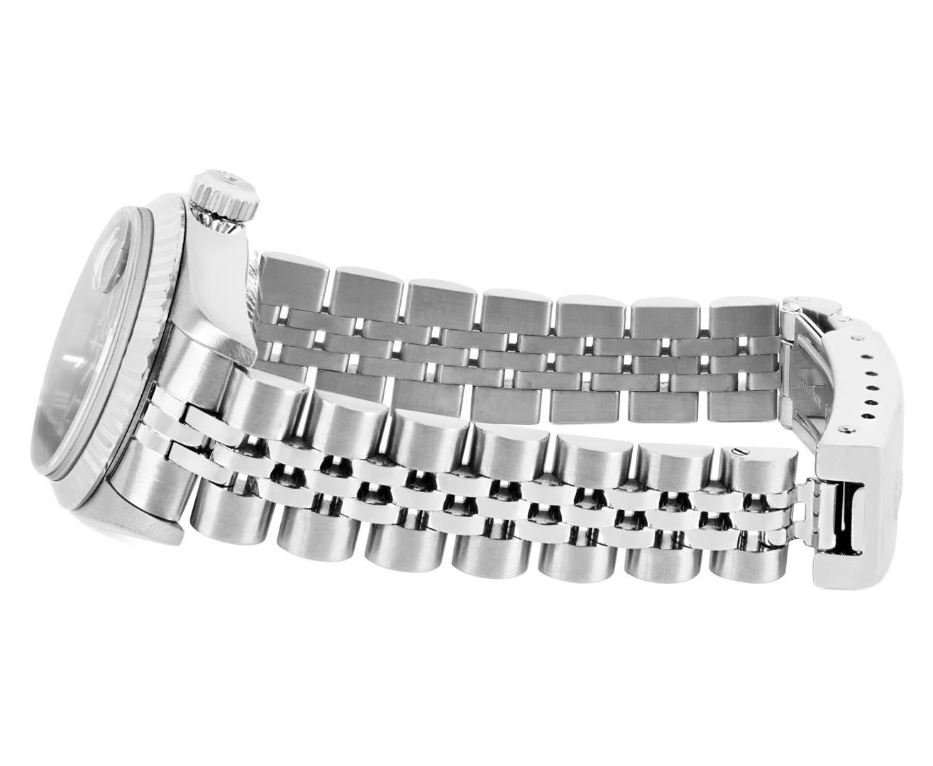 One Rolex Ladies Pre Owned Quickset Stainless Steel Datejust Wristwatch Polished Bright with Satin Finish, Serviced & Electronically Tested, Stainless Steel Case: 26mm, Stainless Steel Crown, Rolex Bezel: 18K White Gold Fluted Bezel, Crystal: Sapphire With Magnifying Date Window. Hands: Luminescent Hands. Rolex Movement: Rolex Automatic Movement Self Winding 2235. Rolex Dial: Factory Black With Index Hour Markers And Dash Track and Lumi Dots. Date Window: 3 O'Clock Position Date Display, Model: Quickset Sapphire Datejust. Condition: G-6 Extra Fine. Rolex Bracelet: Stainless Steel Jubilee Band. Bright Polish & Satin Finish. 6.0 Inch Length, Adjustable. Standard Clasp, With Rolex Logo. This Watch Has Been Serviced Time Tested And Is In Excellent Condition. It Is Free Of All Scratches And Dents.