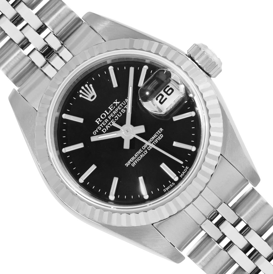 One Rolex Ladies Pre Owned Quickset Stainless Steel Datejust Wristwatch Polished Bright with Satin Finish, Serviced & Electronically Tested, Stainless Steel Case: 26mm, Stainless Steel Crown, Rolex Bezel: 18K White Gold Fluted Bezel, Crystal: Sapphire With Magnifying Date Window. Hands: Luminescent Hands. Rolex Movement: Rolex Automatic Movement Self Winding 2235. Rolex Dial: Factory Black With Index Hour Markers And Dash Track and Lumi Dots. Date Window: 3 O'Clock Position Date Display, Model: Quickset Sapphire Datejust. Condition: G-6 Extra Fine. Rolex Bracelet: Stainless Steel Jubilee Band. Bright Polish & Satin Finish. 6.0 Inch Length, Adjustable. Standard Clasp, With Rolex Logo. This Watch Has Been Serviced Time Tested And Is In Excellent Condition. It Is Free Of All Scratches And Dents.