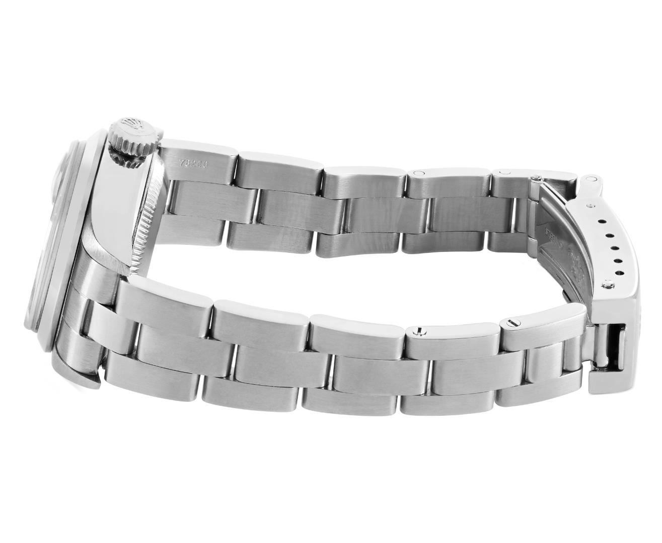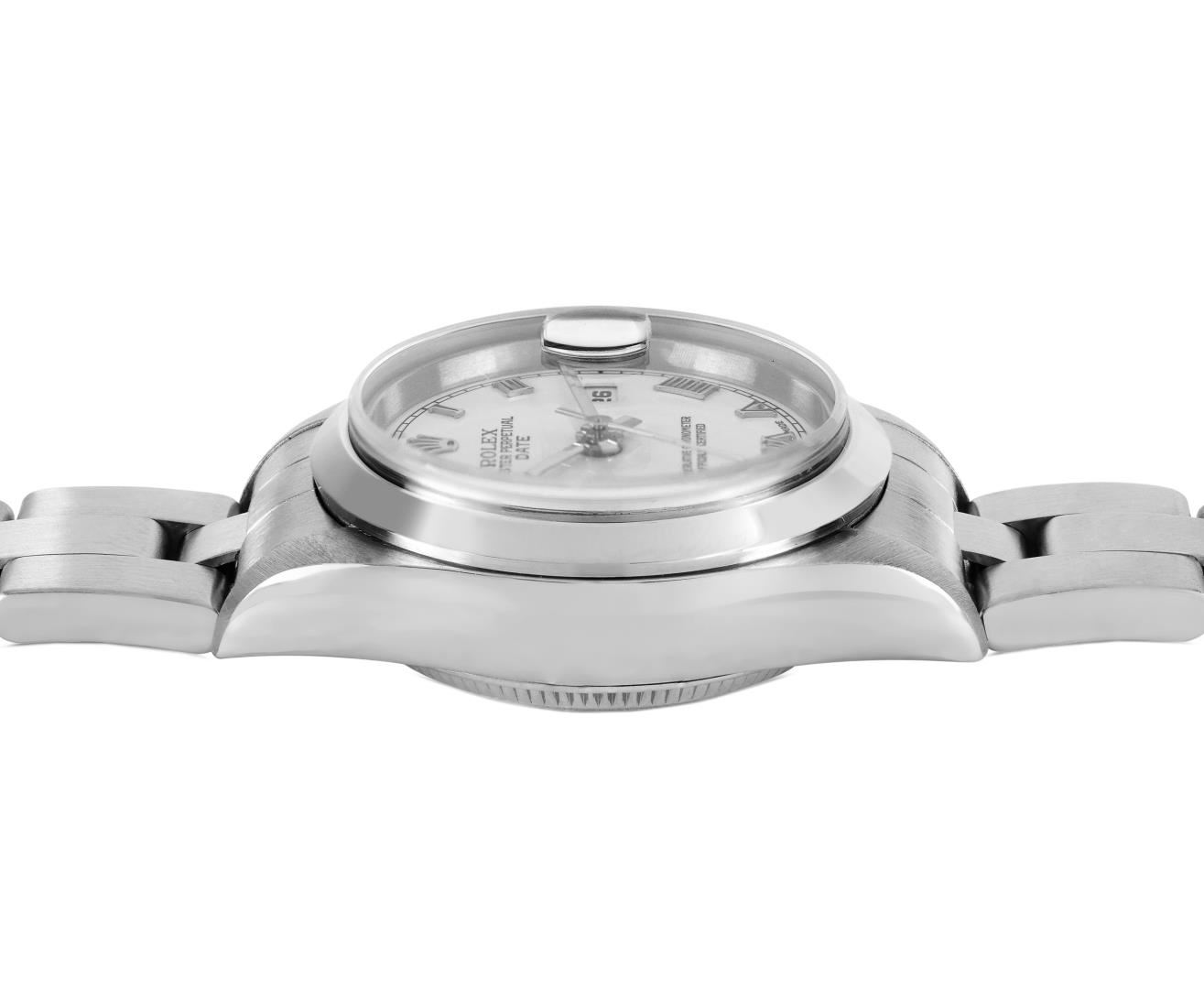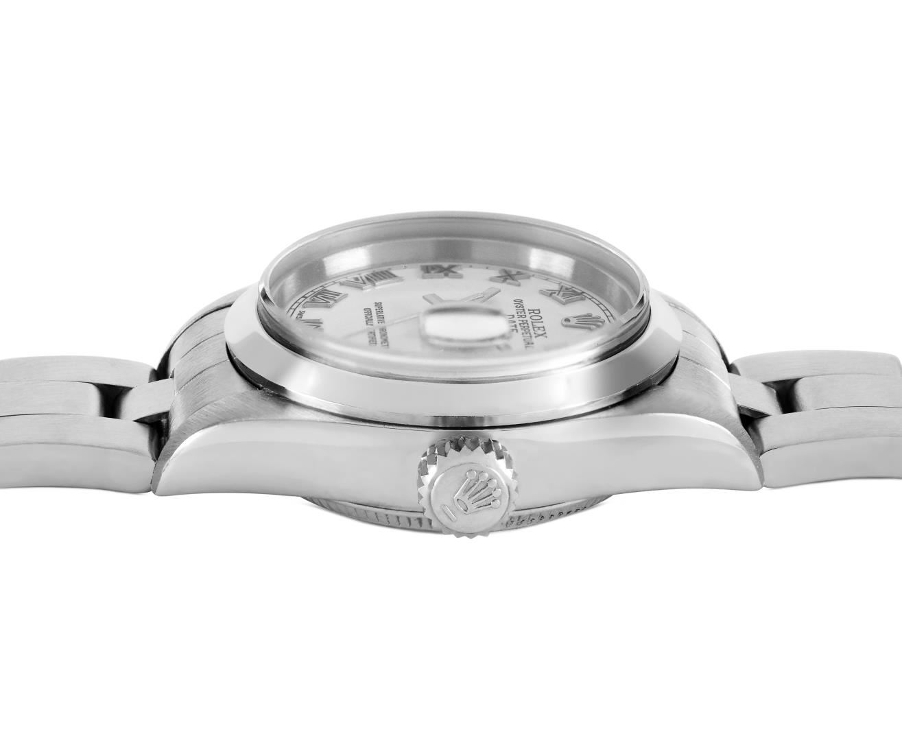 One Rolex Ladies Pre Owned Quickset Stainless Steel Date Wristwatch Polished Bright with Satin Finish, Serviced & Electronically Tested, Stainless Steel Case: 26mm, Stainless Steel Crown, Rolex Stainless Steel Smooth bezel. Crystal: Sapphire With Magnified Date Window. Hands: Luminescent Hands. Rolex Movement: 2235 Automatic Winding Movement. Rolex Dial: Factory White With Roman Hour Markers, Square Track. Date Window: 3 O'Clock Position Date Display, Model: Quickset Date. Condition: G-6 Extra Fine. Rolex Bracelet: Stainless Steel Oyster Band. Bright Polish And Satin Finish. 6.0 Inch Length, Adjustable. Standard Clasp, With Rolex Logo. This Watch Has Been Serviced And Time Tested. It Is In Excellent Condition, Free Of All Scratches And Dents.