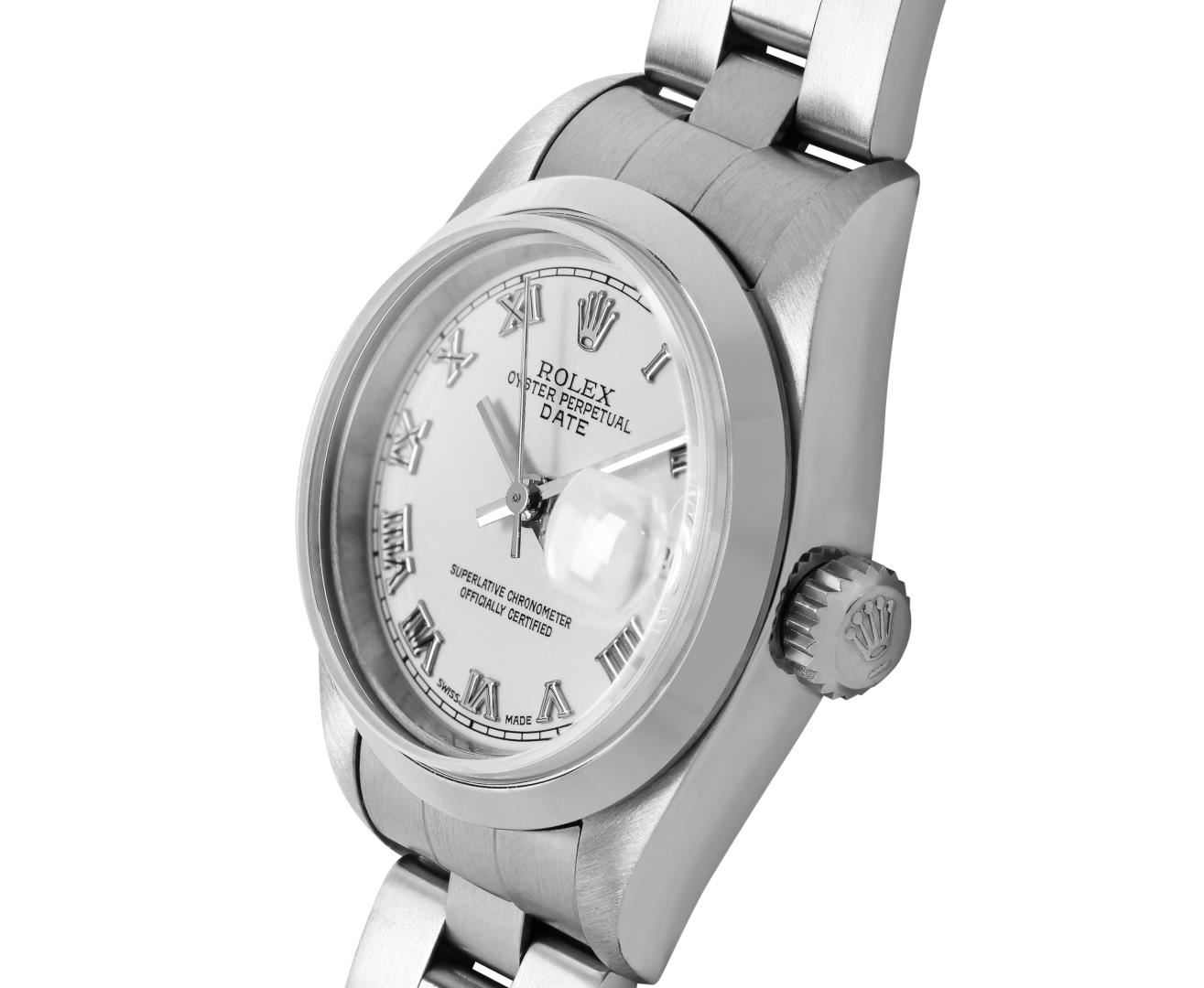 One Rolex Ladies Pre Owned Quickset Stainless Steel Date Wristwatch Polished Bright with Satin Finish, Serviced & Electronically Tested, Stainless Steel Case: 26mm, Stainless Steel Crown, Rolex Stainless Steel Smooth bezel. Crystal: Sapphire With Magnified Date Window. Hands: Luminescent Hands. Rolex Movement: 2235 Automatic Winding Movement. Rolex Dial: Factory White With Roman Hour Markers, Square Track. Date Window: 3 O'Clock Position Date Display, Model: Quickset Date. Condition: G-6 Extra Fine. Rolex Bracelet: Stainless Steel Oyster Band. Bright Polish And Satin Finish. 6.0 Inch Length, Adjustable. Standard Clasp, With Rolex Logo. This Watch Has Been Serviced And Time Tested. It Is In Excellent Condition, Free Of All Scratches And Dents.