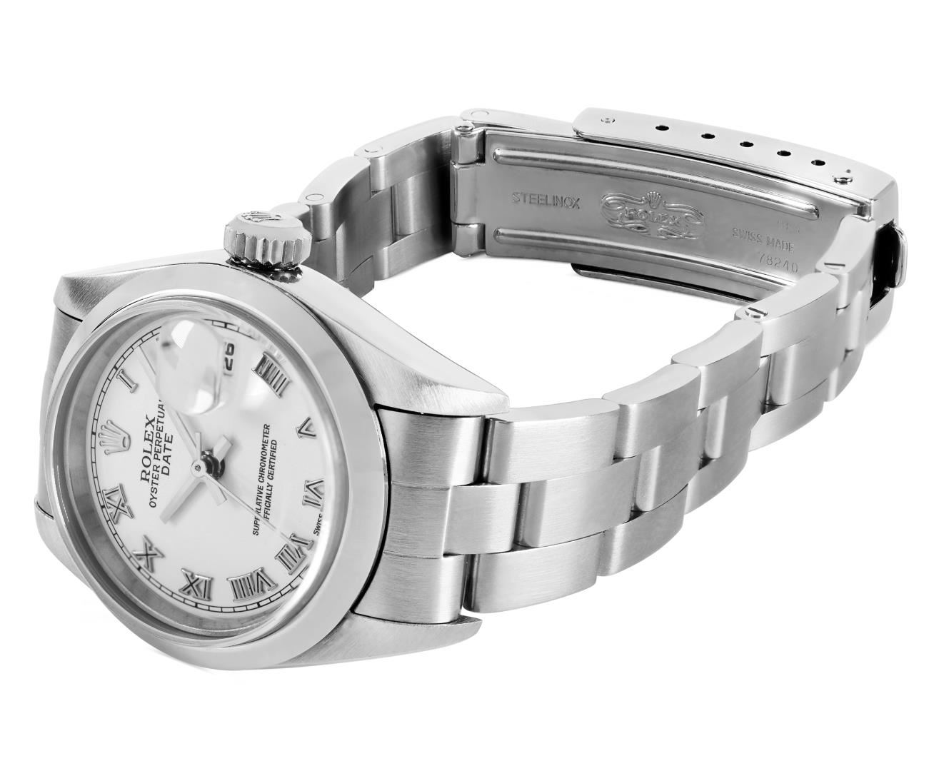 One Rolex Ladies Pre Owned Quickset Stainless Steel Date Wristwatch Polished Bright with Satin Finish, Serviced & Electronically Tested, Stainless Steel Case: 26mm, Stainless Steel Crown, Rolex Stainless Steel Smooth bezel. Crystal: Sapphire With Magnified Date Window. Hands: Luminescent Hands. Rolex Movement: 2235 Automatic Winding Movement. Rolex Dial: Factory White With Roman Hour Markers, Square Track. Date Window: 3 O'Clock Position Date Display, Model: Quickset Date. Condition: G-6 Extra Fine. Rolex Bracelet: Stainless Steel Oyster Band. Bright Polish And Satin Finish. 6.0 Inch Length, Adjustable. Standard Clasp, With Rolex Logo. This Watch Has Been Serviced And Time Tested. It Is In Excellent Condition, Free Of All Scratches And Dents.