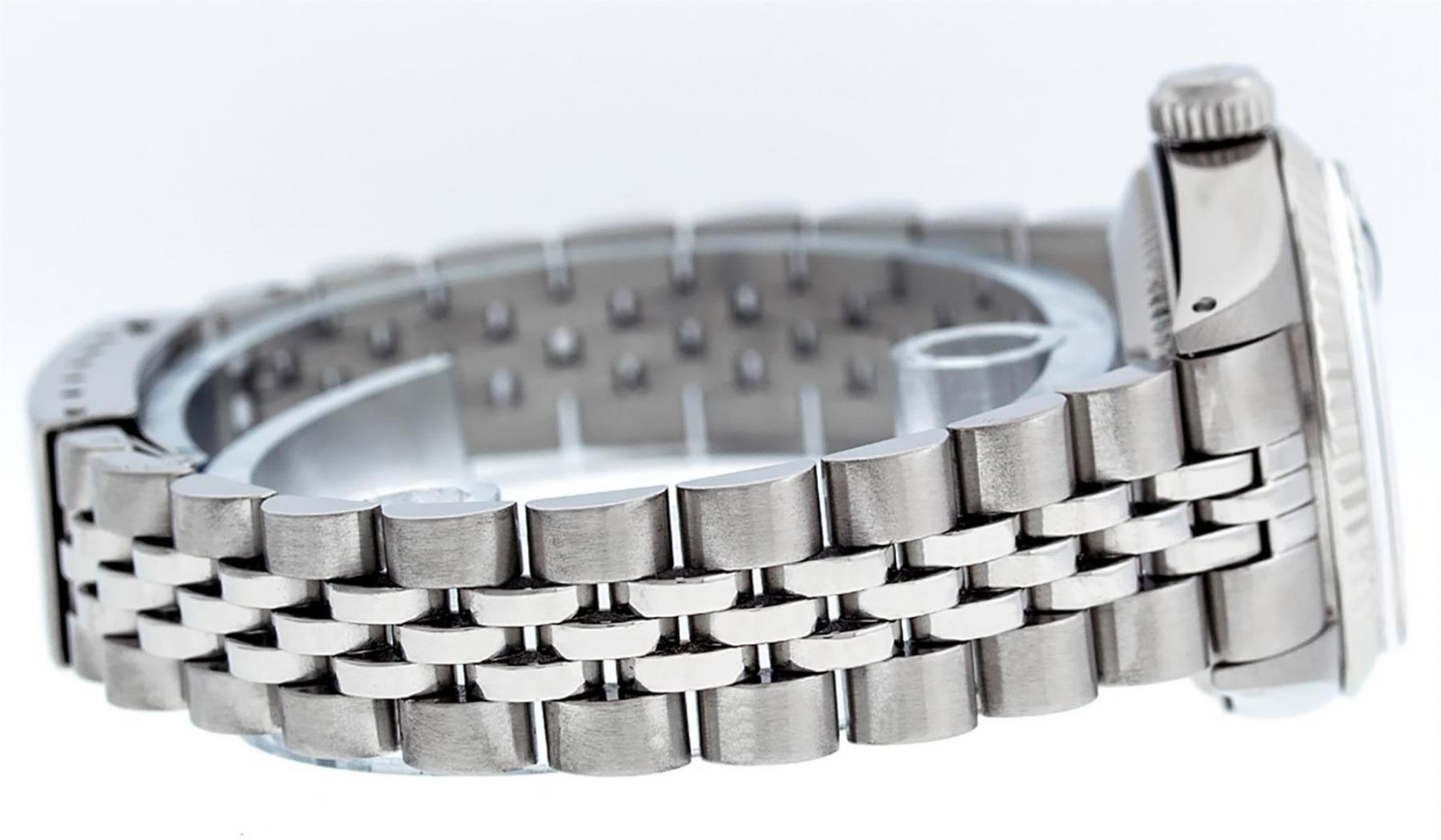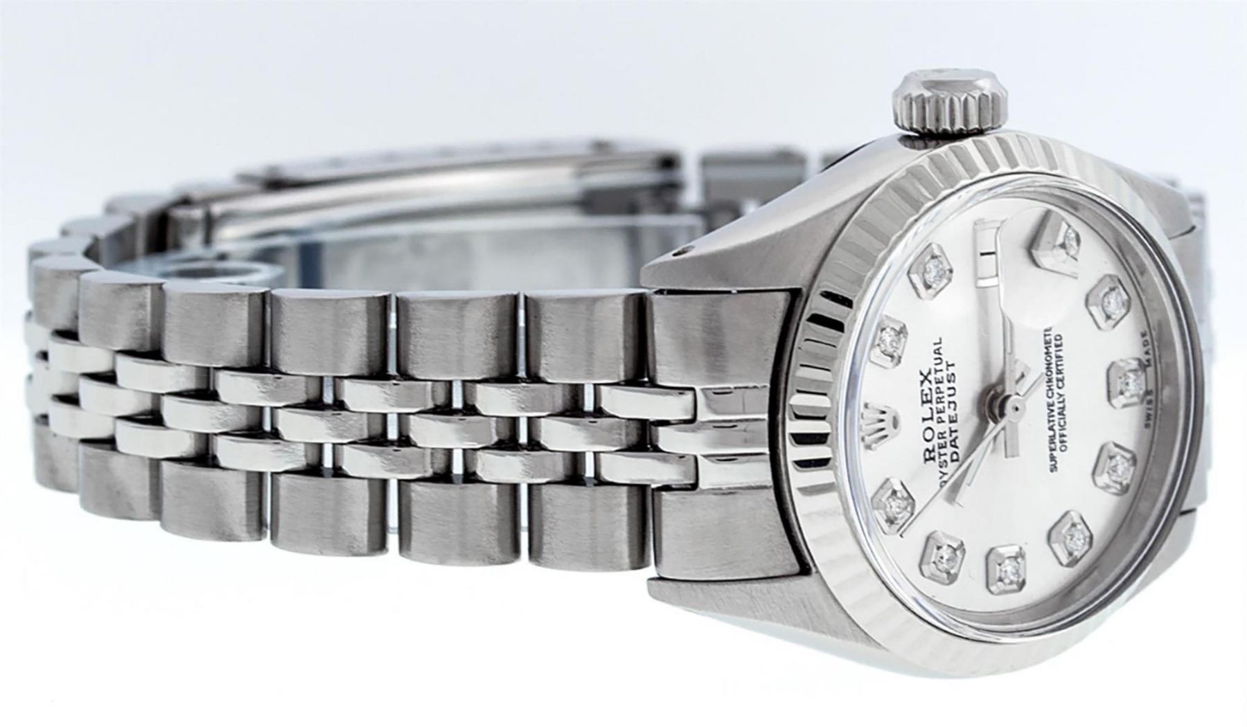 One Ladies Stainless Steel Rolex Datejust Polished Bright with Satin Finish, Serviced & Electronically Tested, Stainless Steel Case: 26mm, Stainless Steel Crown, Bezel: 14K White Gold Bezel. Custom Crystal: New Acrylic Cyclops Lens. Custom Hands: New Luminescent Hands. Movement: Automatic Winding Movement . Dial: Silver Diamond Dial, Diamond Count: 10 Diamonds In Dial, Color: G to H, Clarity: SI-VS. Date Window: 3 O'Clock Position Date Display, Model: Datejust. Condition: G-6 Extra Fine. Bracelet: Stainless Steel Jubilee Band. Bright Polish & Satin Finish. 6.0 Inch Length, Adjustable. Standard Clasp, With Rolex Logo. This Watch Has Been Serviced Time Tested And Is In Excellent Condition It Is Free Of All Scratches And Dents.