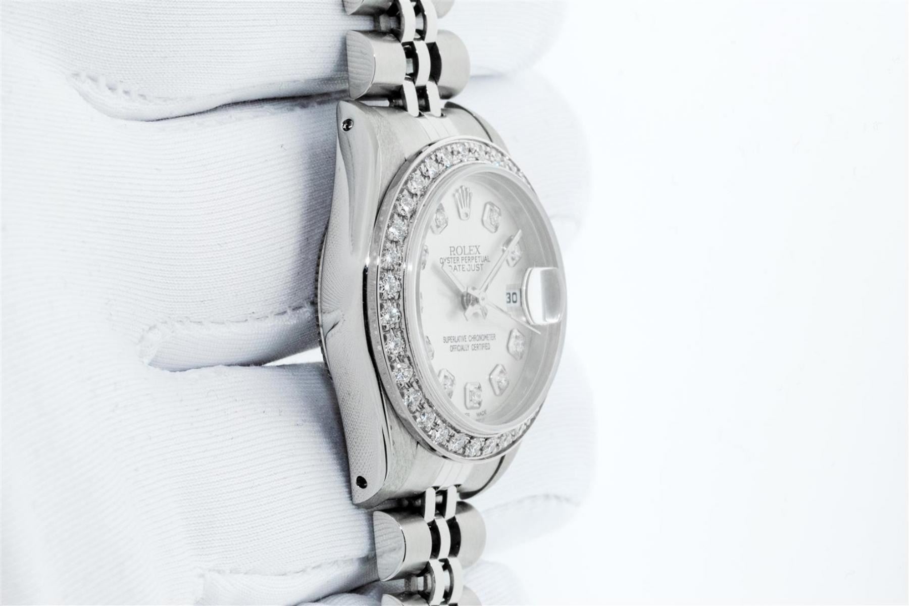 One Ladies Stainless Steel Rolex Oyster Perpetual Datejust Polished Bright with Satin Finish, Serviced & Electronically Tested, Stainless Steel Case: 26mm, Stainless Steel Crown, Custom Bezel: New 18K White Gold Beadset Diamond Bezel, Diamond Count: 32 Diamonds, Total Weight .70 Carat, Clarity: SI-VS, Color: G to H. Custom Crystal: New Scratch Resistant Synthetic Sapphire Cyclops Lens. Custom Hands: New Luminescent Hands. Movement: Automatic Winding Movement. Custom Dial: Refinished Silver Diamond Dial, Diamond Count: 10 Diamonds In Dial, Color: G To H, Clarity: SI-VS. Date Window: 3 O'Clock Position Date Display, Model: Datejust. Condition: G-6 Extra Fine. Bracelet: Stainless Steel Jubilee Band. Bright Polish & Satin Finish. 6.0 Inch Length, Adjustable. Standard Clasp, With Rolex Logo. This Watch Has Been Serviced Time Tested And Is In Excellent Condition It Is Free Of All Scratches And Dents. This Watch Comes With A Rolex Box.