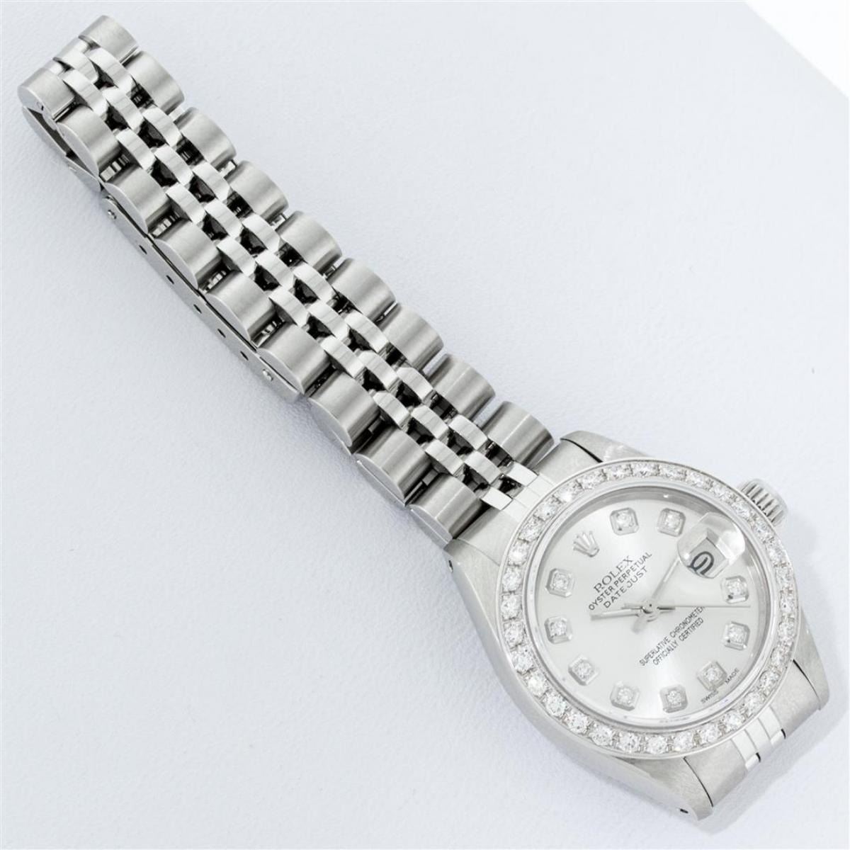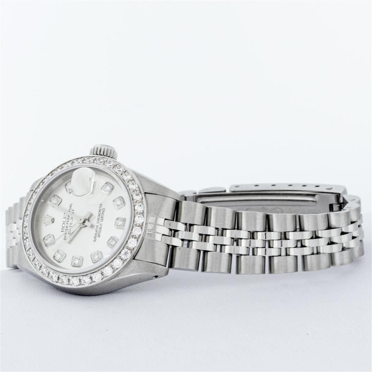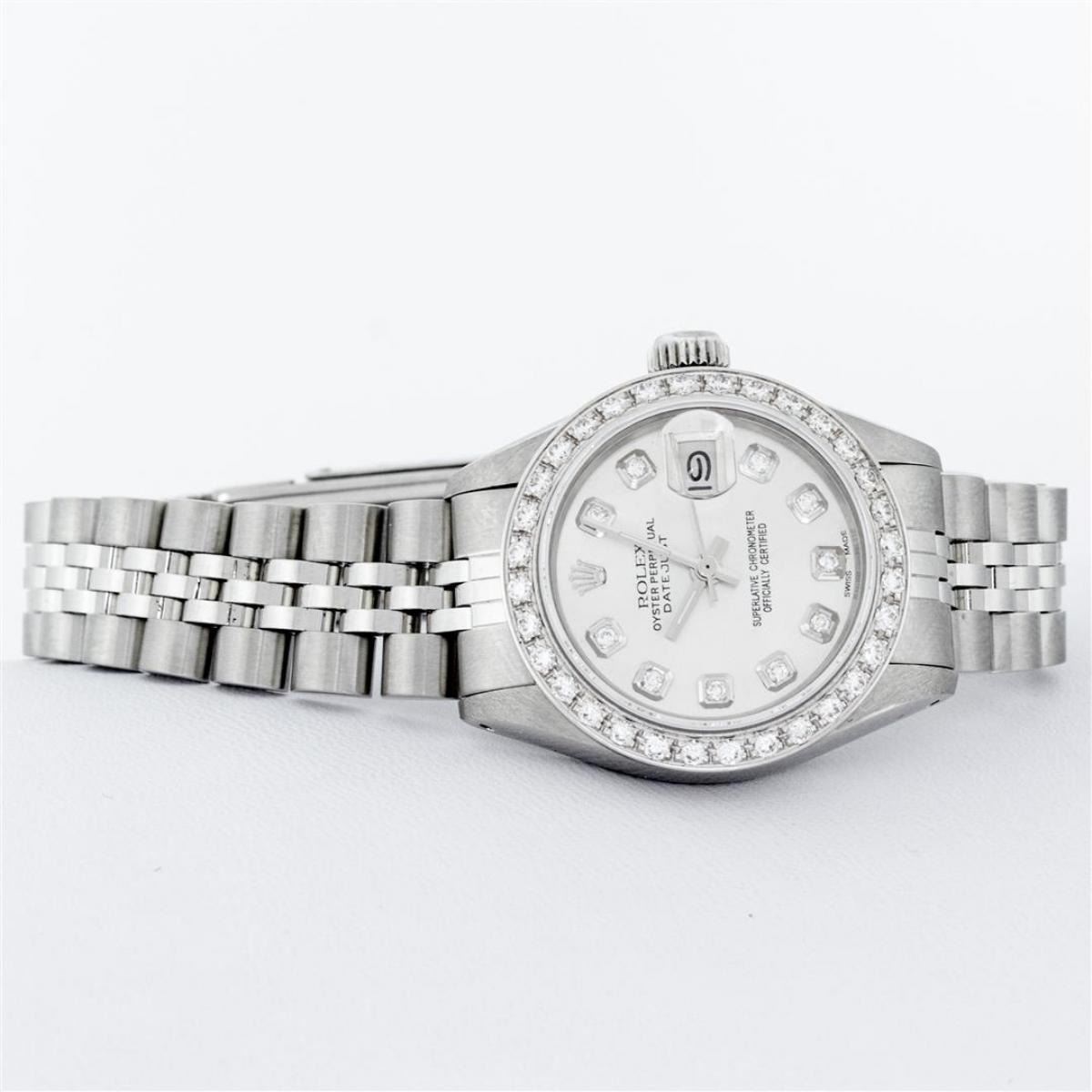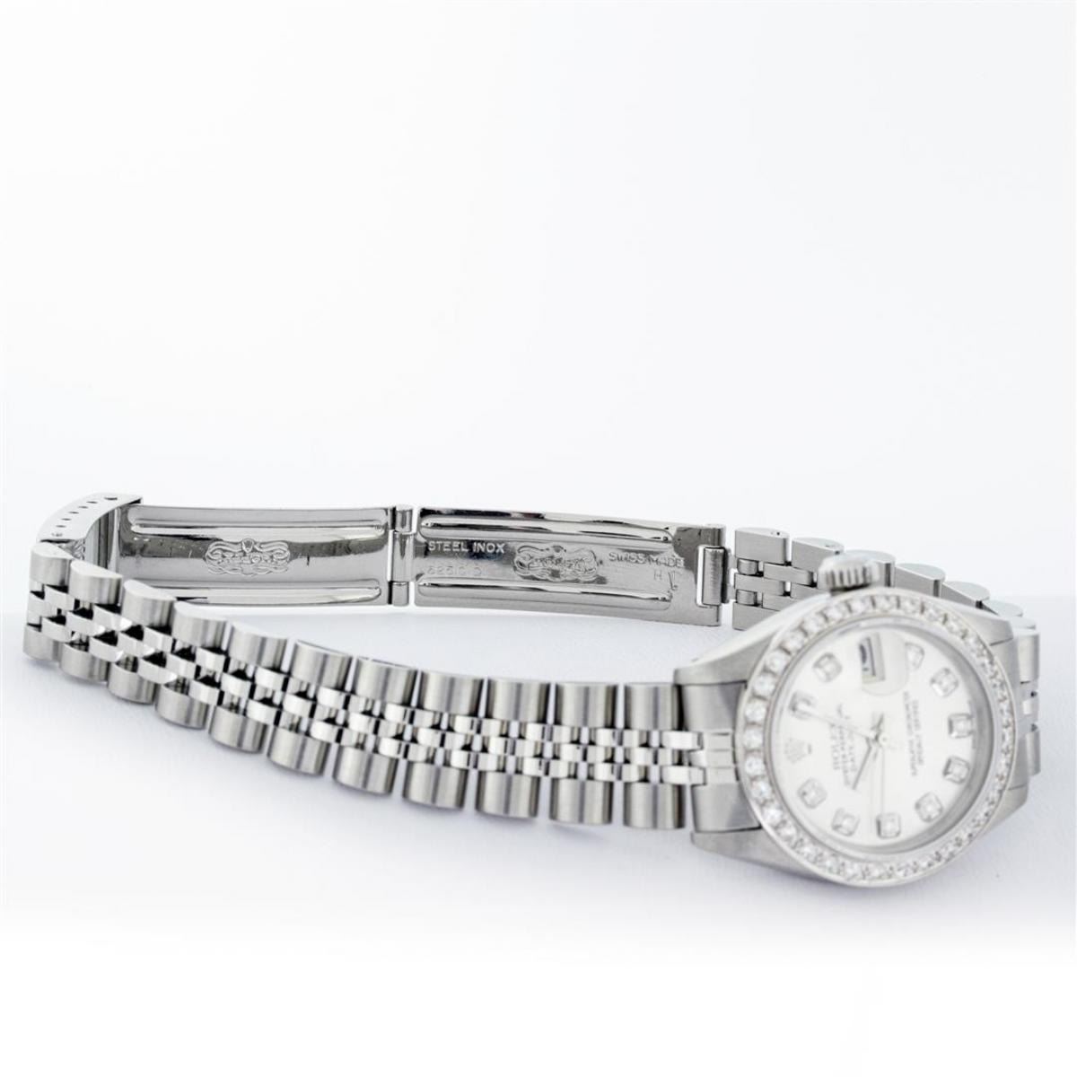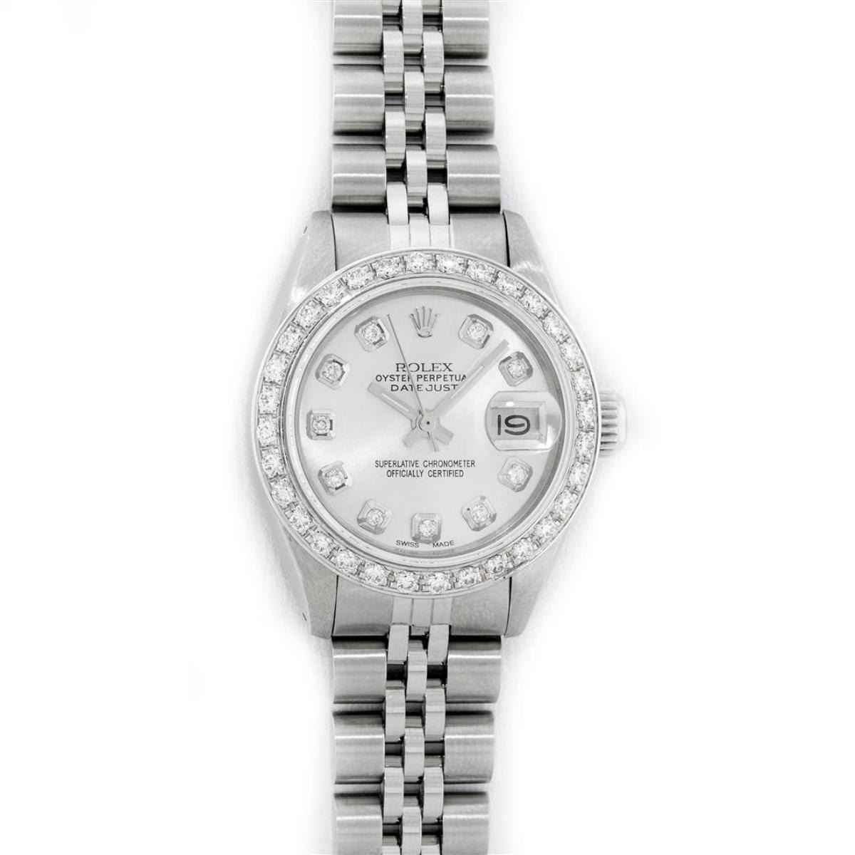 One Ladies Stainless Steel Rolex Oyster Perpetual Datejust Polished Bright with Satin Finish, Serviced & Electronically Tested, Stainless Steel Case: 26mm, Stainless Steel Crown, Custom Bezel: New 18K White Gold Beadset Diamond Bezel, Diamond Count: 32 Diamonds, Total Weight .70 Carat, Clarity: SI-VS, Color: G to H. Custom Crystal: New Scratch Resistant Synthetic Sapphire Cyclops Lens. Custom Hands: New Luminescent Hands. Movement: Automatic Winding Movement. Custom Dial: Refinished Silver Diamond Dial, Diamond Count: 10 Diamonds In Dial, Color: G To H, Clarity: SI-VS. Date Window: 3 O'Clock Position Date Display, Model: Datejust. Condition: G-6 Extra Fine. Bracelet: Stainless Steel Jubilee Band. Bright Polish & Satin Finish. 6.0 Inch Length, Adjustable. Standard Clasp, With Rolex Logo. This Watch Has Been Serviced Time Tested And Is In Excellent Condition It Is Free Of All Scratches And Dents.