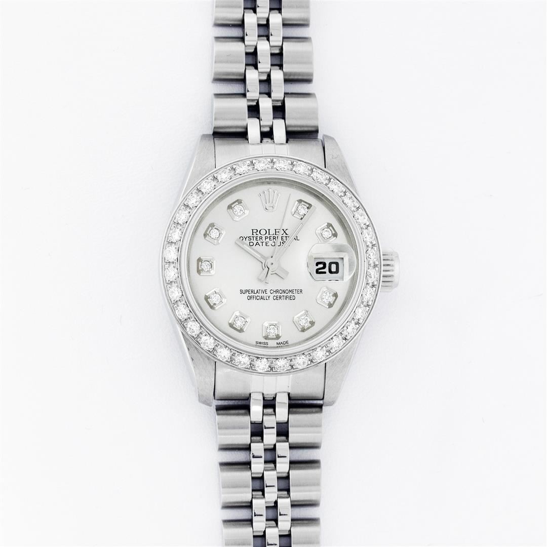 One Ladies Stainless Steel Rolex Oyster Perpetual Datejust Polished Bright with Satin Finish, Serviced & Electronically Tested, Stainless Steel Case: 26mm, Stainless Steel Crown, Custom Bezel: New 18K White Gold Beadset Diamond Bezel, Diamond Count: 32 Diamonds, Total Weight .70 Carat, Clarity: SI-VS, Color: G to H. Custom Crystal: New Scratch Resistant Synthetic Sapphire Cyclops Lens. Custom Hands: New Luminescent Hands. Movement: Automatic Winding Movement. Custom Dial: Refinished Silver Diamond Dial, Diamond Count: 10 Diamonds In Dial, Color: G To H, Clarity: SI-VS. Date Window: 3 O'Clock Position Date Display, Model: Datejust. Condition: G-6 Extra Fine. Bracelet: Stainless Steel Jubilee Band. Bright Polish & Satin Finish. 6.0 Inch Length, Adjustable. Standard Clasp, With Rolex Logo. This Watch Has Been Serviced Time Tested And Is In Excellent Condition It Is Free Of All Scratches And Dents.