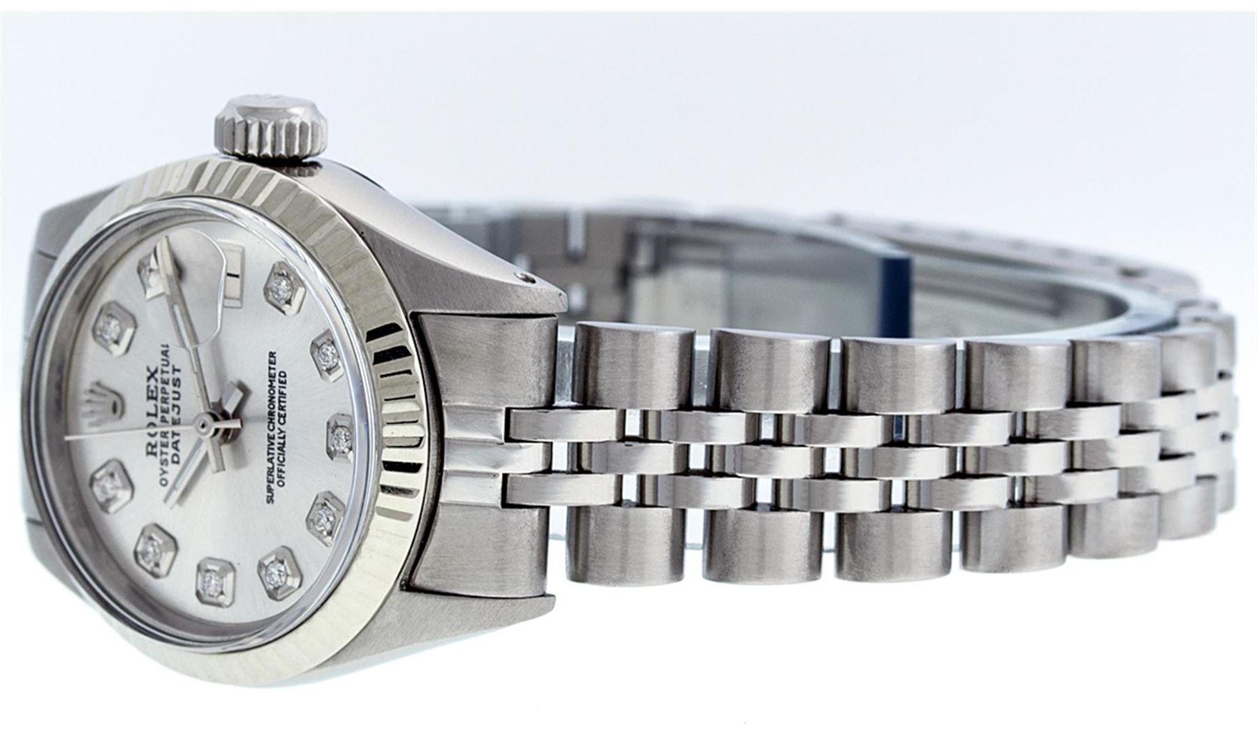 One Ladies Rolex Datejust Polished Bright with Satin Finish, Serviced & Electronically Tested, Stainless Steel Case:26mm, Stainless Steel Crown, Bezel: 14K White Gold Fluted. Custom Crystal: Acrylic Cyclops Lens. Movement: Automatic Winding Movement Caliber 2030. Custom Dial: Silver With Diamond Hour Markers, Diamond Count: 10 Diamonds, Clarity: SI-VS, Color: G to H. Date Window: 3 O'Clock Position Date Display, Model: Datejust. Condition: G-6 Extra Fine. Bracelet: Stainless Steel Jubilee Band. Bright Polish & Satin Finish. 6.0 Inch Length, Adjustable. Standard Clasp, With Rolex Logo.