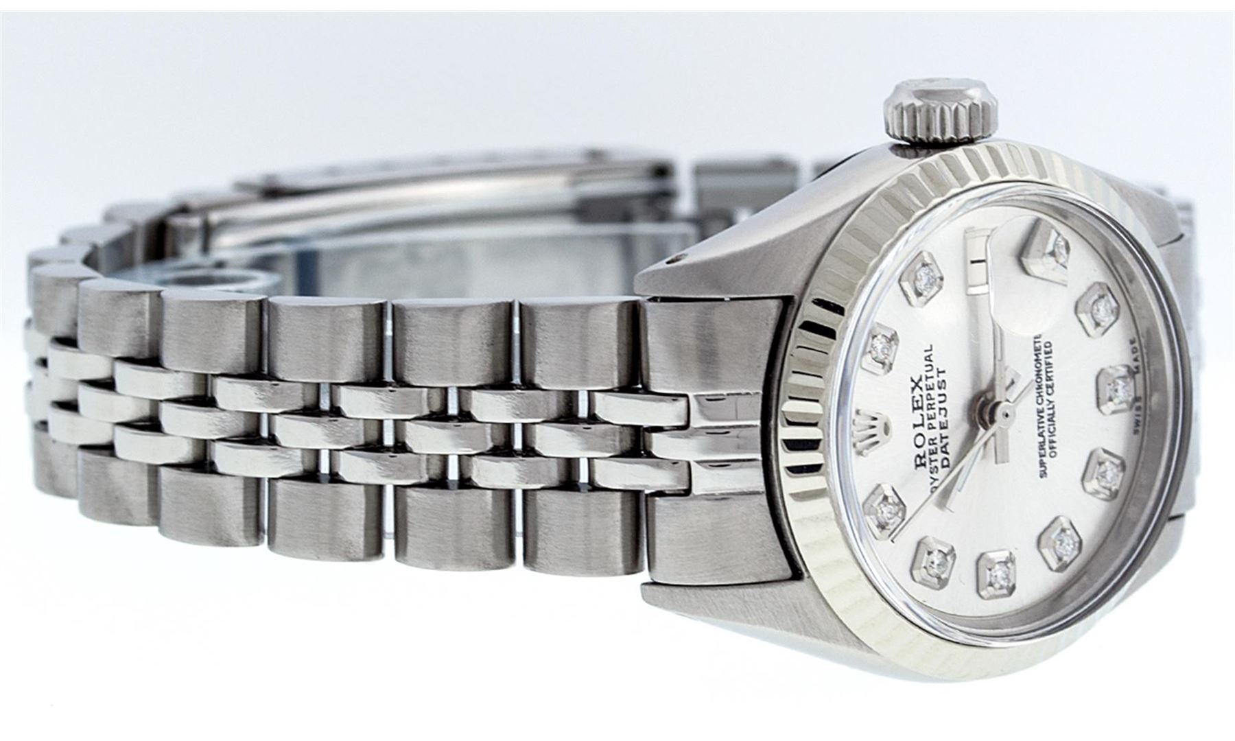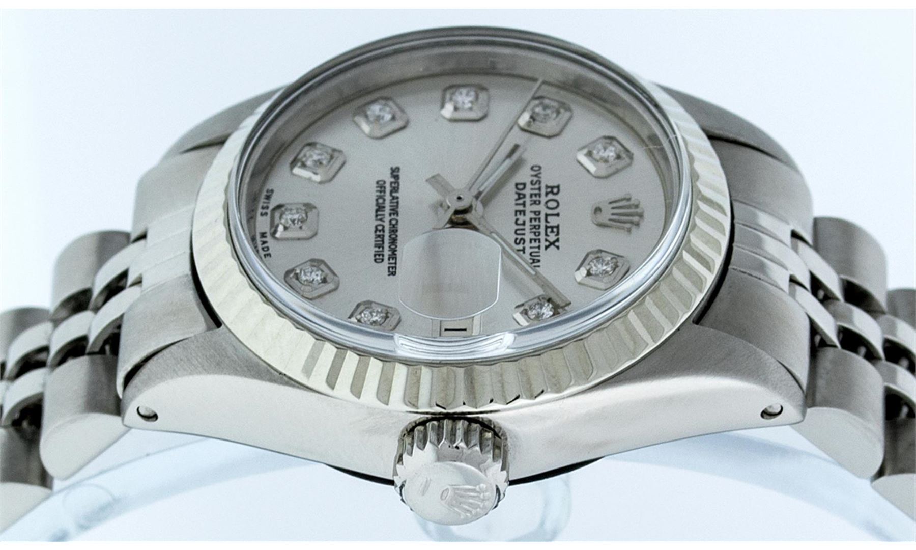 One Ladies Rolex Datejust Polished Bright with Satin Finish, Serviced & Electronically Tested, Stainless Steel Case:26mm, Stainless Steel Crown, Bezel: 14K White Gold Fluted. Custom Crystal: Acrylic Cyclops Lens. Movement: Automatic Winding Movement Caliber 2030. Custom Dial: Silver With Diamond Hour Markers, Diamond Count: 10 Diamonds, Clarity: SI-VS, Color: G to H. Date Window: 3 O'Clock Position Date Display, Model: Datejust. Condition: G-6 Extra Fine. Bracelet: Stainless Steel Jubilee Band. Bright Polish & Satin Finish. 6.0 Inch Length, Adjustable. Standard Clasp, With Rolex Logo.