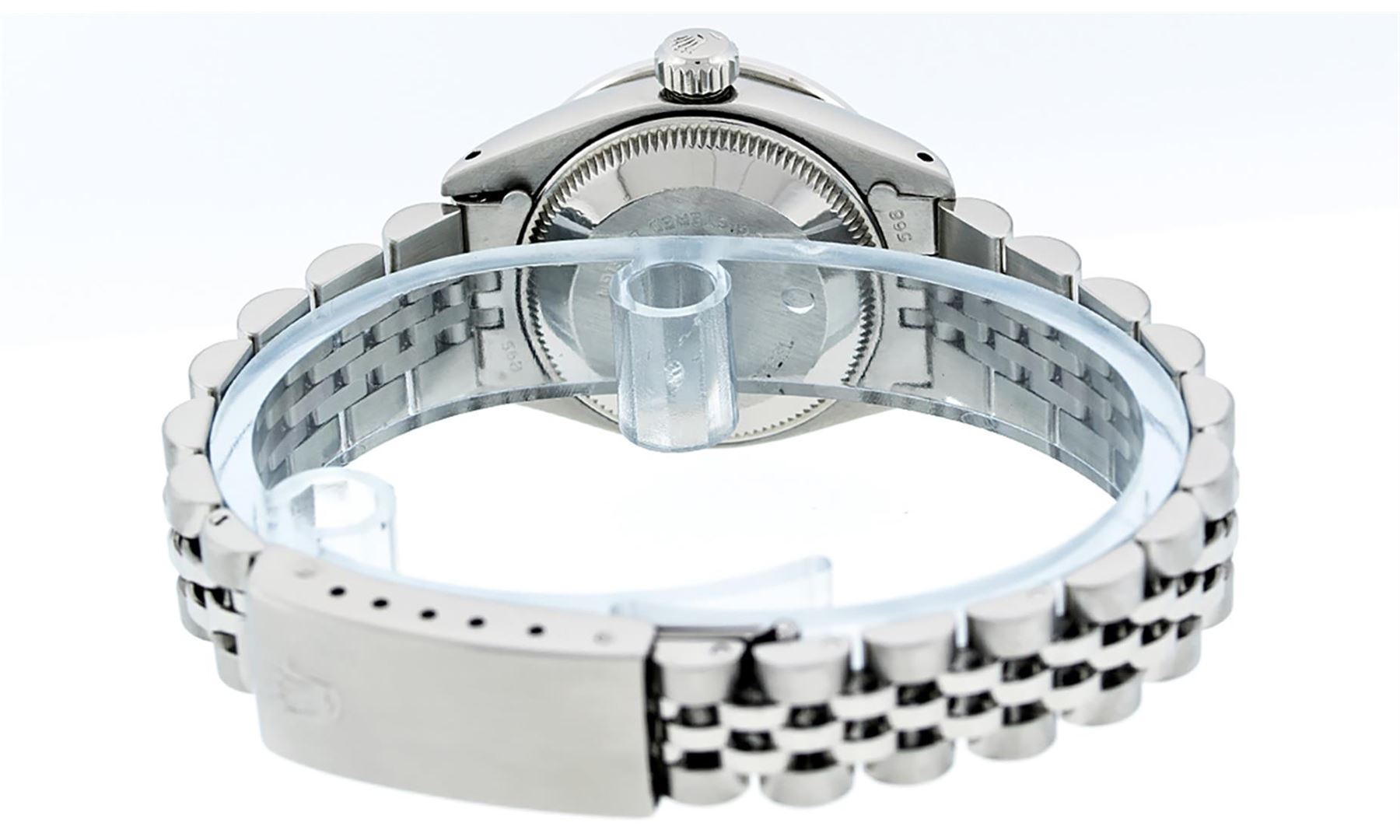 One Ladies Rolex Pre Owned Stainless Steel Rolex Wristwatch Polished Bright with Satin Finish, Serviced & Electronically Tested, Stainless Steel Case: 26mm, Stainless Steel Crown, Custom Bezel: New 18K White Gold Beadset Diamond Bezel, Diamond Count: 32 Diamonds. Custom Crystal: New Sapphire With Date Window. Custom Hands: New Luminescent Hands. Rolex Movement: Automatic Winding Movement 2035. Custom Dial: Custom Silver Dial With Added Diamond Hour Markers, Diamond Count: 10 Diamonds On Dial. Date Window: 3 O'Clock Position Date Display. Condition: G-6 Extra Fine. Rolex Bracelet: Stainless Steel Jubilee Band. Bright Polish & Satin Finish. 6.0 Inch Length, Adjustable. Standard Clasp, With Rolex Logo. This Watch Has Been Serviced Time Tested And Is In Excellent Condition It Is Free Of All Scratches And Dents.