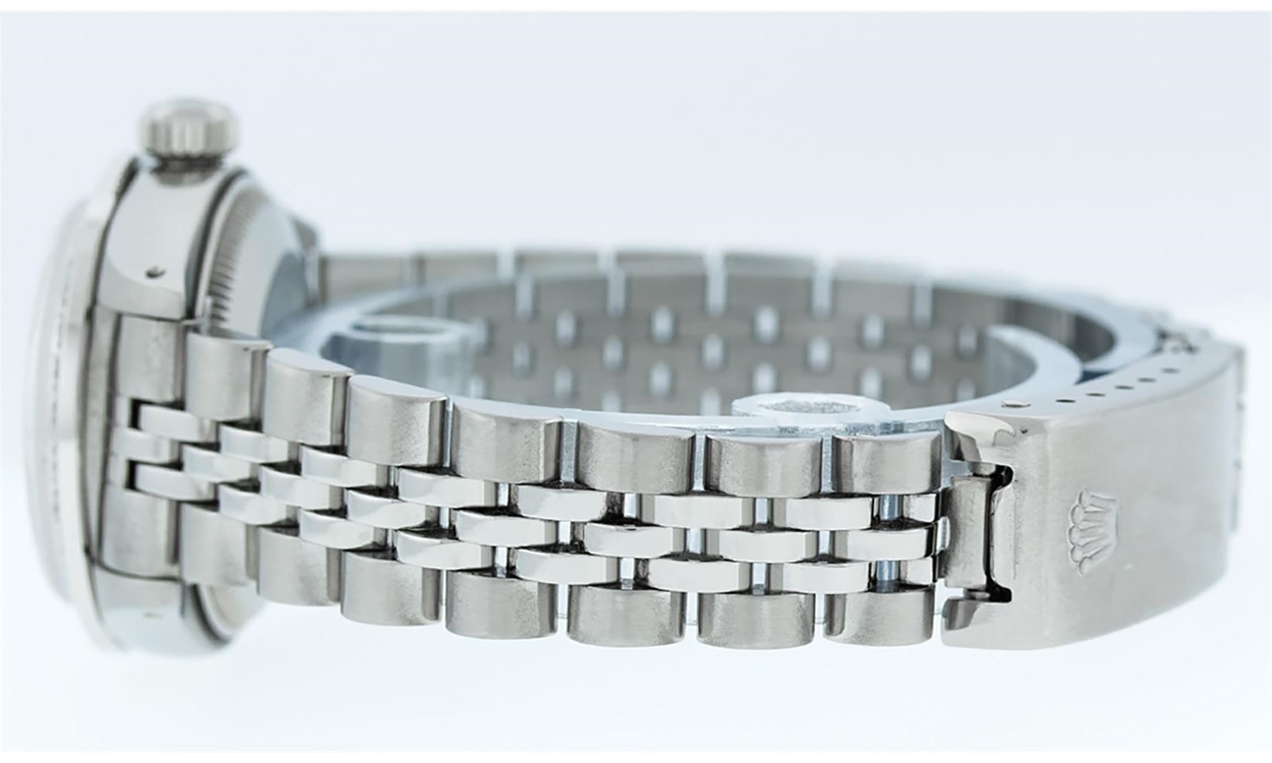 One Ladies Rolex Pre Owned Stainless Steel Rolex Wristwatch Polished Bright with Satin Finish, Serviced & Electronically Tested, Stainless Steel Case: 26mm, Stainless Steel Crown, Custom Bezel: New 18K White Gold Beadset Diamond Bezel, Diamond Count: 32 Diamonds. Custom Crystal: New Sapphire With Date Window. Custom Hands: New Luminescent Hands. Rolex Movement: Automatic Winding Movement 2035. Custom Dial: Custom Silver Dial With Added Diamond Hour Markers, Diamond Count: 10 Diamonds On Dial. Date Window: 3 O'Clock Position Date Display. Condition: G-6 Extra Fine. Rolex Bracelet: Stainless Steel Jubilee Band. Bright Polish & Satin Finish. 6.0 Inch Length, Adjustable. Standard Clasp, With Rolex Logo. This Watch Has Been Serviced Time Tested And Is In Excellent Condition It Is Free Of All Scratches And Dents.