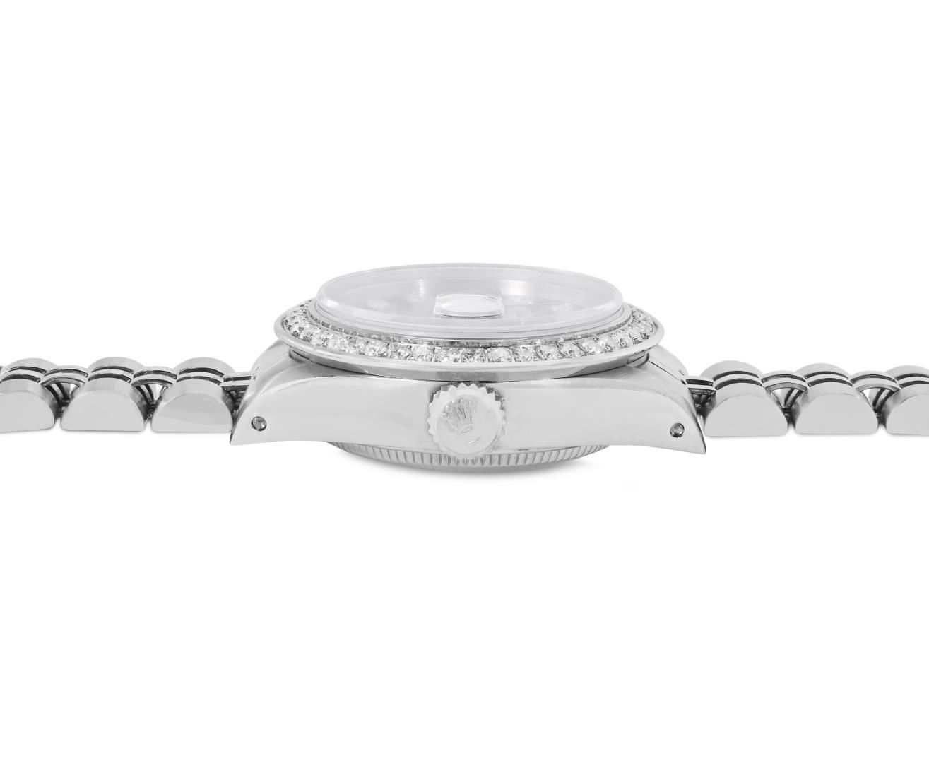 One Rolex Ladies Pre Owned Stainless Steel Date Wristwatch Polished Bright with Satin Finish, Serviced And Electronically Tested, Stainless Steel Case: 26mm, Stainless Steel Crown, Custom Bezel: New Stainless Steel Beadset Diamond Bezel, Diamond Count: 40 Diamonds. Custom Crystal: New Sapphire With Magnified Date Window. Custom Hands: New Solid Hands. Rolex Movement: Automatic Winding Movement 2035. Custom Dial: Custom Gray Dial With Added Diamond Hour Markers And Lumi Dots, Diamond Count: 10 Diamonds On Dial. Date Window: 3 O'Clock Position Date Display, Model: Date. Condition: G-6 Extra Fine. Rolex Bracelet: Stainless Steel Jubilee Band. Bright Polish And Satin Finish. 6.0 Inch Length, Adjustable. Standard Clasp, With Rolex Logo. This Watch Has Been Serviced And Time Tested. It Is In Excellent Condition, Free Of All Scratches And Dents.