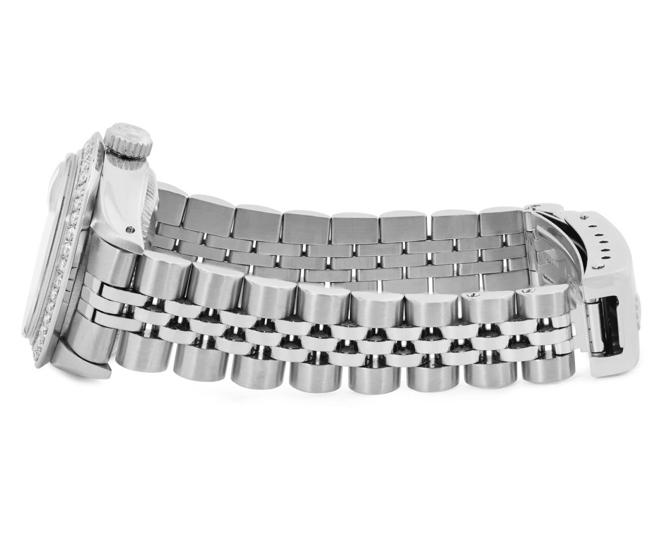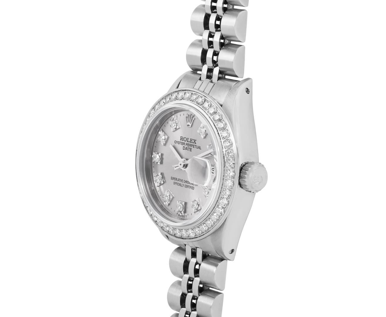 One Rolex Ladies Pre Owned Stainless Steel Date Wristwatch Polished Bright with Satin Finish, Serviced And Electronically Tested, Stainless Steel Case: 26mm, Stainless Steel Crown, Custom Bezel: New Stainless Steel Beadset Diamond Bezel, Diamond Count: 40 Diamonds. Custom Crystal: New Sapphire With Magnified Date Window. Custom Hands: New Solid Hands. Rolex Movement: Automatic Winding Movement 2035. Custom Dial: Custom Gray Dial With Added Diamond Hour Markers And Lumi Dots, Diamond Count: 10 Diamonds On Dial. Date Window: 3 O'Clock Position Date Display, Model: Date. Condition: G-6 Extra Fine. Rolex Bracelet: Stainless Steel Jubilee Band. Bright Polish And Satin Finish. 6.0 Inch Length, Adjustable. Standard Clasp, With Rolex Logo. This Watch Has Been Serviced And Time Tested. It Is In Excellent Condition, Free Of All Scratches And Dents.