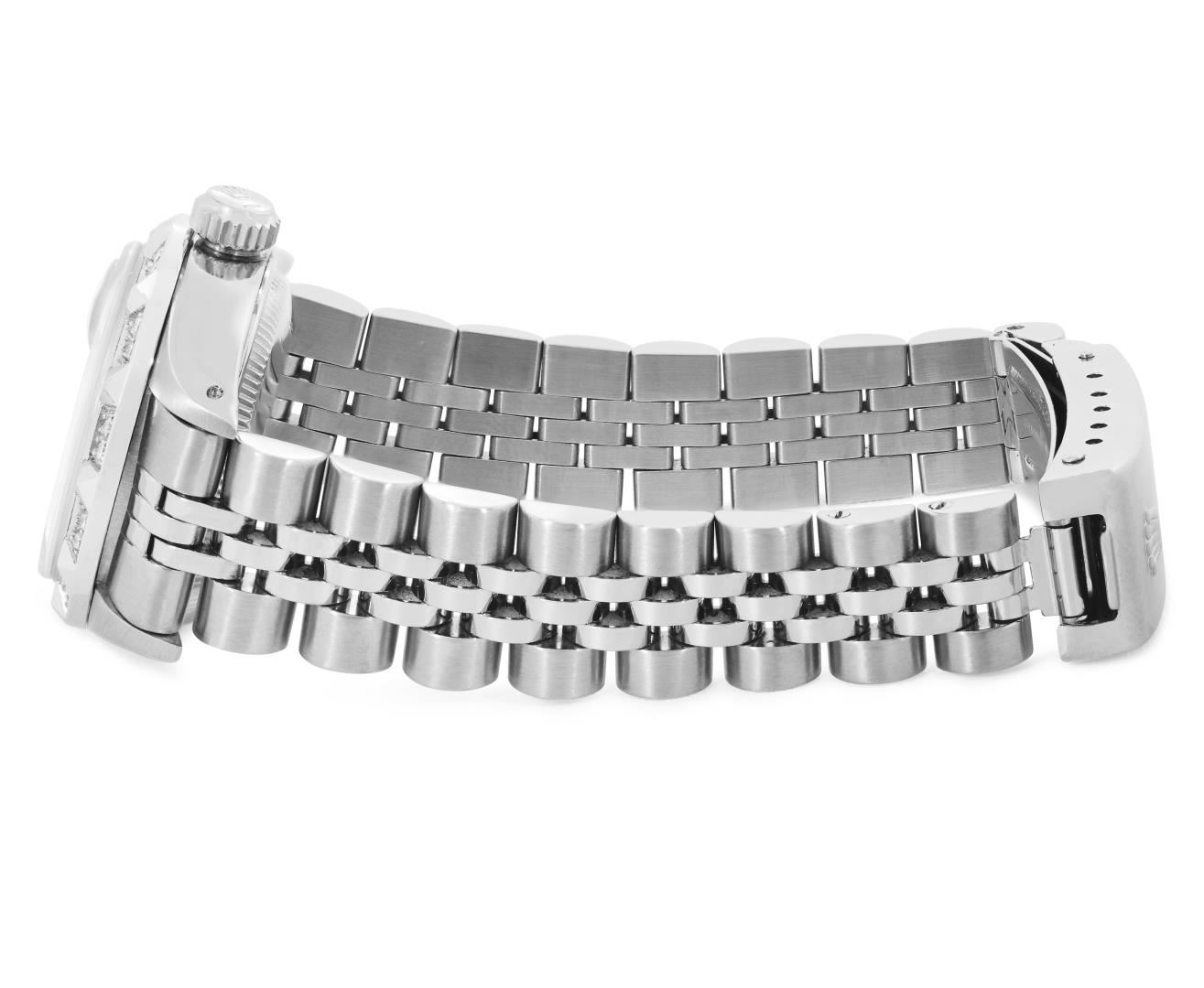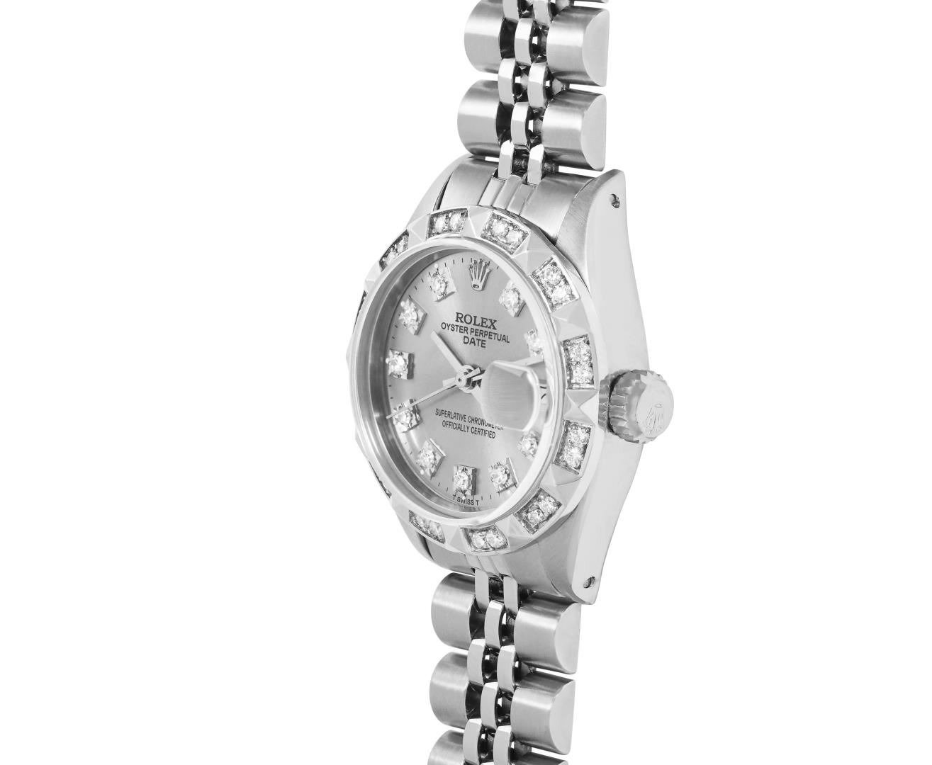 One Rolex Ladies Pre Owned Stainless Steel Date Wristwatch Polished Bright with Satin Finish, Serviced And Electronically Tested, Stainless Steel Case: 26mm, Stainless Steel Crown, Custom Bezel: New 18K White Gold Pyramid Diamond Bezel, Diamond Count: 24 Diamonds On Bezel. Custom Crystal: New Sapphire With Magnified Date Window. Custom Hands: New Solid Hands. Rolex Movement: Automatic Winding Movement 2035. Custom Dial: Custom Silver Dial With Added Diamond Hour Markers Dash Track, and Lumi Dots. Date Window: 3 O'Clock Position Date Display, Model: Date. Condition: G-6 Extra Fine. Rolex Bracelet: Stainless Steel Jubilee Band. Bright Polish And Satin Finish. 6.0 Inch Length, Adjustable. Standard Clasp, With Rolex Logo. This Watch Has Been Serviced Time Tested And Is In Excellent Condition. It Is Free Of All Scratches And Dents.