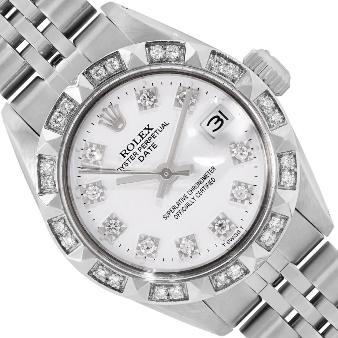 One Rolex Ladies Pre Owned Stainless Steel Date Wristwatch Polished Bright with Satin Finish, Serviced And Electronically Tested, Stainless Steel Case: 26mm, Stainless Steel Crown, Custom Bezel: New 18K White Gold Pyramid Diamond Bezel, Diamond Count: 24 Diamonds On Bezel. Custom Crystal: New Sapphire With Magnified Date Window. Custom Hands: New Non Luminescent Hands. Rolex Movement: Automatic Winding Movement 2030. Custom Dial: Custom White Dial With Added Diamond Hour Markers Dash Track, and Lumi Dots. Date Window: 3 O'Clock Position Date Display, Model: Date. Condition: G-6 Extra Fine. Rolex Bracelet: Stainless Steel Jubilee Band. Bright Polish And Satin Finish. 6.0 Inch Length, Adjustable. Standard Clasp, With Rolex Logo. This Watch Has Been Serviced Time Tested And Is In Excellent Condition. It Is Free Of All Scratches And Dents.