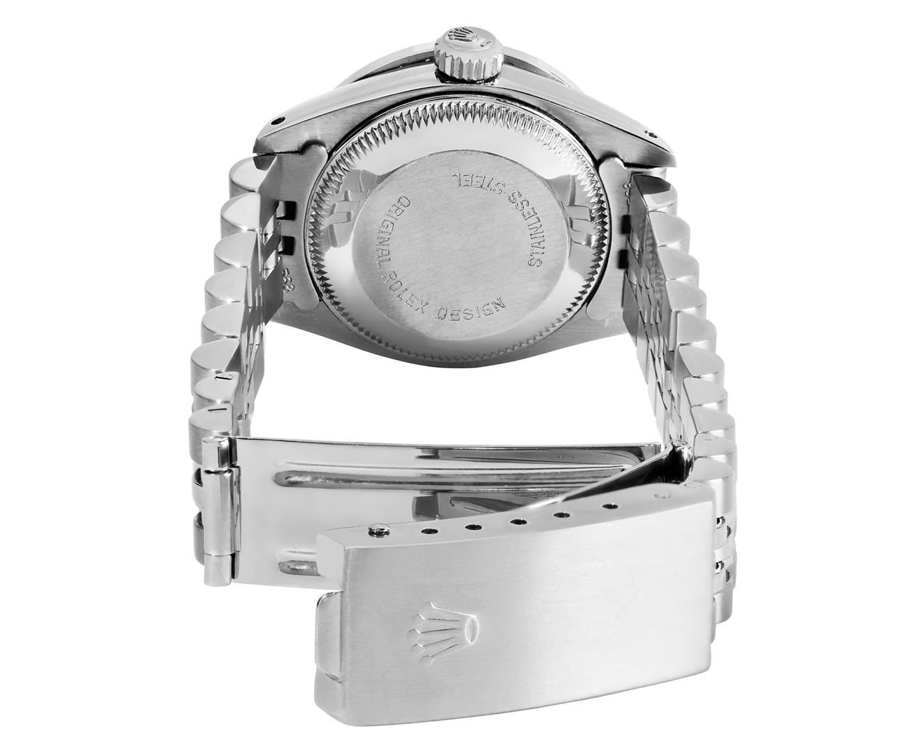 One Rolex Ladies Pre Owned Stainless Steel Date Wristwatch Polished Bright with Satin Finish, Serviced & Electronically Tested, Stainless Steel Case: 26mm, Stainless Steel Crown, Custom Bezel: New 18K White Gold Sapphire Beadset Diamond Bezel, Diamond + Gem Count: 36 Diamonds + 4 Sapphires, Clarity: SI-VS, Color: G to H. Custom Crystal: New Sapphire With Magnified Date Window. Custom Hands: New Luminescent Hands. Rolex Movement: Automatic Winding Movement 2030. Rolex Dial: Factory Silver Dial With Index Hour Markers Dash Track, and Lumi Dots. Date Window: 3 O'Clock Position Date Display, Model: Date. Condition: G-6 Extra Fine. Rolex Bracelet: Stainless Steel Jubilee Band. Bright Polish & Satin Finish. 6.0 Inch Length, Adjustable. Standard Clasp, With Rolex Logo. This Watch Has Been Serviced Time Tested And Is In Excellent Condition. It Is Free Of All Scratches And Dents. This Watch Comes With A Rolex Box.