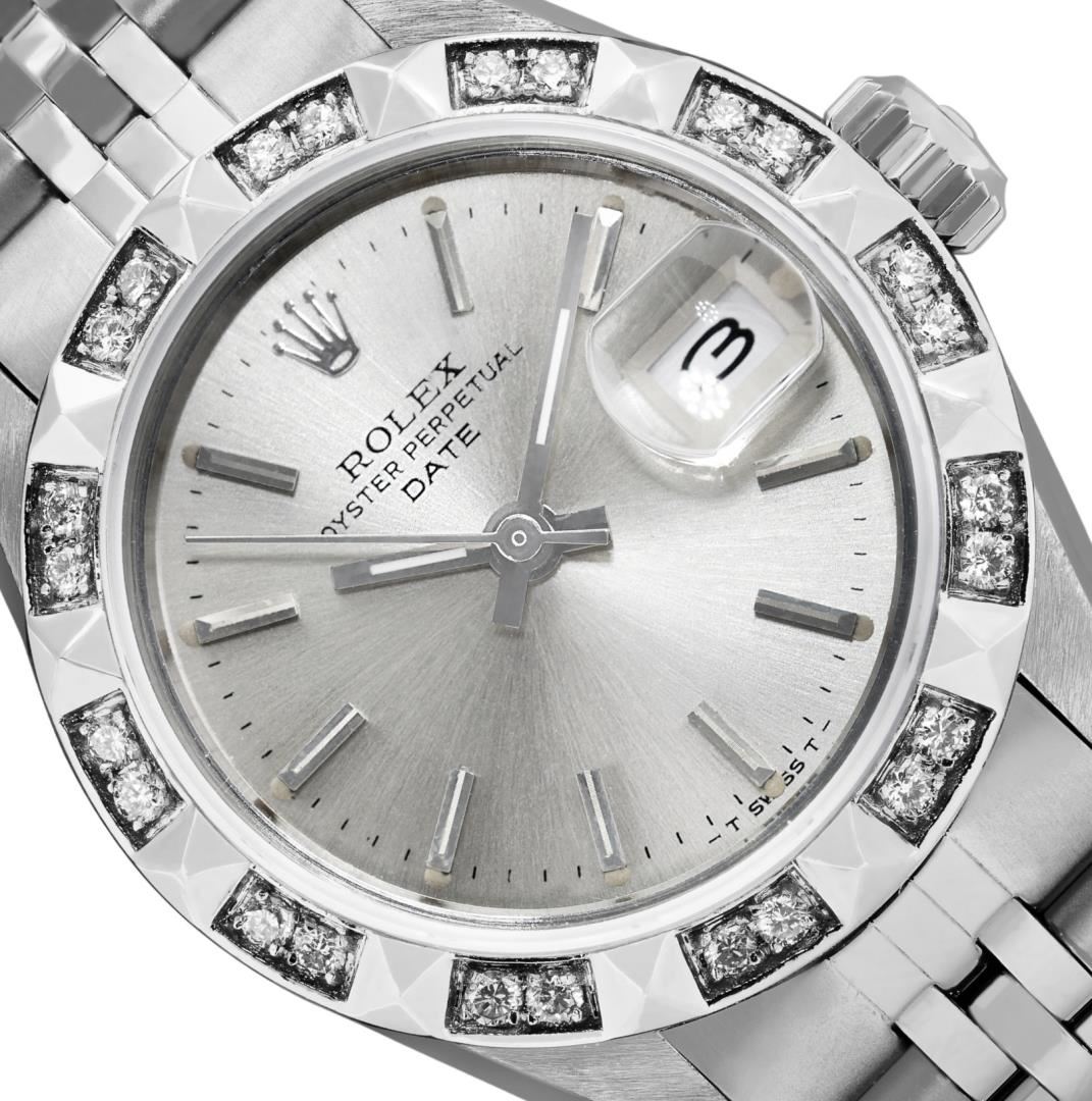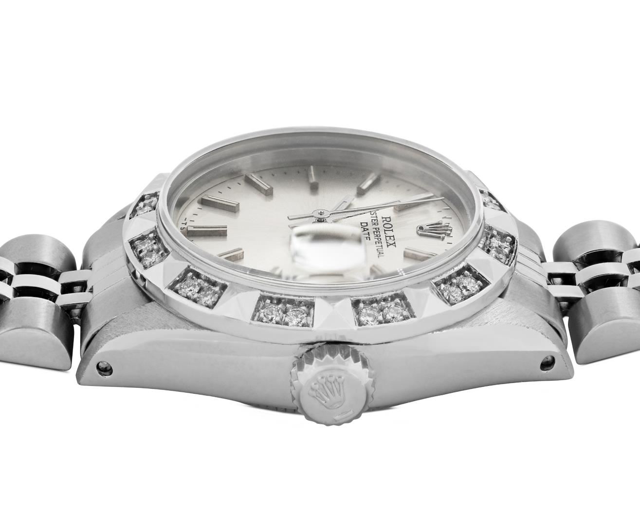 One Rolex Ladies Pre Owned Stainless Steel Date Wristwatch Polished Bright with Satin Finish, Serviced & Electronically Tested, Stainless Steel Case: 26mm, Stainless Steel Crown, Custom Bezel: New 18K White Gold Pyramid Diamond Bezel, Diamond Count: 24 Diamonds On Bezel. Custom Crystal: New Sapphire With Magnified Date Window. Custom Hands: New Luminescent Hands. Rolex Movement: Automatic Winding Movement 2030. Rolex Dial: Factory Silver Dial With Index Hour Markers And Lumi Dots. Date Window: 3 O'Clock Position Date Display, Model: Date. Condition: G-6 Extra Fine. Rolex Bracelet: Stainless Steel Jubilee Band. Bright Polish & Satin Finish. 6.0 Inch Length, Adjustable. Standard Clasp, With Rolex Logo. This Watch Has Been Serviced Time Tested And Is In Excellent Condition. It Is Free Of All Scratches And Dents.
