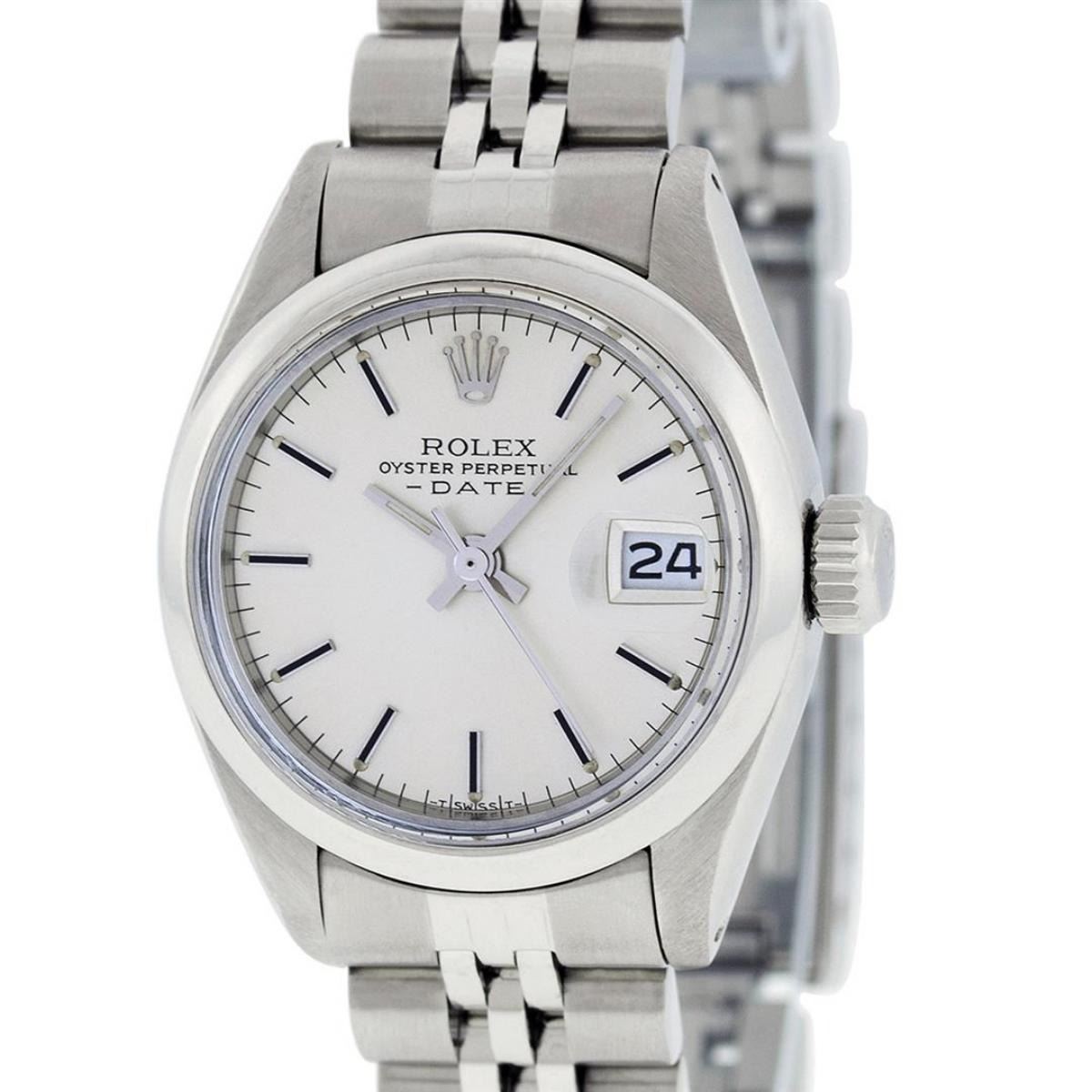 One Ladies Stainless Steel Rolex Datejust Polished Bright with Satin Finish, Serviced & Electronically Tested, Stainless Steel Case: 26mm, Stainless Steel Crown, Bezel: Stainless Steel Smooth Bezel. Custom Crystal: New Acrylic Cyclops Lens. Custom Hands: New Luminescent Hands. Movement: Automatic Winding Movement . Dial: Silver Index Dial With Luminescent Dots. Date Window: 3 O'Clock Position Date Display, Model: Datejust. Condition: G-6 Extra Fine. Bracelet: Stainless Steel Jubilee Band. Bright Polish & Satin Finish. 6.0 Inch Length, Adjustable. Standard Clasp, With Rolex Logo. This Watch Has Been Serviced Time Tested And Is In Excellent Condition It Is Free Of All Scratches And Dents.