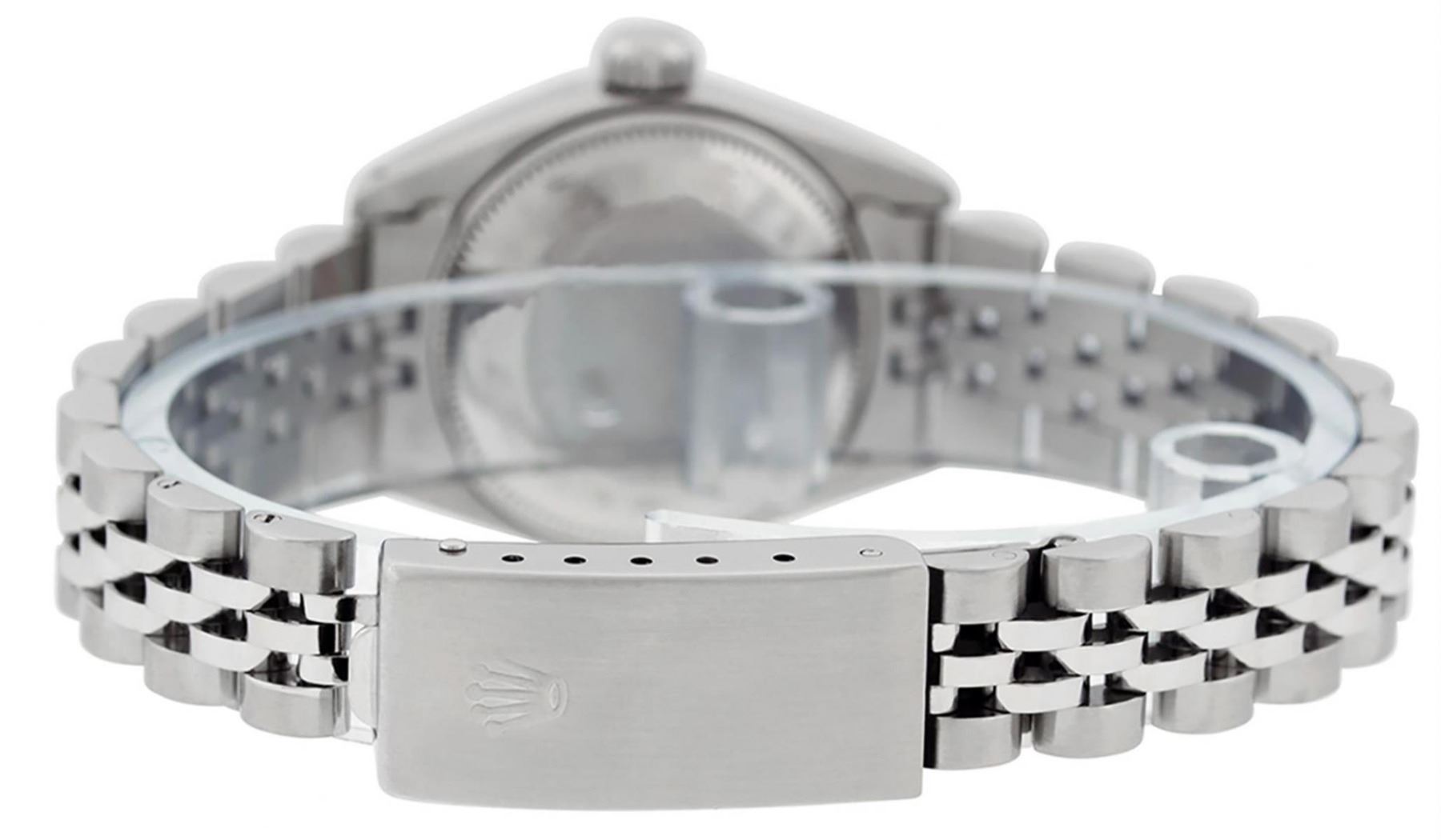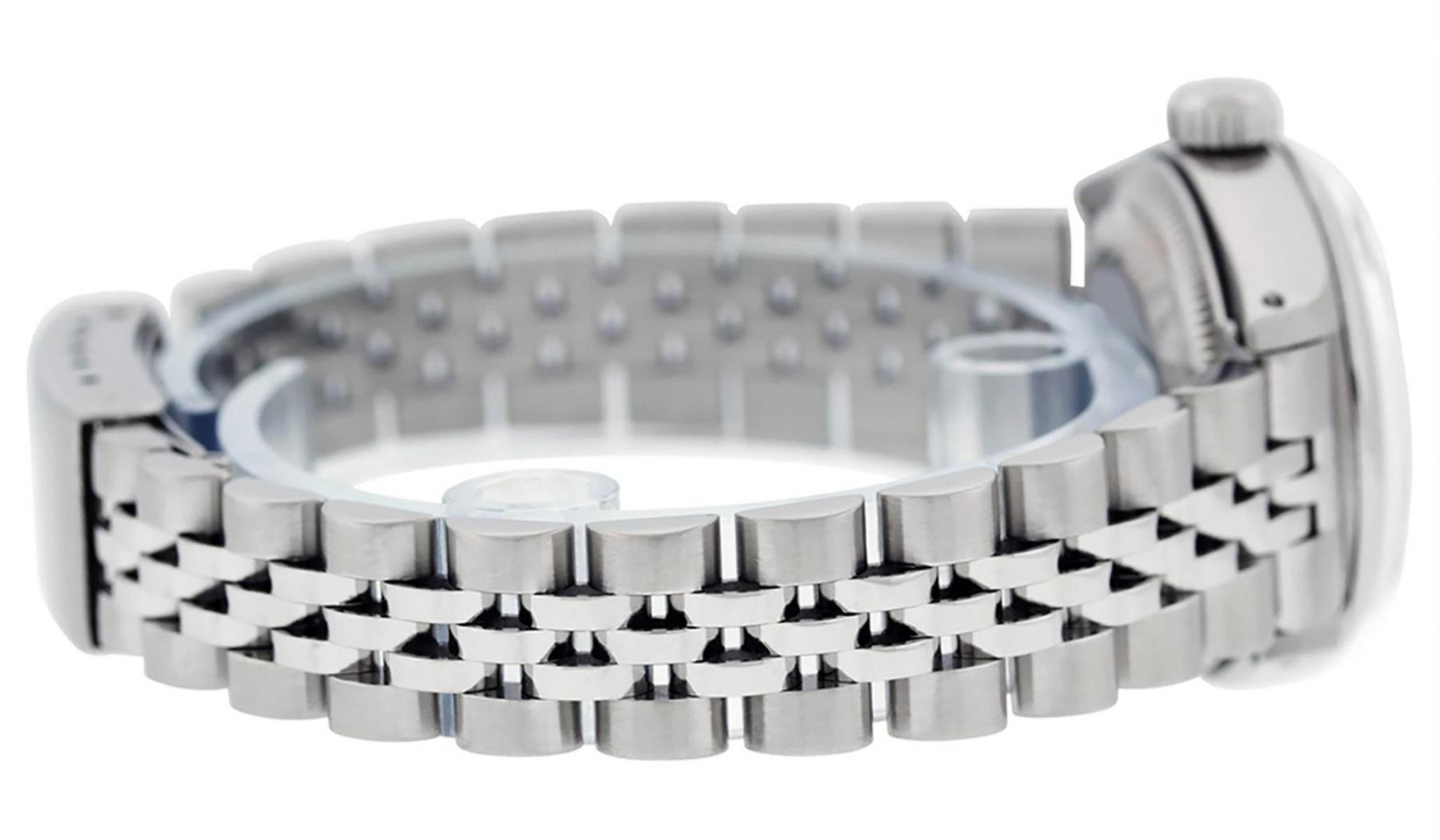 One Ladies Pre Owned Stainless Steel Rolex Datejust Polished Bright with Satin Finish, Serviced & Electronically Tested, Rolex Stainless Steel Case: 26mm, Rolex Stainless Steel Crown, Rolex Bezel: Stainless Steel Smooth Bezel. Custom Crystal: New Acrylic Cyclops Lens. Custom Hands: New Luminescent Hands. Rolex Movement: Automatic Winding Movement. Rolex Dial: Silver Index Dial With Luminescent Dots. Date Window: 3 O'Clock Position Date Display, Model: Datejust. Condition: G-6 Extra Fine. Rolex Bracelet: Stainless Steel Jubilee Band. Bright Polish & Satin Finish. 6.0 Inch Length, Adjustable. Standard Clasp, With Rolex Logo. This Watch Has Been Serviced Time Tested And Is In Excellent Condition It Is Free Of All Scratches And Dents.
