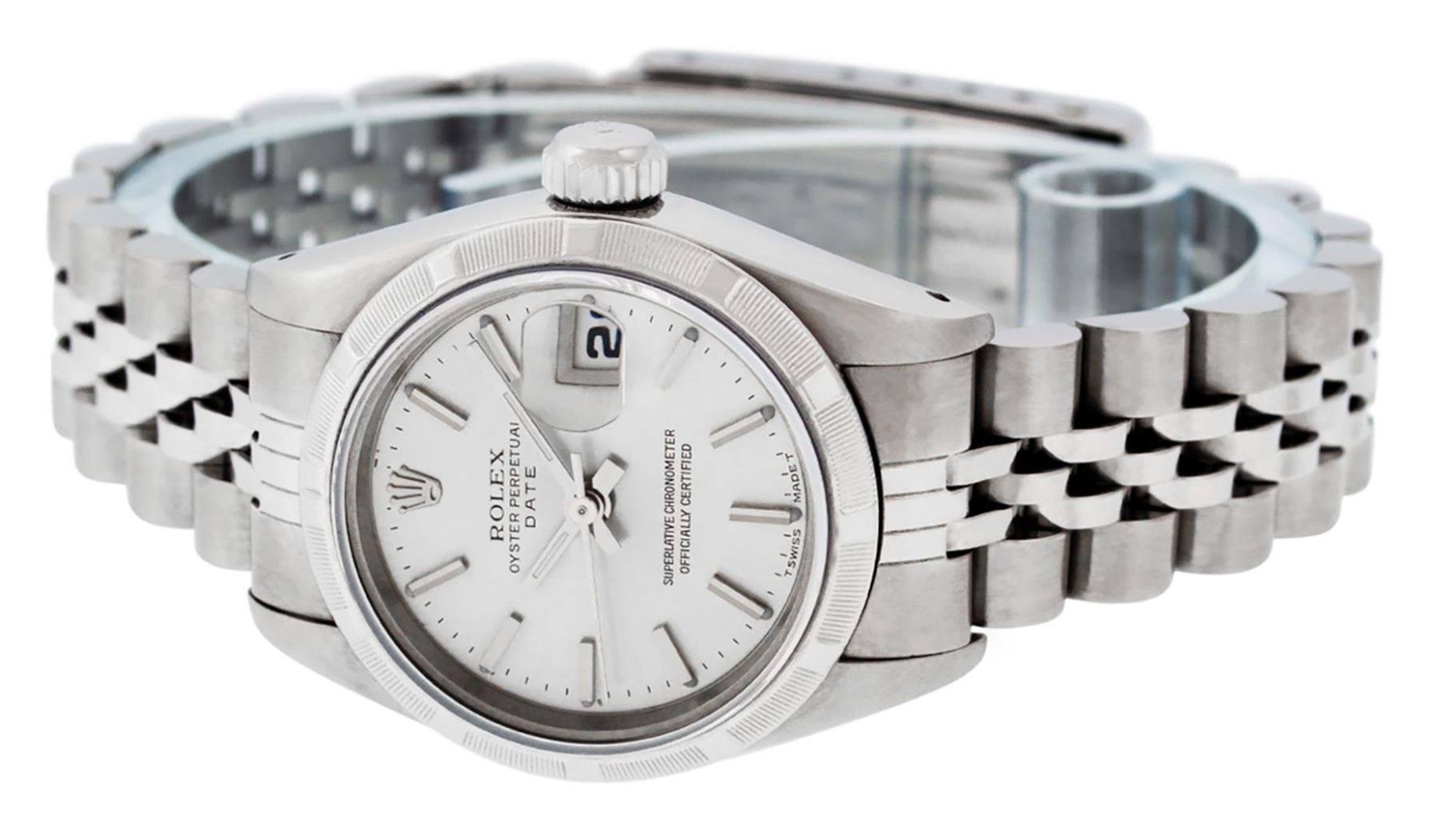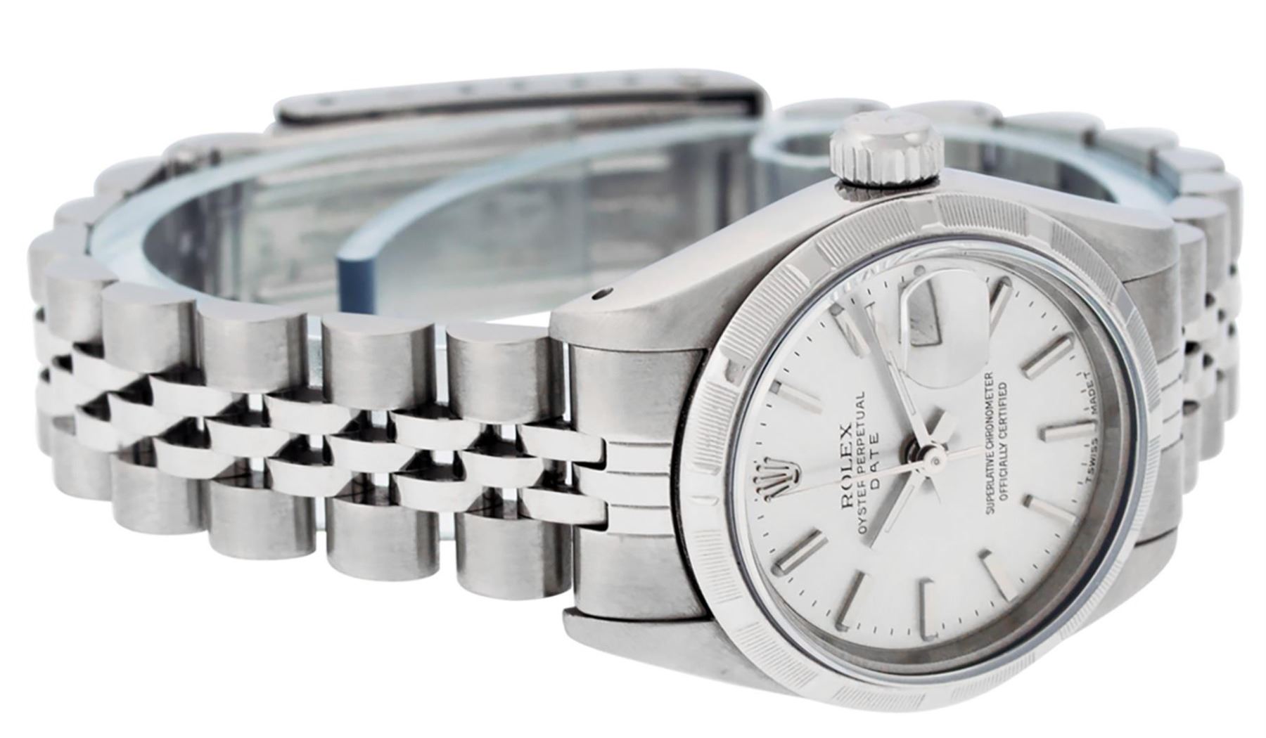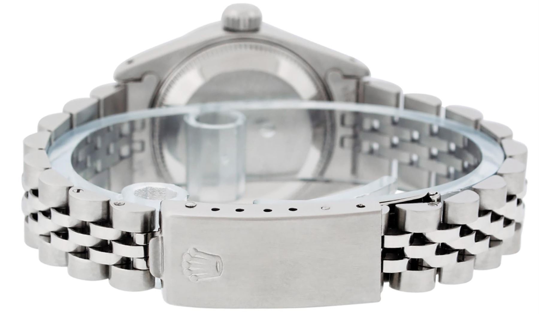 One Ladies Pre Owned Stainless Steel Rolex Datejust Polished Bright with Satin Finish, Serviced & Electronically Tested, Stainless Steel Case: 26mm, Stainless Steel Crown, Bezel: Stainless Steel Bezel. Custom Crystal: New Plastic With Date Window. Custom Hands: New Luminescent Hands. Rolex Movement: Automatic Winding Movement. Rolex Dial: Silver Index Dial. Date Window: 3 O'Clock Position Date Display, Model: Datejust. Condition: G-6 Extra Fine. Rolex Bracelet: Stainless Steel Jubilee Band. Bright Polish & Satin Finish. 6.0 Inch Length, Adjustable. Standard Clasp, With Rolex Logo. This Watch Has Been Serviced Time Tested And Is In Excellent Condition It Is Free Of All Scratches And Dents.