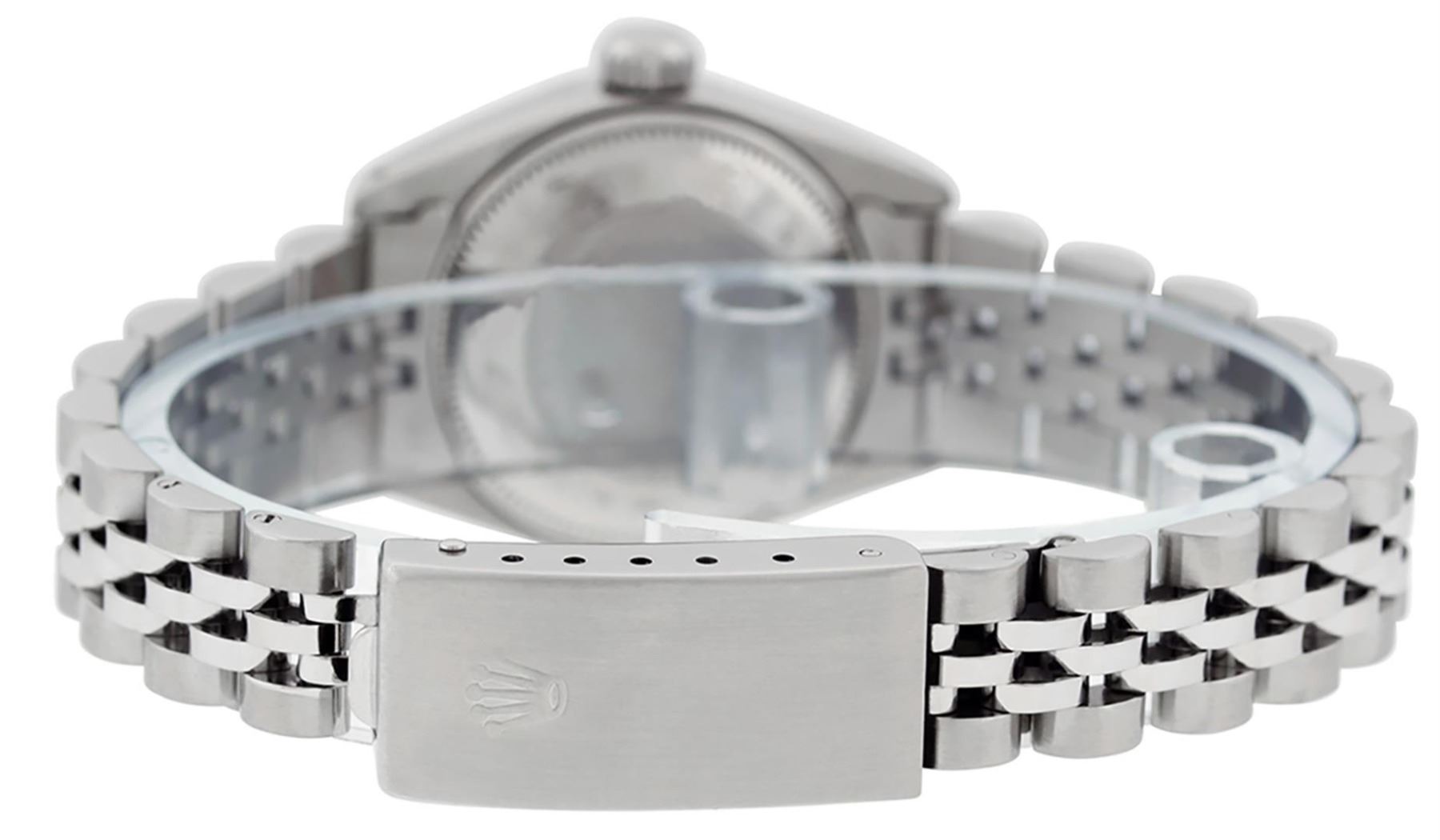 One Ladies Pre Owned Stainless Steel Rolex Date Polished Bright with Satin Finish, Serviced & Electronically Tested, Rolex Stainless Steel Case: 26mm, Rolex Stainless Steel Crown, Rolex Bezel: Stainless Steel Smooth Bezel. Custom Crystal: New Acrylic With Magnified Date Window. Custom Hands: New Luminescent Hands. Rolex Movement: Automatic Winding Movement. Rolex Dial: Silver Index Dial With Luminescent Dots And Dash Track. Date Window: 3 O'Clock Position Date Display, Model: Date. Condition: G-6 Extra Fine. Rolex Bracelet: Stainless Steel Jubilee Band. Bright Polish & Satin Finish. 6.0 Inch Length, Adjustable. Standard Clasp, With Rolex Logo. This Watch Has Been Serviced Time Tested And Is In Excellent Condition It Is Free Of All Scratches And Dents.