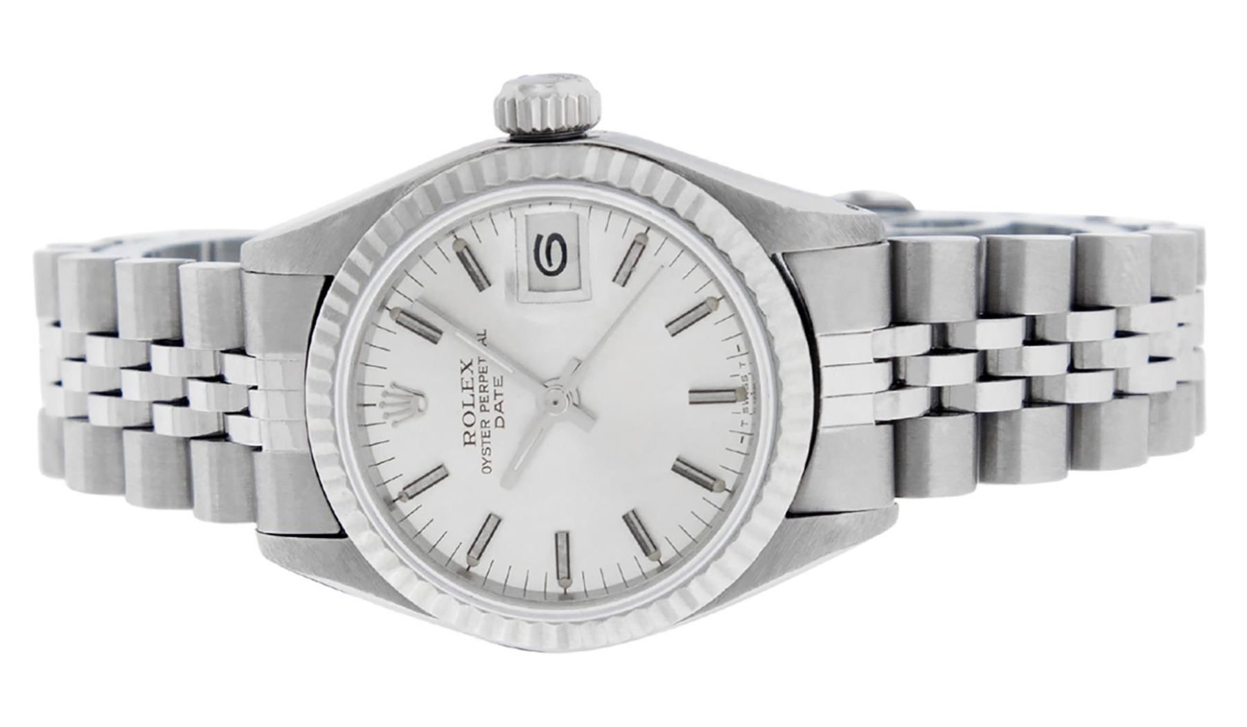 One Ladies Pre Owned Stainless Steel Rolex Datejust Polished Bright with Satin Finish, Serviced & Electronically Tested, Rolex Stainless Steel Case: 26mm, Rolex Stainless Steel Crown, Rolex Bezel: 14K White Gold Bezel. Custom Crystal: New Acrylic With Magnified Date Window. Custom Hands: New Luminescent Hands. Rolex Movement: Automatic Winding Movement. Rolex Dial: Silver Index With Dash Track. Date Window: 3 O'Clock Position Date Display, Model: Datejust. Condition: G-6 Extra Fine. Rolex Bracelet: Stainless Steel Jubilee Band. Bright Polish & Satin Finish. 6.0 Inch Length, Adjustable. Standard Clasp, With Rolex Logo. This Watch Has Been Serviced Time Tested And Is In Excellent Condition It Is Free Of All Scratches And Dents.