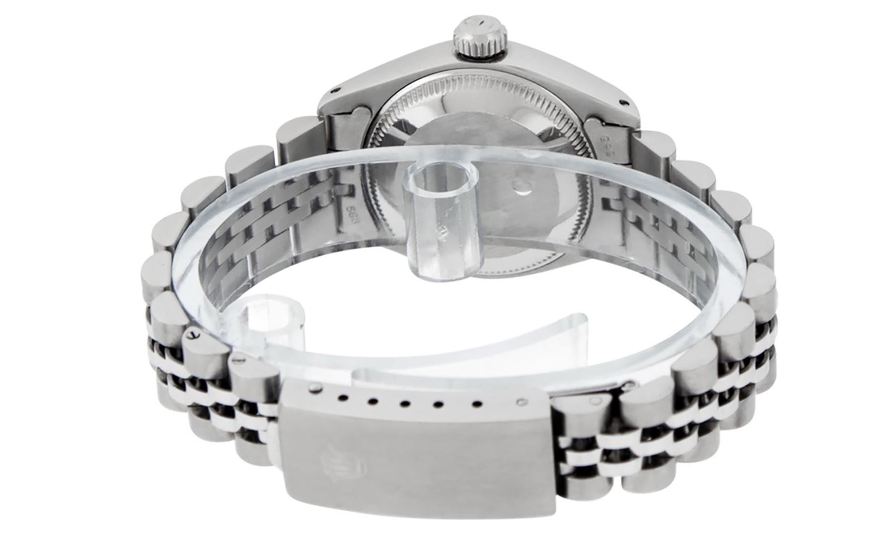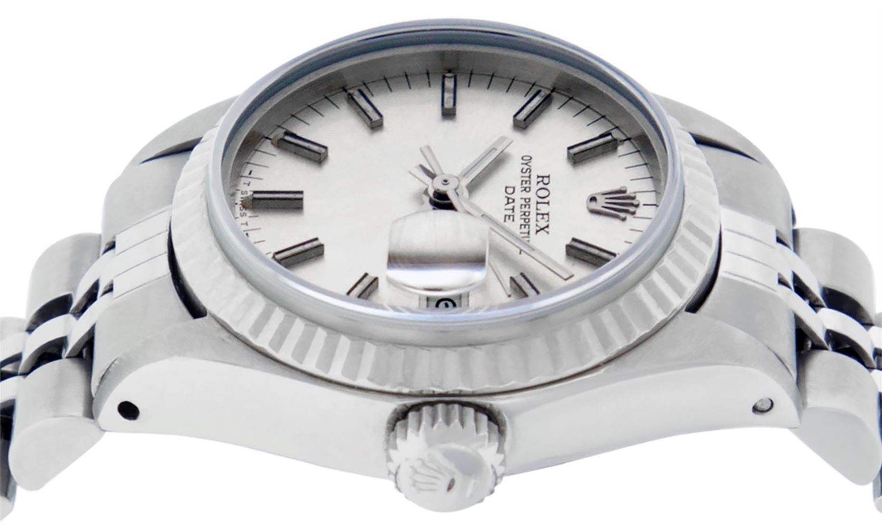 One Ladies Pre Owned Stainless Steel Rolex Datejust Polished Bright with Satin Finish, Serviced & Electronically Tested, Rolex Stainless Steel Case: 26mm, Rolex Stainless Steel Crown, Rolex Bezel: 14K White Gold Bezel. Custom Crystal: New Acrylic With Magnified Date Window. Custom Hands: New Luminescent Hands. Rolex Movement: Automatic Winding Movement. Rolex Dial: Silver Index With Dash Track. Date Window: 3 O'Clock Position Date Display, Model: Datejust. Condition: G-6 Extra Fine. Rolex Bracelet: Stainless Steel Jubilee Band. Bright Polish & Satin Finish. 6.0 Inch Length, Adjustable. Standard Clasp, With Rolex Logo. This Watch Has Been Serviced Time Tested And Is In Excellent Condition It Is Free Of All Scratches And Dents.