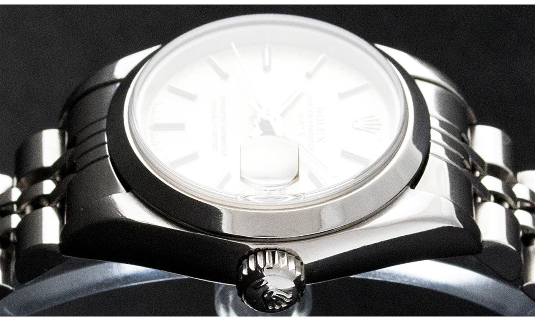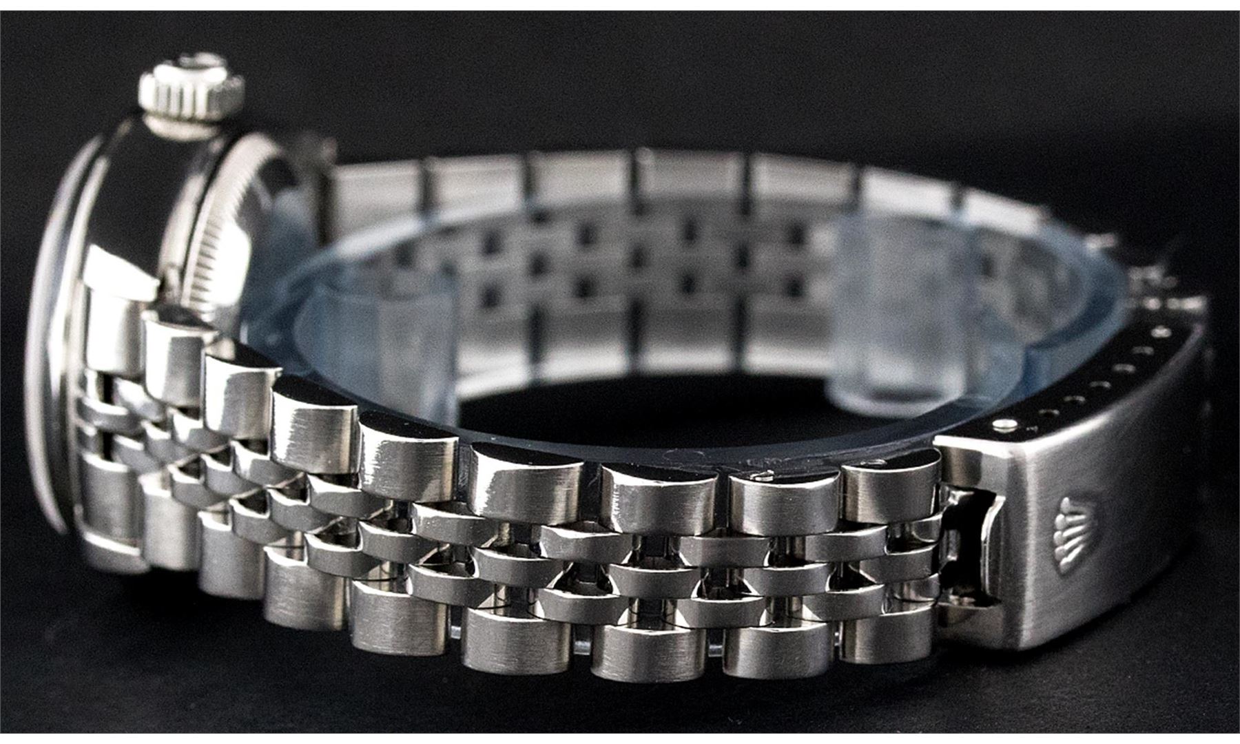 One Ladies Pre Owned Quickset Stainless Steel Rolex Datejust Polished Bright with Satin Finish, Serviced & Electronically Tested, Rolex Stainless Steel Case: 26mm, Rolex Stainless Steel Crown, Rolex Bezel: Stainless Steel Smooth Bezel. Rolex Crystal: Scratch Resistant Sapphire Cyclops Lens. Rolex Hands: Luminescent Hands. Rolex Movement: Automatic Winding Movement. Rolex Dial: Silver Index Dial With Luminescent Dots & Dash Track. Date Window: 3 O'Clock Position Date Display, Model: Quickset Datejust. Condition: G-6 Extra Fine. Rolex Bracelet: Stainless Steel Jubilee Band. Bright Polish & Satin Finish. 6.0 Inch Length, Adjustable. Standard Clasp, With Rolex Logo. This Watch Has Been Serviced Time Tested And Is In Excellent Condition It Is Free Of All Scratches And Dents.