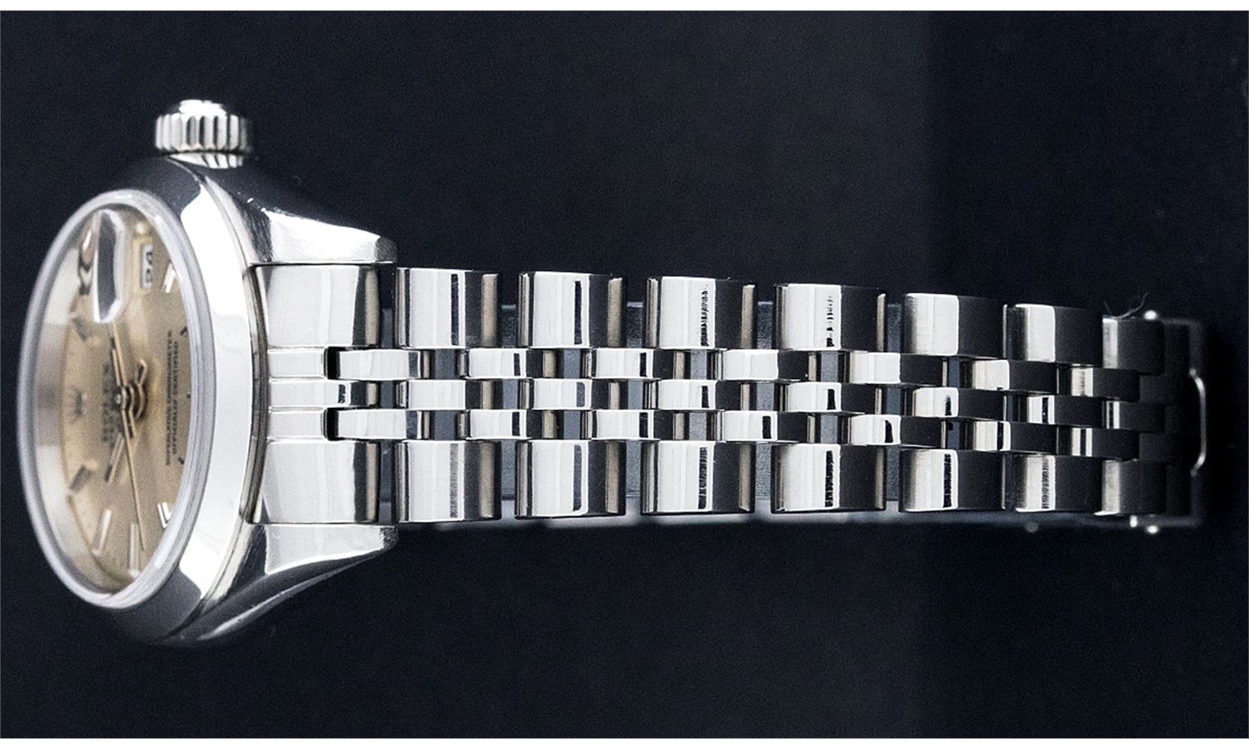 One Ladies Pre Owned Quickset Stainless Steel Rolex Datejust Polished Bright with Satin Finish, Serviced & Electronically Tested, Rolex Stainless Steel Case: 26mm, Rolex Stainless Steel Crown, Rolex Bezel: Stainless Steel Smooth Bezel. Rolex Crystal: Scratch Resistant Sapphire Cyclops Lens. Rolex Hands: Luminescent Hands. Rolex Movement: Automatic Winding Movement. Rolex Dial: Silver Index Dial With Luminescent Dots & Dash Track. Date Window: 3 O'Clock Position Date Display, Model: Quickset Datejust. Condition: G-6 Extra Fine. Rolex Bracelet: Stainless Steel Jubilee Band. Bright Polish & Satin Finish. 6.0 Inch Length, Adjustable. Standard Clasp, With Rolex Logo. This Watch Has Been Serviced Time Tested And Is In Excellent Condition It Is Free Of All Scratches And Dents.