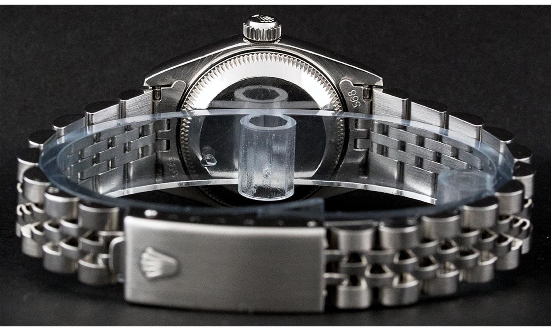 One Ladies Quickset Stainless Steel Rolex Datejust Polished Bright with Satin Finish, Serviced & Electronically Tested, Stainless Steel Case: 26mm, Stainless Steel Crown, Bezel: Stainless Steel Smooth Bezel. Custom Crystal: New Scratch Resistant Sapphire Cyclops Lens. Custom Hands: New Luminescent Hands. Movement: Automatic Winding Movement. Dial: Silver Index Dial With Luminescent Dots & Dash Track. Date Window: 3 O'Clock Position Date Display, Model: Quickset Datejust. Condition: G-6 Extra Fine. Bracelet: Stainless Steel Jubilee Band. Bright Polish & Satin Finish. 6.0 Inch Length, Adjustable. Standard Clasp, With Rolex Logo. This Watch Has Been Serviced Time Tested And Is In Excellent Condition It Is Free Of All Scratches And Dents.