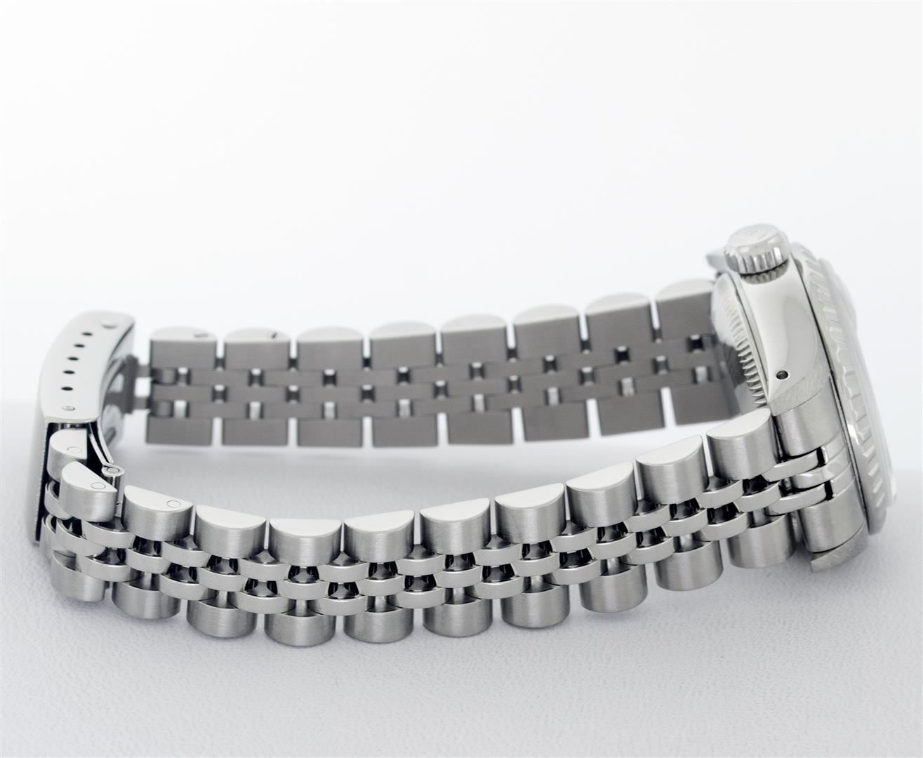 One Ladies Pre Owned Quickset Stainless Steel Rolex Datejust Polished Bright with Satin Finish, Serviced & Electronically Tested, Rolex Stainless Steel Case: 26mm, Rolex Stainless Steel Crown, Rolex Bezel: Stainless Steel Engine Turn Bezel. Custom Crystal: Sapphire With Magnified Date Window. Hands: Luminescent Hands. Rolex Movement: Quickset Automatic Winding Movement. Rolex Dial: Silver Index Dial With Luminescent Dots & Dash Track. Date Window: 3 O'Clock Position Date Display, Model: Sapphire Quickset Datejust Caliber 2130. Condition: G-6 Extra Fine. Rolex Bracelet: Stainless Steel Jubilee Band. Bright Polish & Satin Finish. 6.0 Inch Length, Adjustable. Standard Clasp, With Rolex Logo. This Watch Has Been Serviced Time Tested And Is In Excellent Condition It Is Free Of All Scratches And Dents.