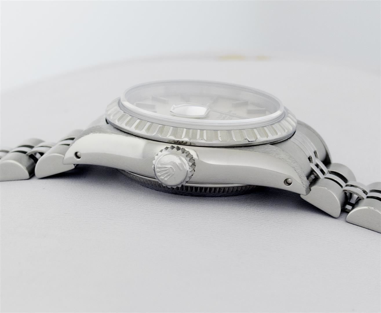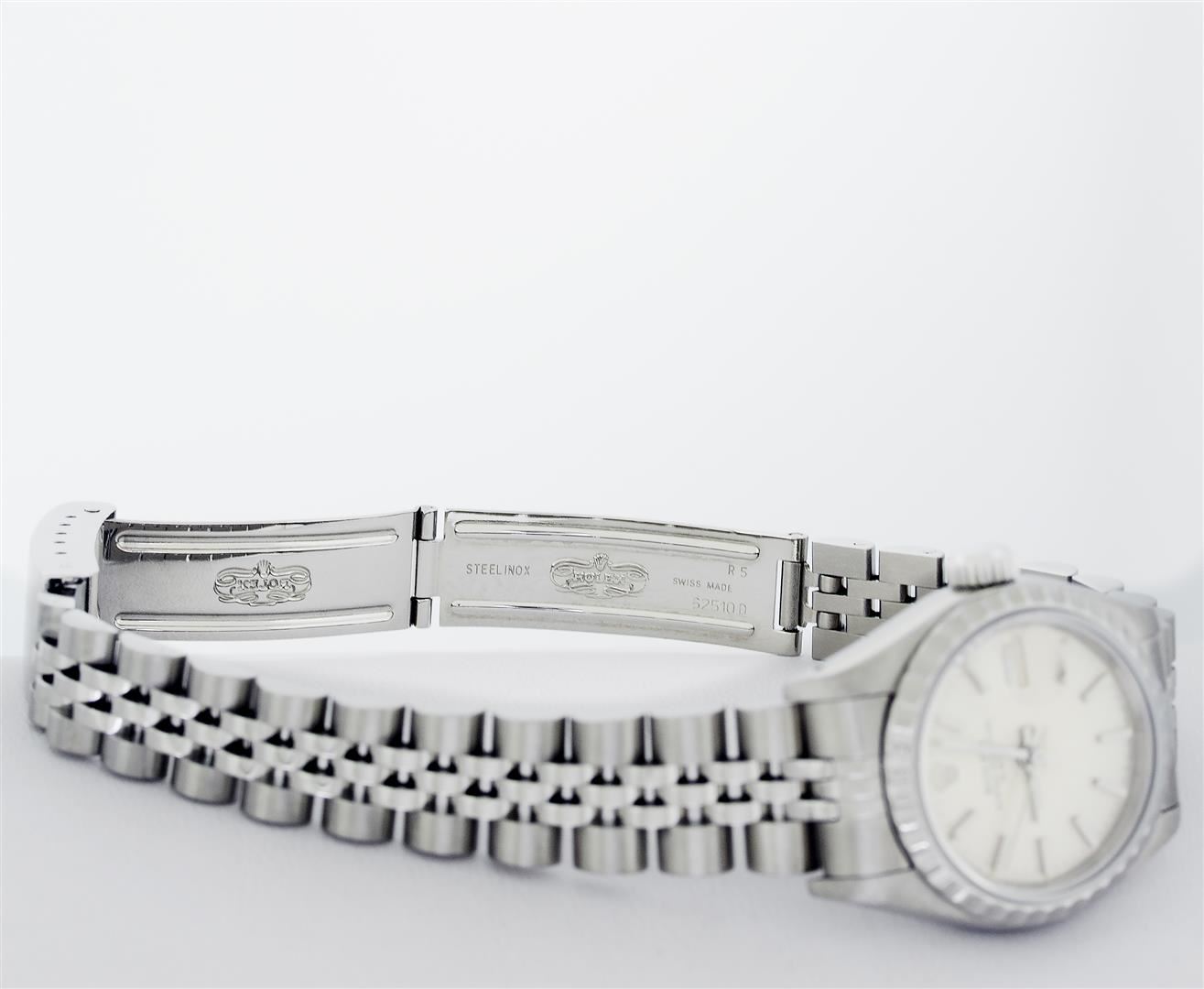 One Ladies Pre Owned Quickset Stainless Steel Rolex Datejust Polished Bright with Satin Finish, Serviced & Electronically Tested, Rolex Stainless Steel Case: 26mm, Rolex Stainless Steel Crown, Rolex Bezel: Stainless Steel Engine Turn Bezel. Custom Crystal: Sapphire With Magnified Date Window. Hands: Luminescent Hands. Rolex Movement: Quickset Automatic Winding Movement. Rolex Dial: Silver Index Dial With Luminescent Dots & Dash Track. Date Window: 3 O'Clock Position Date Display, Model: Sapphire Quickset Datejust Caliber 2130. Condition: G-6 Extra Fine. Rolex Bracelet: Stainless Steel Jubilee Band. Bright Polish & Satin Finish. 6.0 Inch Length, Adjustable. Standard Clasp, With Rolex Logo. This Watch Has Been Serviced Time Tested And Is In Excellent Condition It Is Free Of All Scratches And Dents.