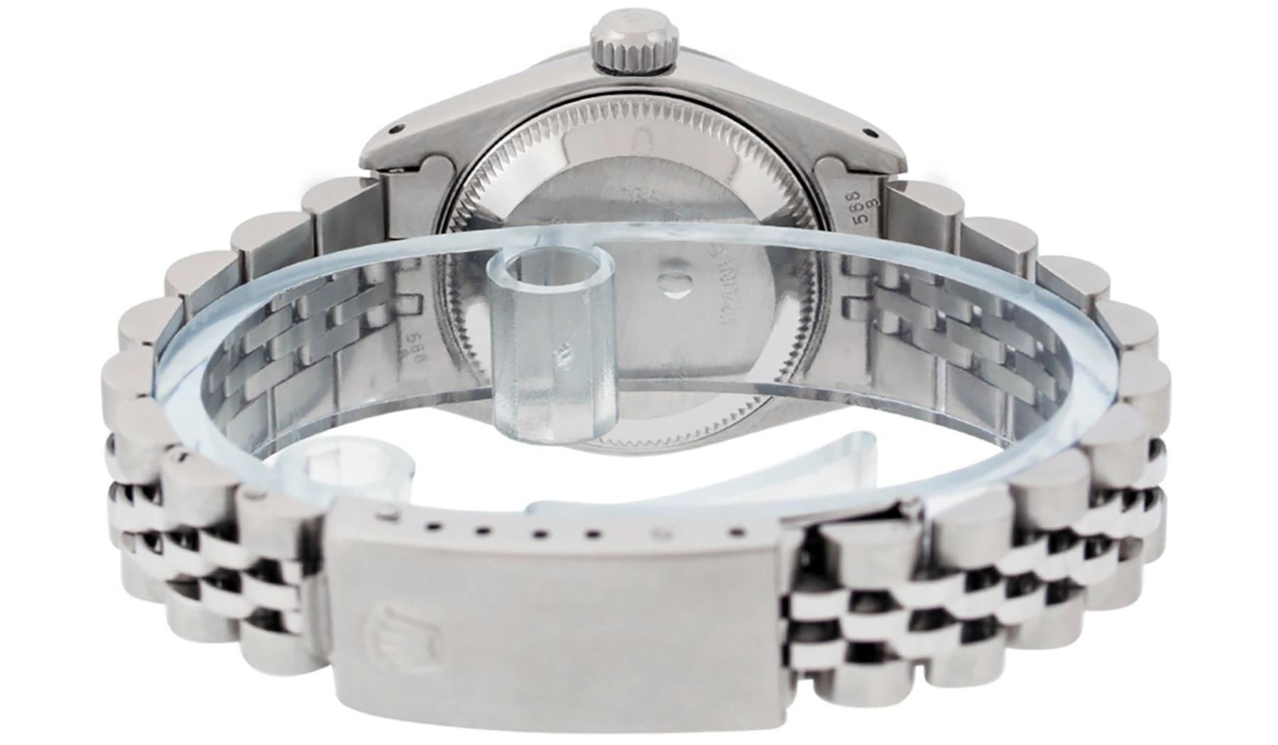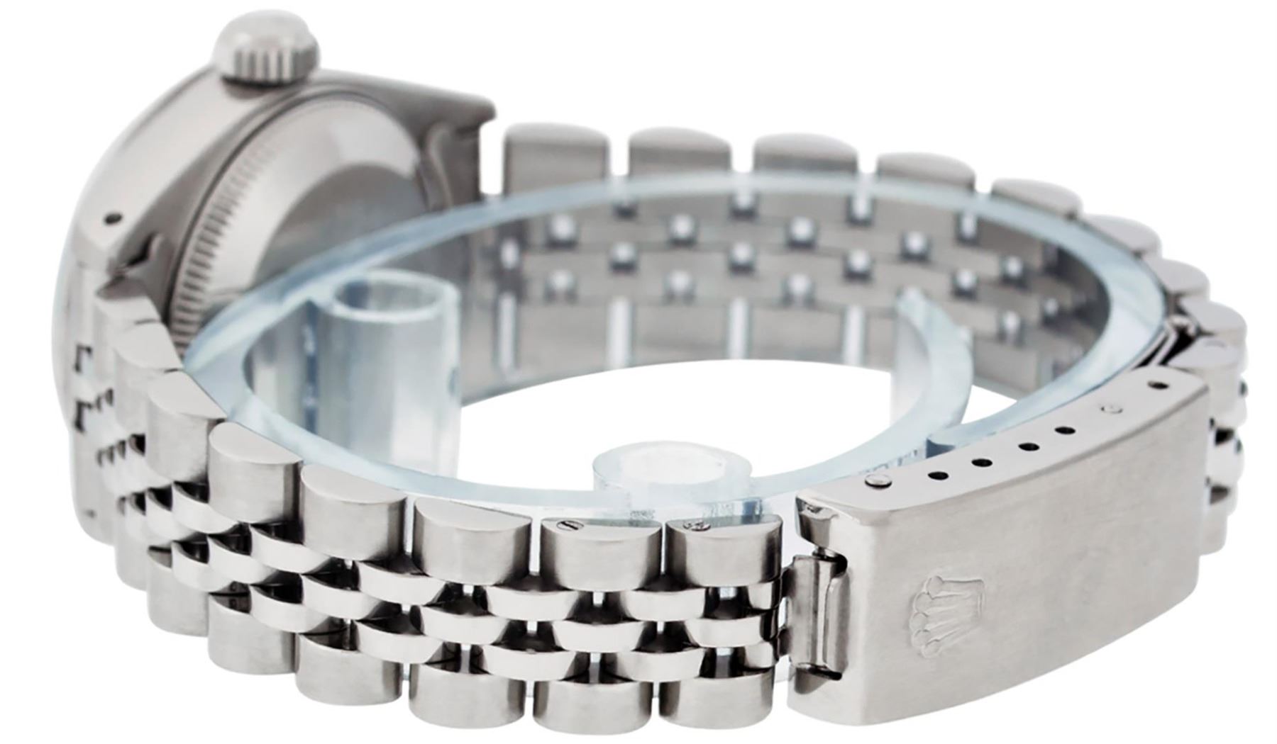 One Ladies Pre Owned Stainless Steel Rolex Date Polished Bright with Satin Finish, Serviced & Electronically Tested, Stainless Steel Case: 26mm, Stainless Steel Crown, Rolex Bezel: Stainless Steel Bezel. Custom Crystal: New Plastic With Date Window. Custom Hands: New Luminescent Hands. Rolex Movement: Automatic Winding Movement. Rolex Dial: Silver Index Dial. Date Window: 3 O'Clock Position Date Display, Model: Datejust. Condition: G-6 Extra Fine. Rolex Bracelet: Stainless Steel Jubilee Band. Bright Polish & Satin Finish. 6.0 Inch Length, Adjustable. Standard Clasp, With Rolex Logo. This Watch Has Been Serviced Time Tested And Is In Excellent Condition It Is Free Of All Scratches And Dents.