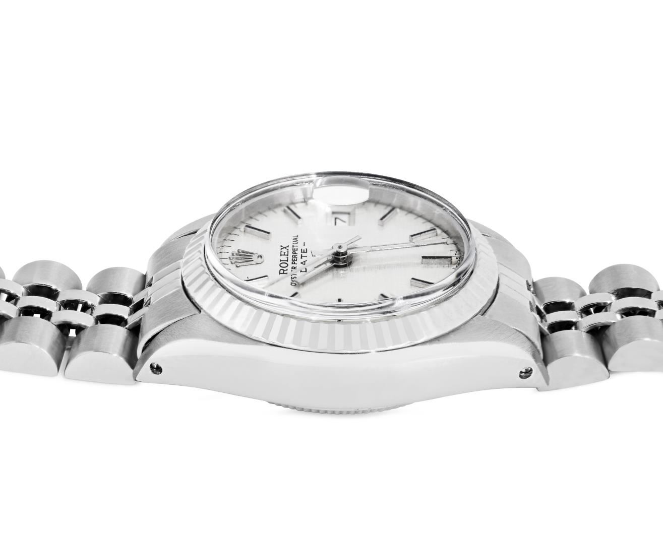 One Rolex Ladies Pre Owned Stainless Steel Date Wristwatch Polished Bright with Satin Finish, Serviced & Electronically Tested, Stainless Steel Case: 26mm, Stainless Steel Crown, 14K White Gold Fluted Bezel, Custom Crystal: New Acrylic With Magnifying Date Window. Custom Hands: New Luminescent Hands. Rolex Movement: Automatic Winding Movement 2035. Rolex Dial: Factory Silver Linen Dial With Black Lumi Index Hour Markers, Lumi Dots, and a Dash Track. Date Window: 3 O'Clock Position Date Display, Model: Date. Condition: G-6 Extra Fine. Rolex Bracelet: Stainless Steel Jubilee Band. Bright Polish & Satin Finish. 6.0 Inch Length, Adjustable. Standard Clasp, With Rolex Logo. This Watch Has Been Serviced Time Tested And Is In Excellent Condition. It Is Free Of All Scratches And Dents.