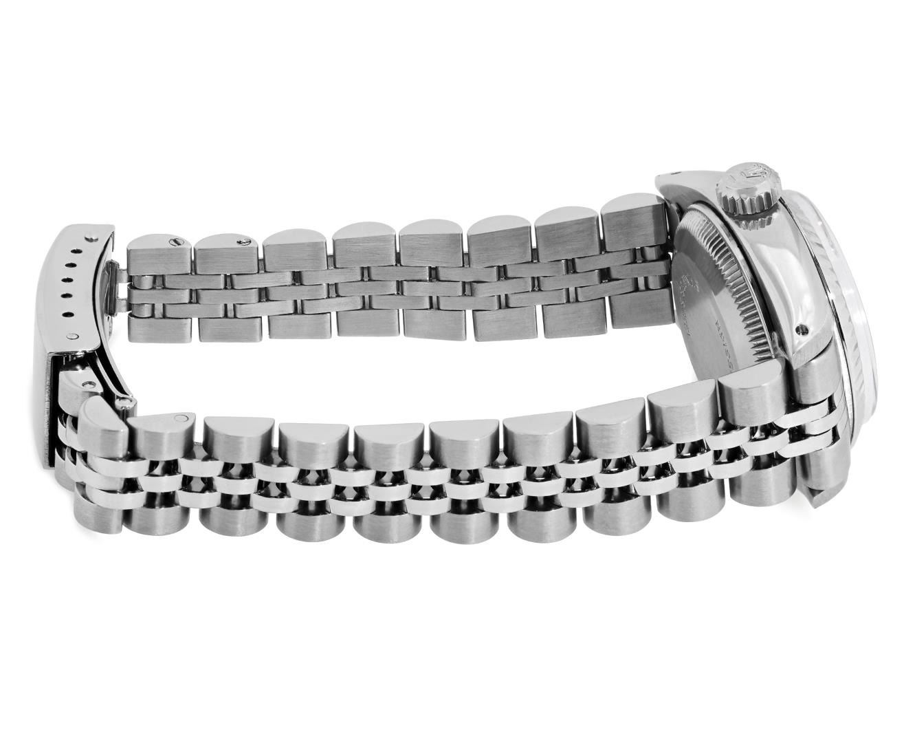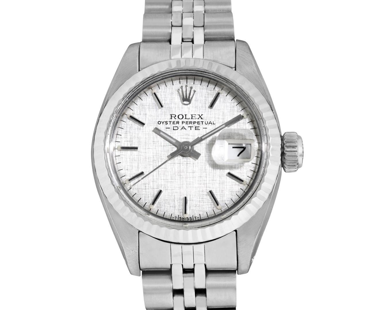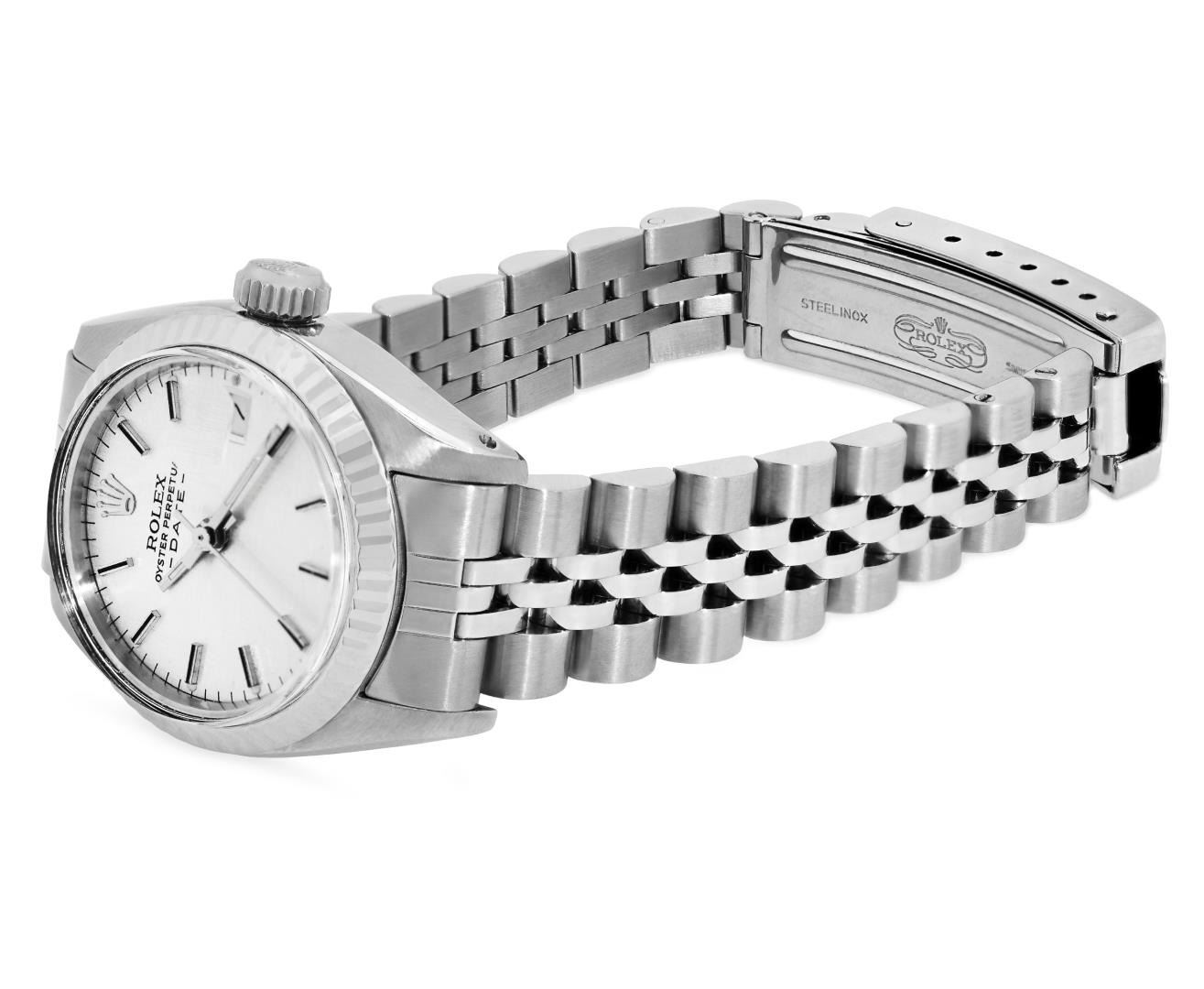 One Rolex Ladies Pre Owned Stainless Steel Date Wristwatch Polished Bright with Satin Finish, Serviced & Electronically Tested, Stainless Steel Case: 26mm, Stainless Steel Crown, 14K White Gold Fluted Bezel, Custom Crystal: New Acrylic With Magnifying Date Window. Custom Hands: New Luminescent Hands. Rolex Movement: Automatic Winding Movement 2035. Rolex Dial: Factory Silver Linen Dial With Black Lumi Index Hour Markers, Lumi Dots, and a Dash Track. Date Window: 3 O'Clock Position Date Display, Model: Date. Condition: G-6 Extra Fine. Rolex Bracelet: Stainless Steel Jubilee Band. Bright Polish & Satin Finish. 6.0 Inch Length, Adjustable. Standard Clasp, With Rolex Logo. This Watch Has Been Serviced Time Tested And Is In Excellent Condition. It Is Free Of All Scratches And Dents.