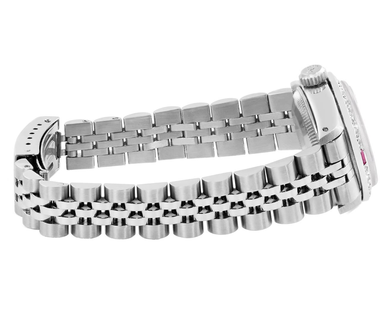 One Rolex Ladies Pre Owned Stainless Steel Date Wristwatch Polished Bright with Satin Finish, Serviced & Electronically Tested, Stainless Steel Case: 26mm, Stainless Steel Crown, Custom Bezel: New 18K White Gold Ruby Beadset Diamond Bezel, Diamond + Gem C
