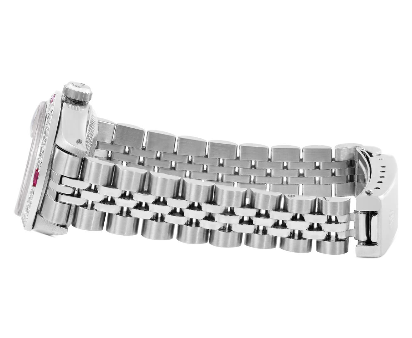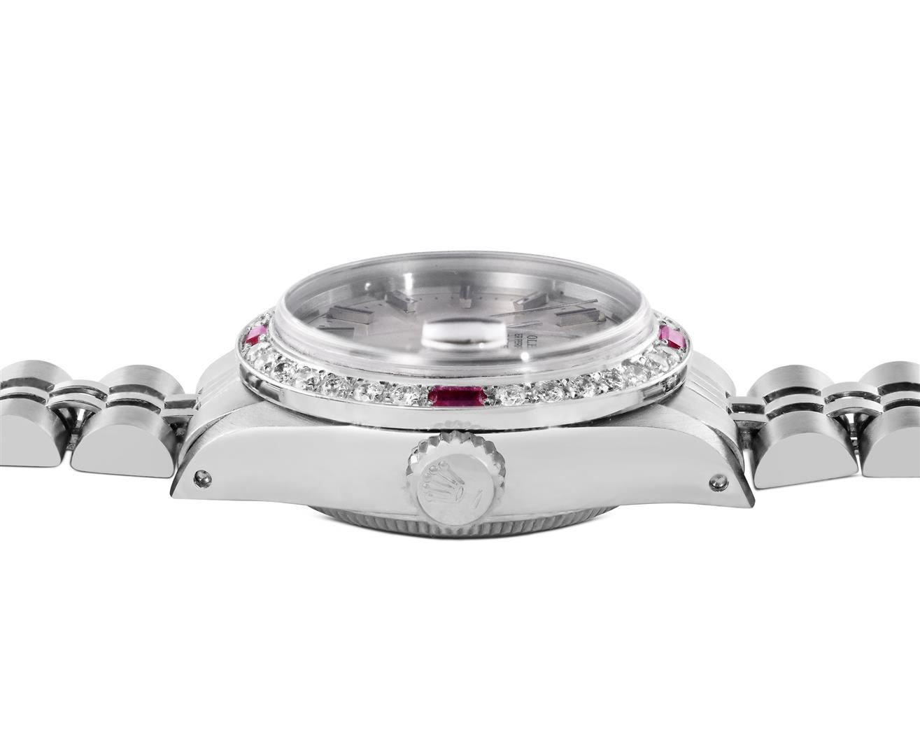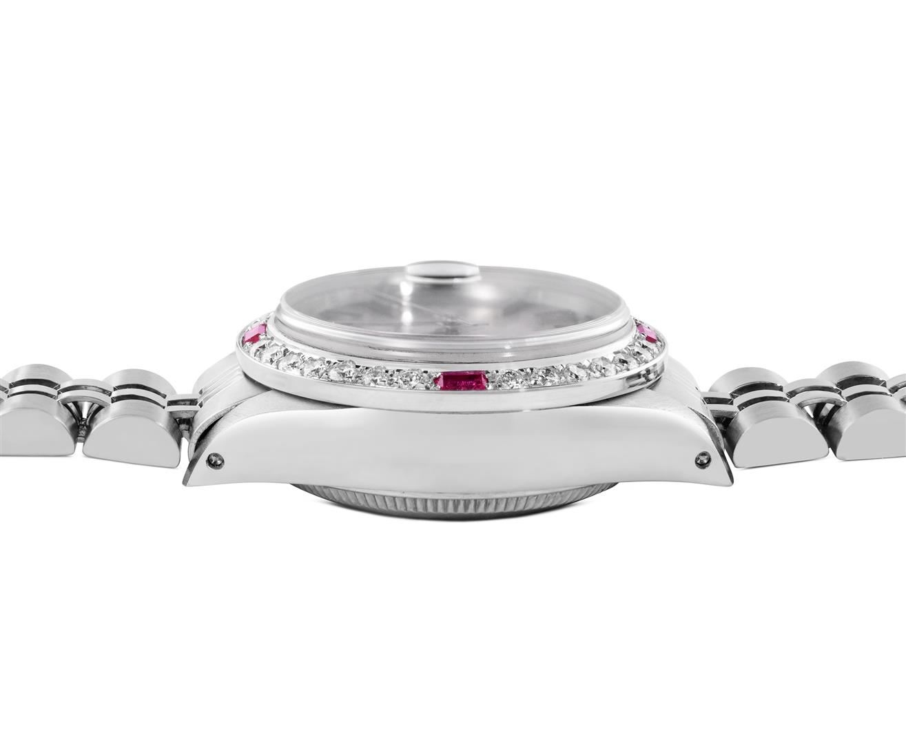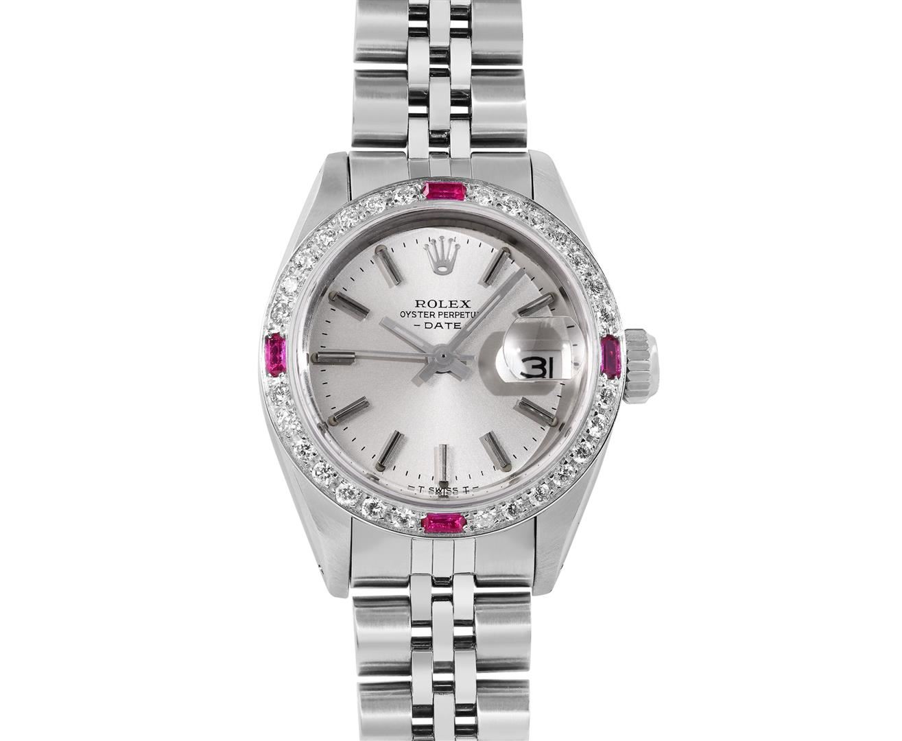 One Rolex Ladies Pre Owned Stainless Steel Date Wristwatch Polished Bright with Satin Finish, Serviced & Electronically Tested, Stainless Steel Case: 26mm, Stainless Steel Crown, Custom Bezel: New 18K White Gold Ruby Beadset Diamond Bezel, Diamond + Gem Count: 36 Diamonds + 4 Rubies, Clarity: SI-VS, Color: G to H. Custom Crystal: New Sapphire With Magnified Date Window. Custom Hands: New Luminescent Hands. Rolex Movement: Automatic Winding Movement 2030. Rolex Dial: Factory Silver Dial With Index Hour Markers and Lumi Markers, Dash Track, and Lumi Dots. Date Window: 3 O'Clock Position Date Display, Model: Date. Condition: G-6 Extra Fine. Rolex Bracelet: Stainless Steel Jubilee Band. Bright Polish & Satin Finish. 6.0 Inch Length, Adjustable. Standard Clasp, With Rolex Logo. This Watch Has Been Serviced Time Tested And Is In Excellent Condition. It Is Free Of All Scratches And Dents.