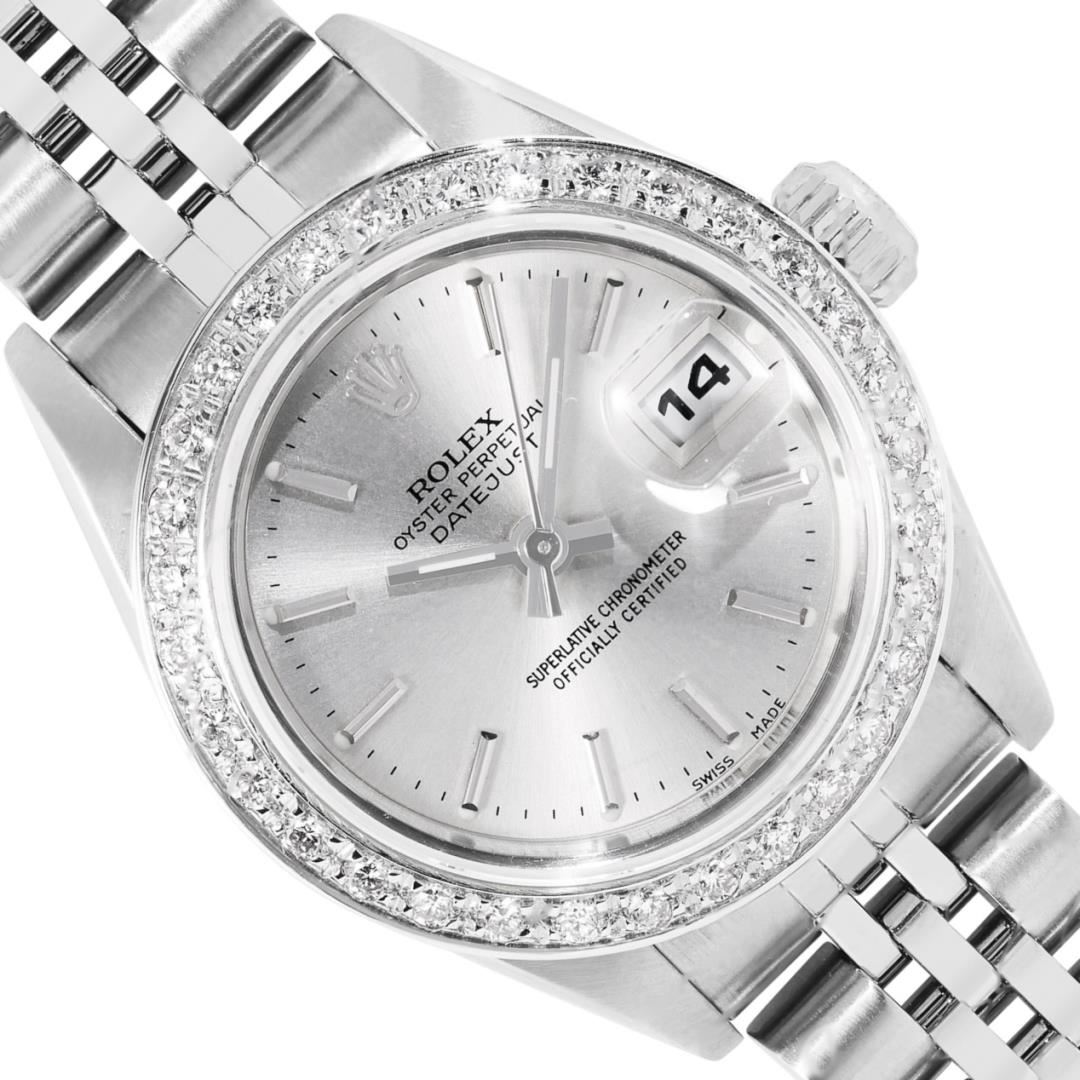 One Rolex Ladies Pre Owned Quickset Stainless Steel Datejust Wristwatch Polished Bright with Satin Finish, Serviced And Electronically Tested, Stainless Steel Case: 26mm, Stainless Steel Crown, Custom Bezel: New 18K White Gold Beadset Diamond Bezel, Diamond Count: 32 Diamonds. Custom Crystal: New Sapphire With Magnified Date Window. Custom Hands: New Luminescent Hands. Rolex Movement: 2235 Automatic Winding Movement. Rolex Dial: Factory Silver With Index Hour Markers, and Square Track. Date Window: 3 O'Clock Position Date Display, Model: Quickset Datejust. Condition: G-6 Extra Fine. Rolex Bracelet: Stainless Steel Jubilee Band. Bright Polish & Satin Finish. 6.0 Inch Length, Adjustable. Standard Clasp, With Rolex Logo. This Watch Has Been Serviced Time Tested And Is In Excellent Condition. It Is Free Of All Scratches And Dents.