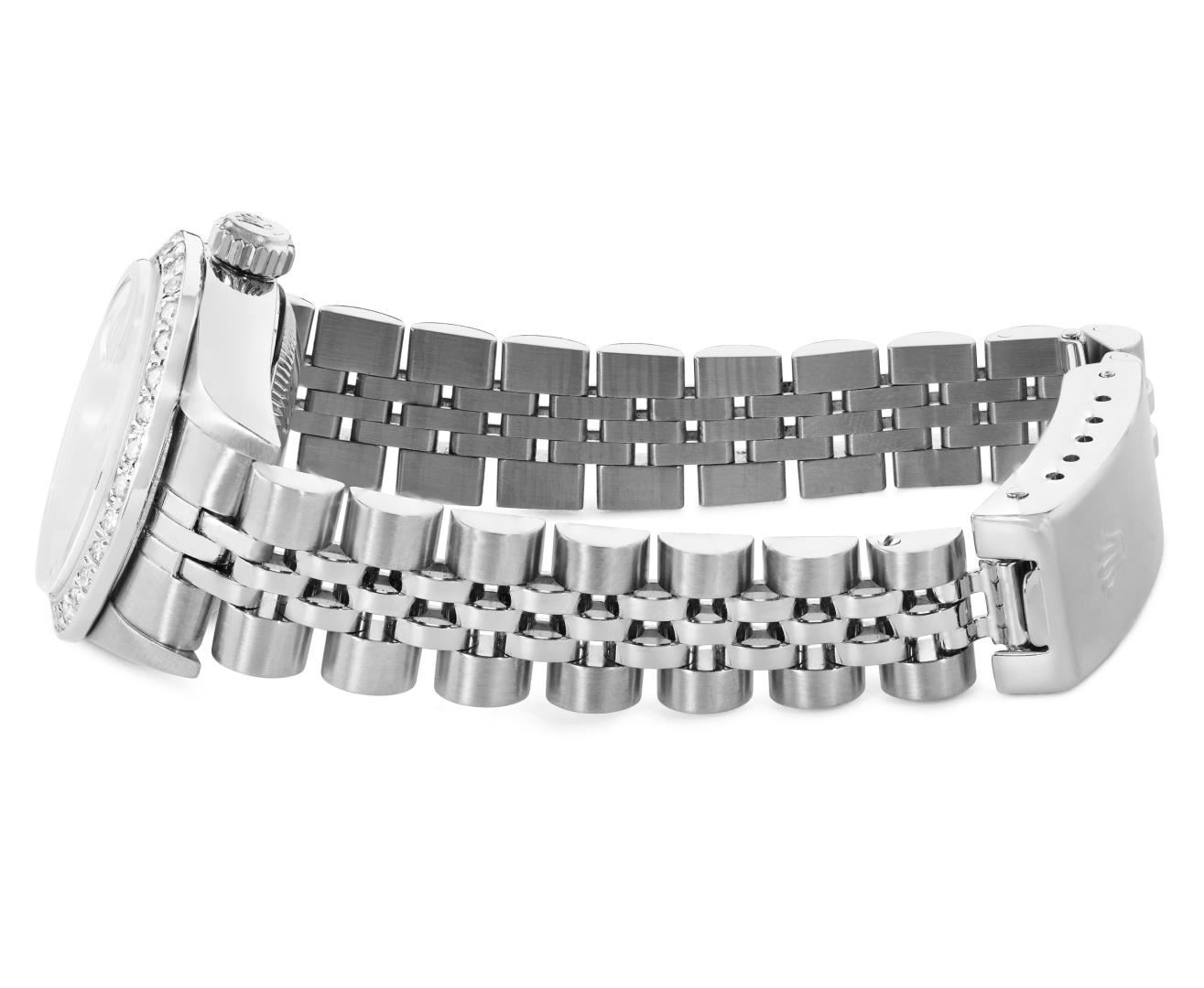 One Rolex Ladies Pre Owned Quickset Stainless Steel Datejust Wristwatch Polished Bright with Satin Finish, Serviced And Electronically Tested, Stainless Steel Case: 26mm, Stainless Steel Crown, Custom Bezel: New 18K White Gold Beadset Diamond Bezel, Diamond Count: 32 Diamonds. Custom Crystal: New Sapphire With Magnified Date Window. Custom Hands: New Luminescent Hands. Rolex Movement: 2235 Automatic Winding Movement. Rolex Dial: Factory Silver With Index Hour Markers, and Square Track. Date Window: 3 O'Clock Position Date Display, Model: Quickset Datejust. Condition: G-6 Extra Fine. Rolex Bracelet: Stainless Steel Jubilee Band. Bright Polish & Satin Finish. 6.0 Inch Length, Adjustable. Standard Clasp, With Rolex Logo. This Watch Has Been Serviced Time Tested And Is In Excellent Condition. It Is Free Of All Scratches And Dents.
