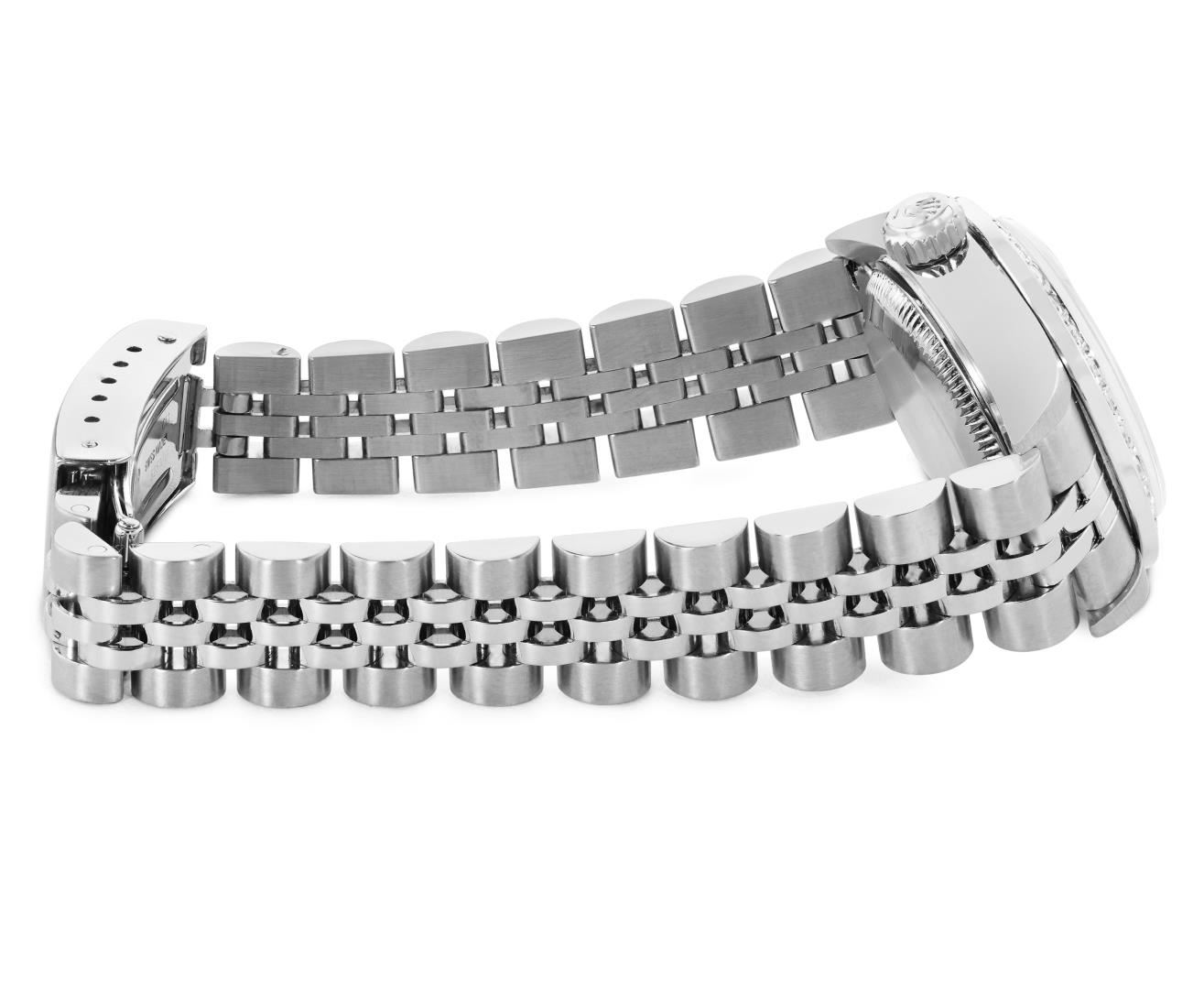 One Rolex Ladies Pre Owned Quickset Stainless Steel Datejust Wristwatch Polished Bright with Satin Finish, Serviced And Electronically Tested, Stainless Steel Case: 26mm, Stainless Steel Crown, Custom Bezel: New 18K White Gold Beadset Diamond Bezel, Diamond Count: 32 Diamonds. Custom Crystal: New Sapphire With Magnified Date Window. Custom Hands: New Luminescent Hands. Rolex Movement: 2235 Automatic Winding Movement. Rolex Dial: Factory Silver With Index Hour Markers, and Square Track. Date Window: 3 O'Clock Position Date Display, Model: Quickset Datejust. Condition: G-6 Extra Fine. Rolex Bracelet: Stainless Steel Jubilee Band. Bright Polish & Satin Finish. 6.0 Inch Length, Adjustable. Standard Clasp, With Rolex Logo. This Watch Has Been Serviced Time Tested And Is In Excellent Condition. It Is Free Of All Scratches And Dents.