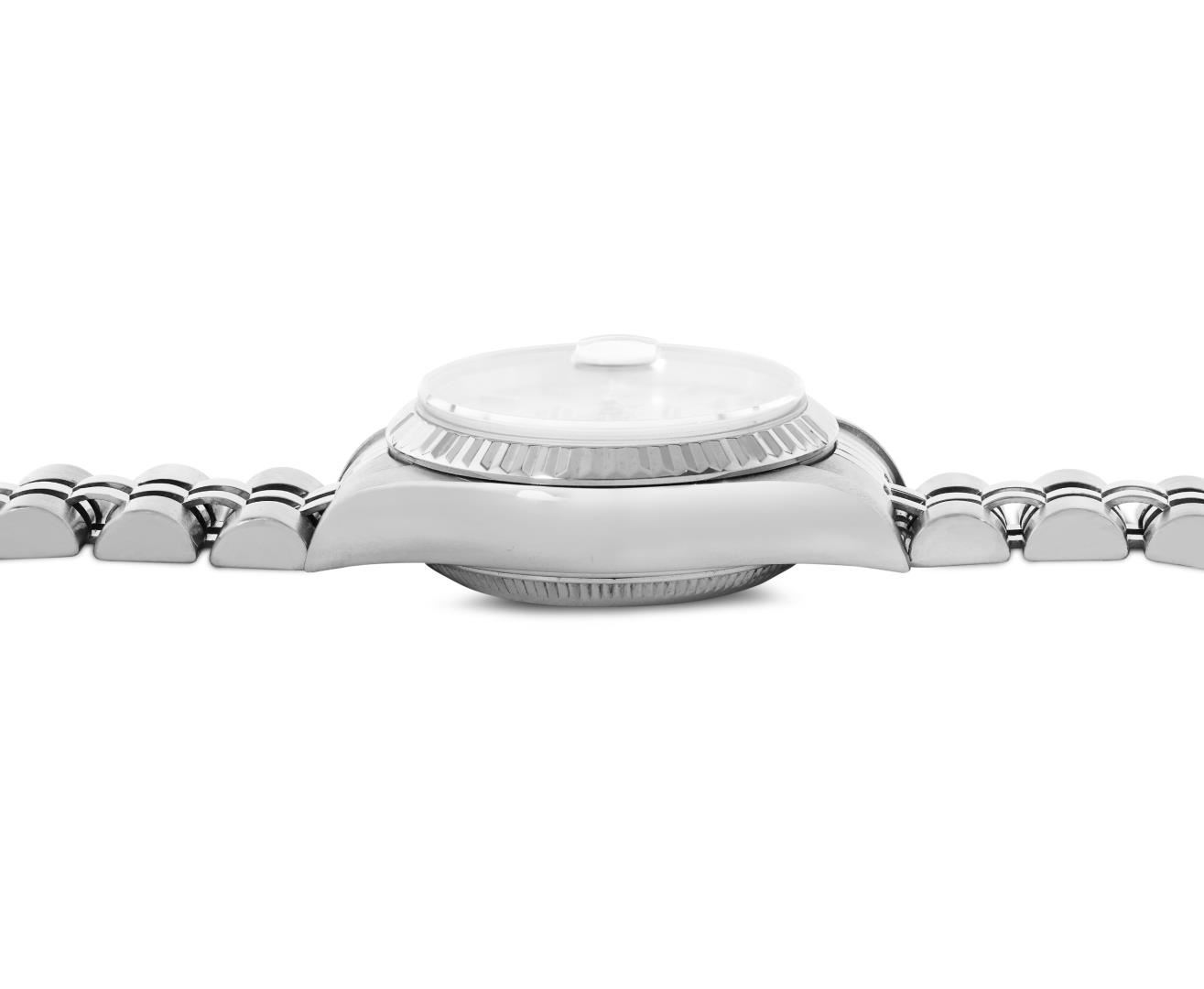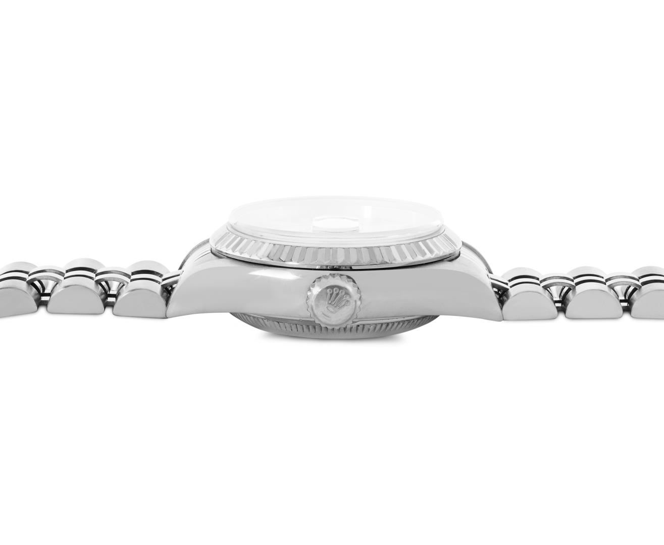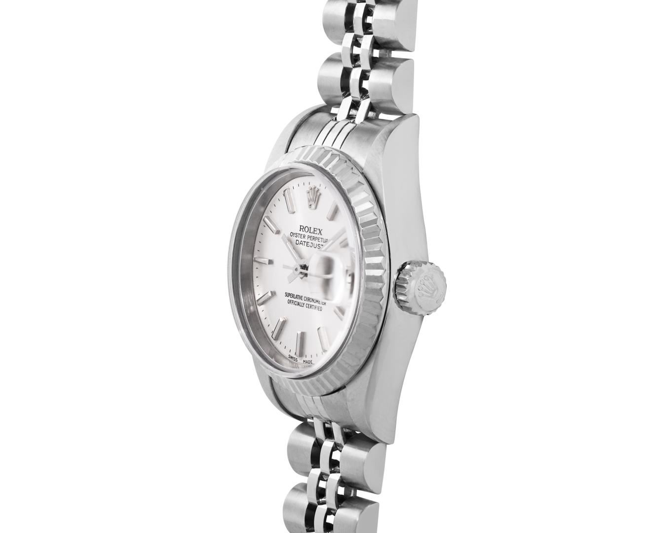 One Rolex Ladies Pre Owned Quickset Stainless Steel Datejust Wristwatch Polished Bright with Satin Finish, Serviced And Electronically Tested, Stainless Steel Case: 26mm, Stainless Steel Crown, Rolex Bezel: 18K White Gold Fluted Bezel. Crystal: Sapphire With Magnified Date Window. Hands: Luminescent Hands. Rolex Movement: 2235 Automatic Winding Movement. Rolex Dial: Factory Silver WithIndex Hour Markers, and Dash Track. Date Window: 3 O'Clock Position Date Display, Model: Quickset Datejust. Condition: G-6 Extra Fine. Rolex Bracelet: Stainless Steel Jubilee Band. Bright Polish And Satin Finish. 6.0 Inch Length, Adjustable. Standard Clasp, With Rolex Logo. This Watch Has Been Serviced Time Tested And Is In Excellent Condition. It Is Free Of All Scratches And Dents.