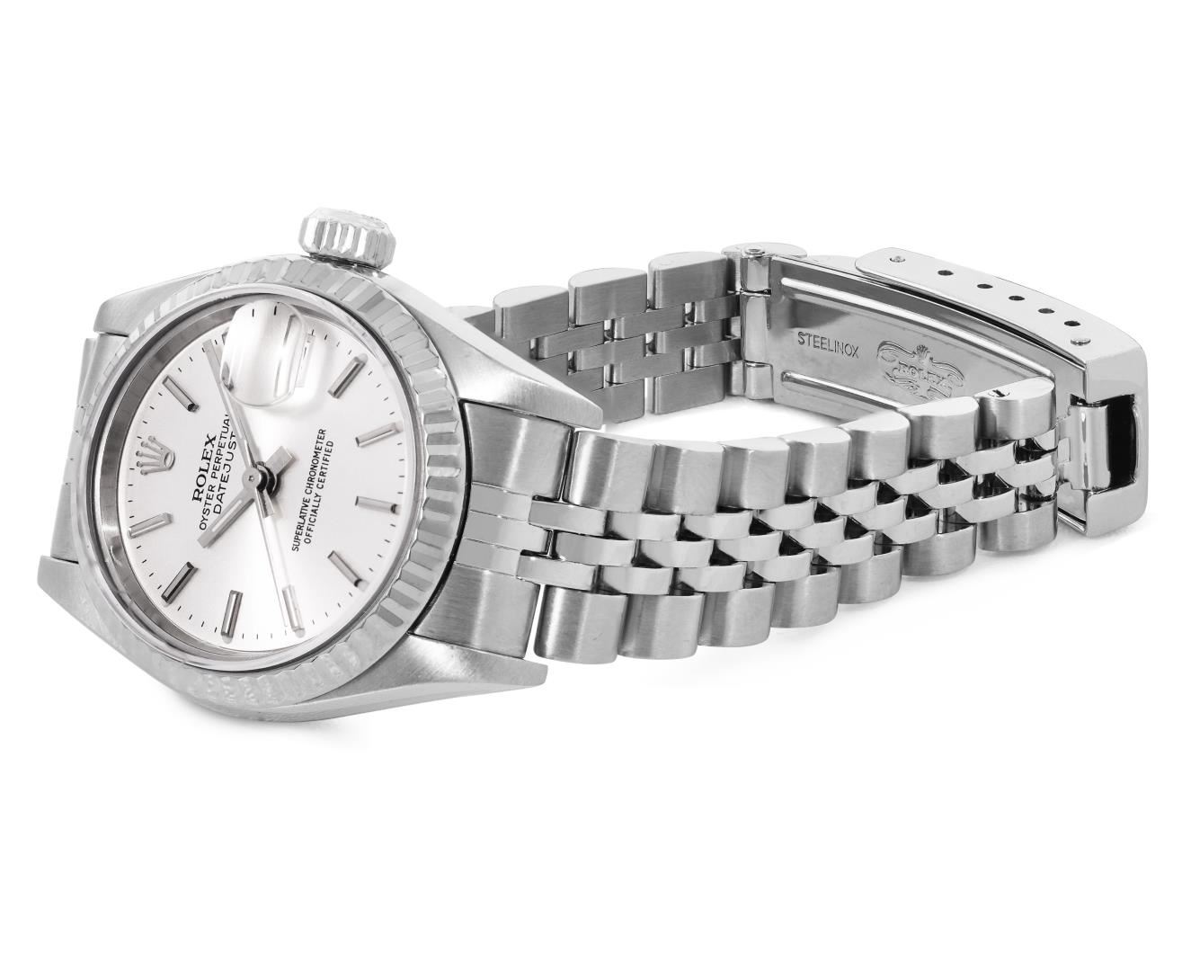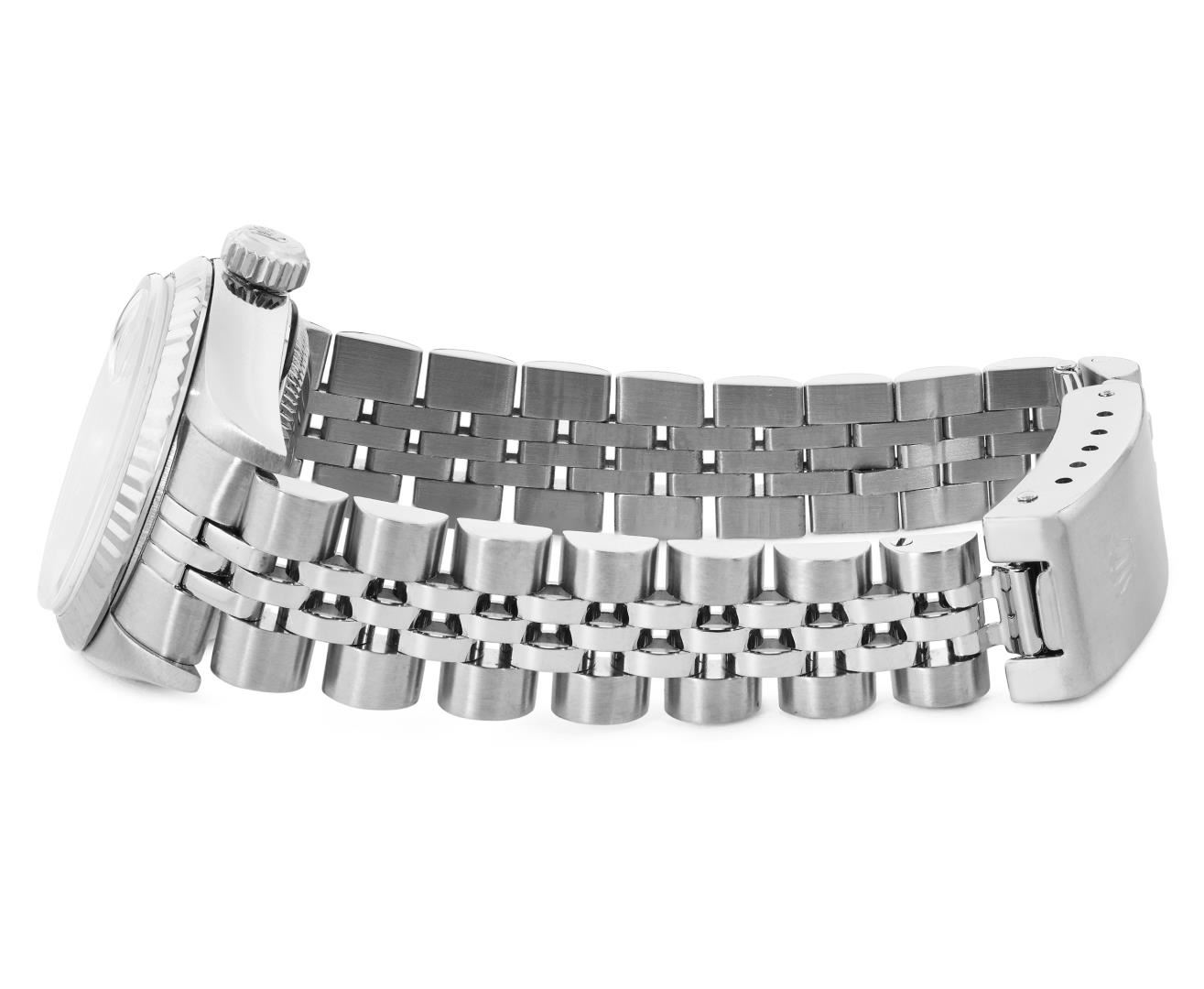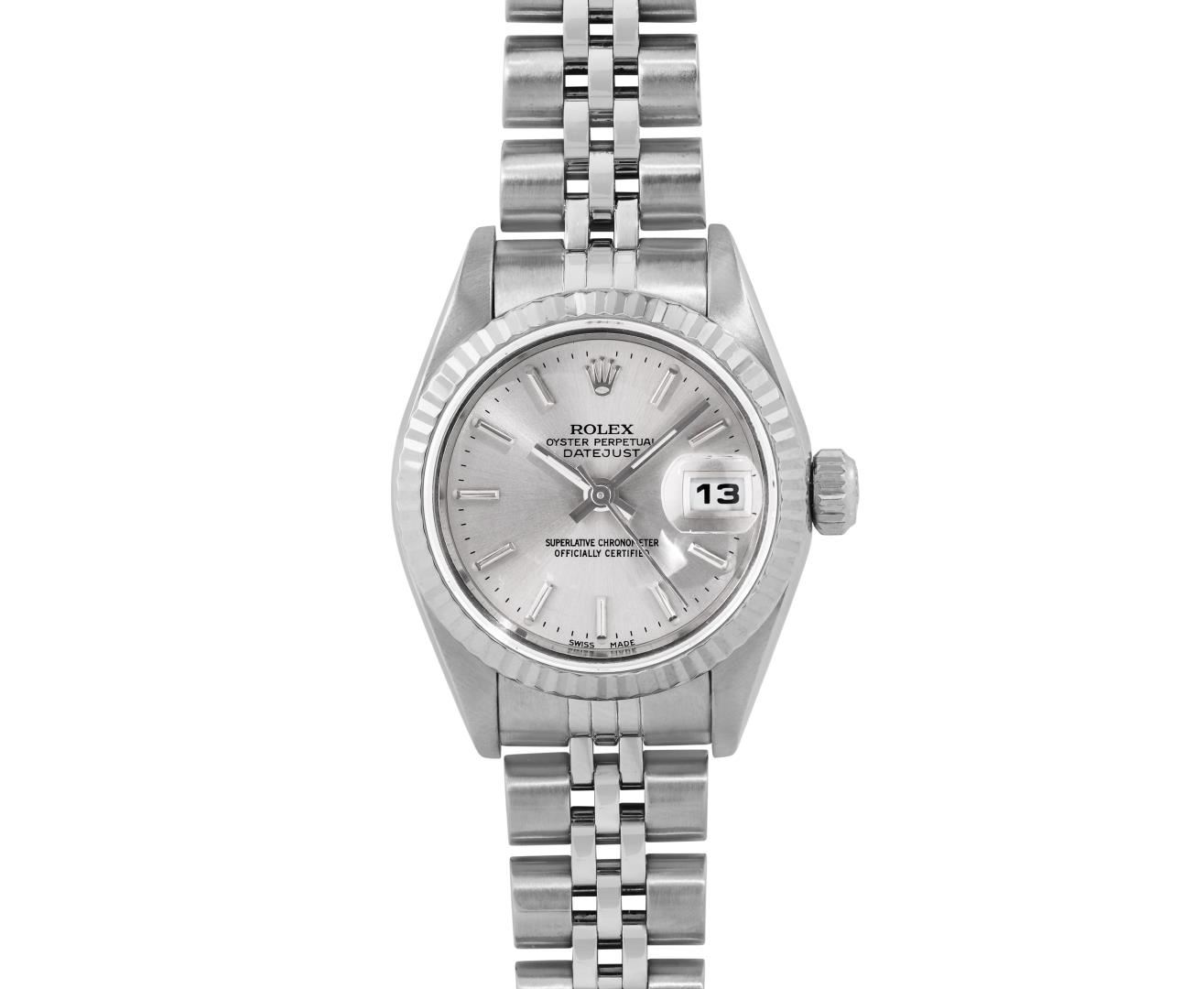 One Rolex Ladies Pre Owned Quickset Stainless Steel Datejust Wristwatch Polished Bright with Satin Finish, Serviced And Electronically Tested, Stainless Steel Case: 26mm, Stainless Steel Crown, Rolex Bezel: 18K White Gold Fluted Bezel. Crystal: Sapphire With Magnified Date Window. Hands: Luminescent Hands. Rolex Movement: 2235 Automatic Winding Movement. Rolex Dial: Factory Silver WithIndex Hour Markers, and Dash Track. Date Window: 3 O'Clock Position Date Display, Model: Quickset Datejust. Condition: G-6 Extra Fine. Rolex Bracelet: Stainless Steel Jubilee Band. Bright Polish And Satin Finish. 6.0 Inch Length, Adjustable. Standard Clasp, With Rolex Logo. This Watch Has Been Serviced Time Tested And Is In Excellent Condition. It Is Free Of All Scratches And Dents.
