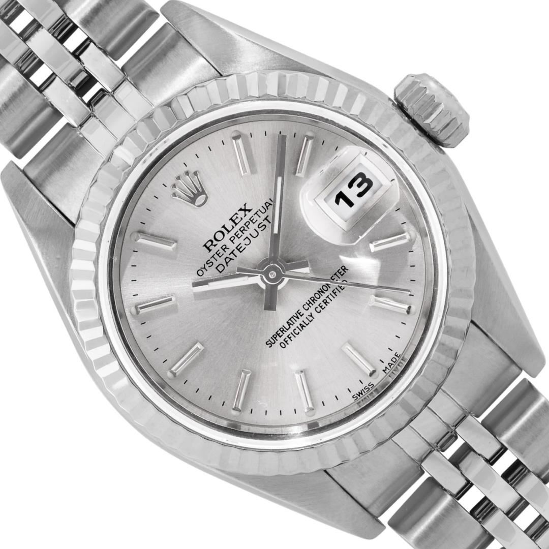One Rolex Ladies Pre Owned Quickset Stainless Steel Datejust Wristwatch Polished Bright with Satin Finish, Serviced And Electronically Tested, Stainless Steel Case: 26mm, Stainless Steel Crown, Rolex Bezel: 18K White Gold Fluted Bezel. Crystal: Sapphire With Magnified Date Window. Hands: Luminescent Hands. Rolex Movement: 2235 Automatic Winding Movement. Rolex Dial: Factory Silver WithIndex Hour Markers, and Dash Track. Date Window: 3 O'Clock Position Date Display, Model: Quickset Datejust. Condition: G-6 Extra Fine. Rolex Bracelet: Stainless Steel Jubilee Band. Bright Polish And Satin Finish. 6.0 Inch Length, Adjustable. Standard Clasp, With Rolex Logo. This Watch Has Been Serviced Time Tested And Is In Excellent Condition. It Is Free Of All Scratches And Dents.