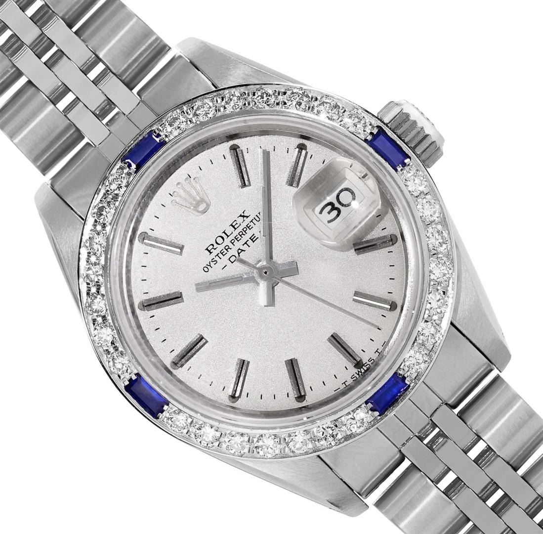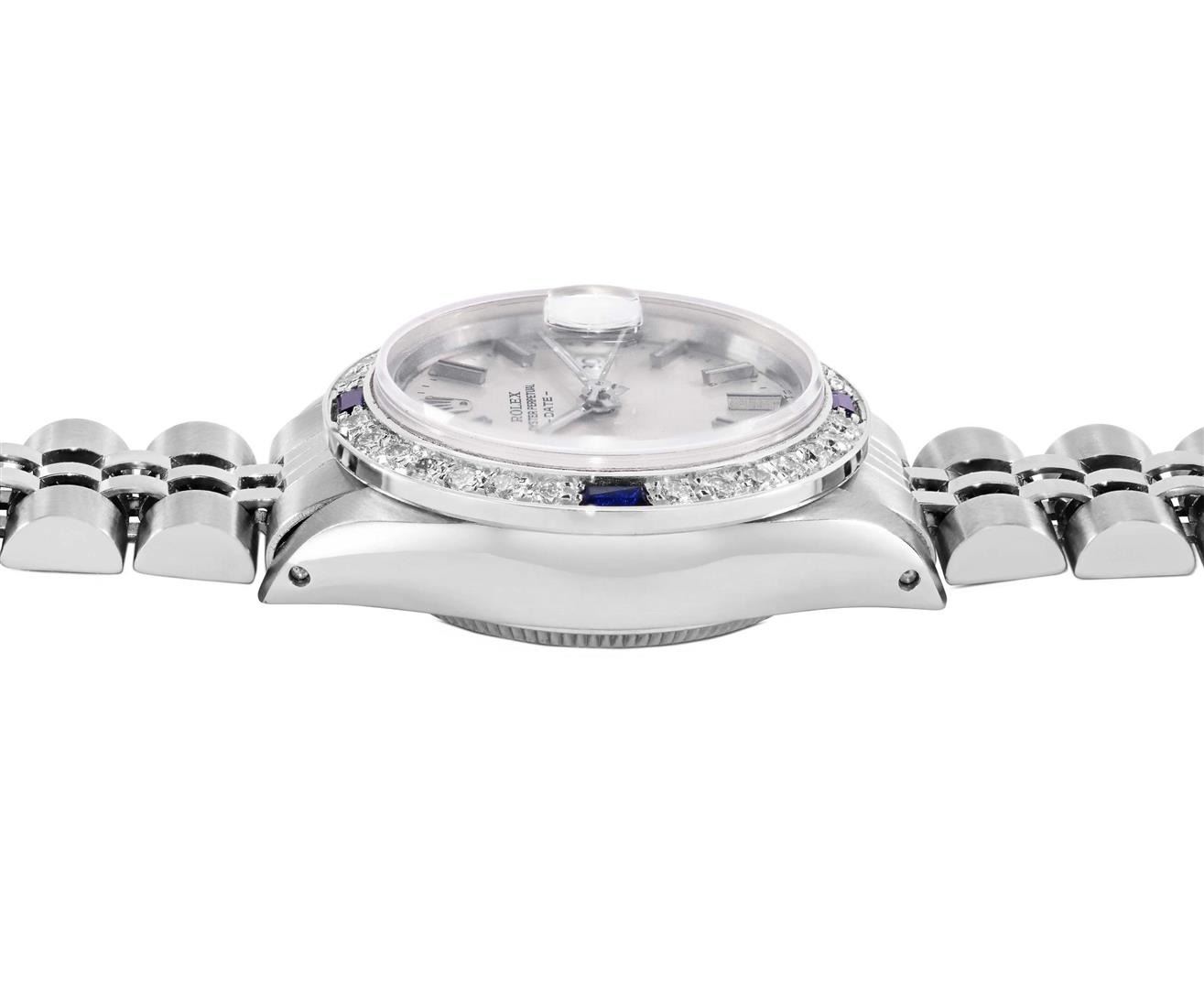 One Rolex Ladies Pre Owned Stainless Steel Date Wristwatch Polished Bright with Satin Finish, Serviced & Electronically Tested, Stainless Steel Case: 26mm, Stainless Steel Crown, Custom Bezel: New 18K White Gold Sapphire Beadset Diamond Bezel, Diamond + G