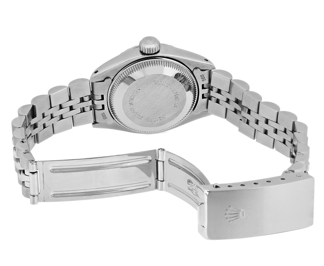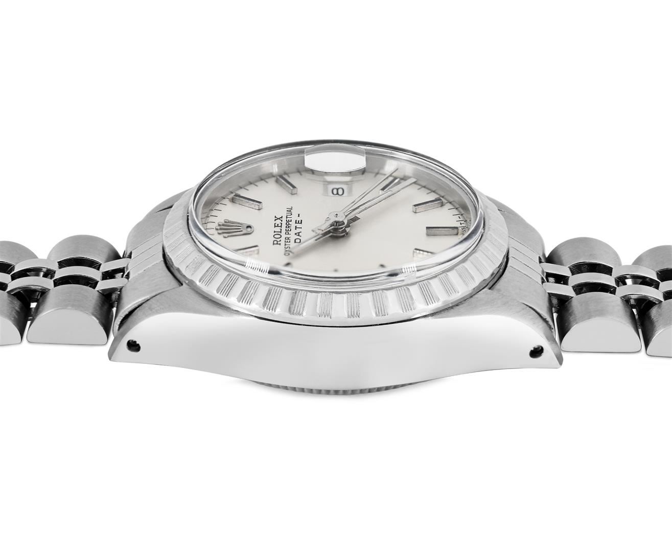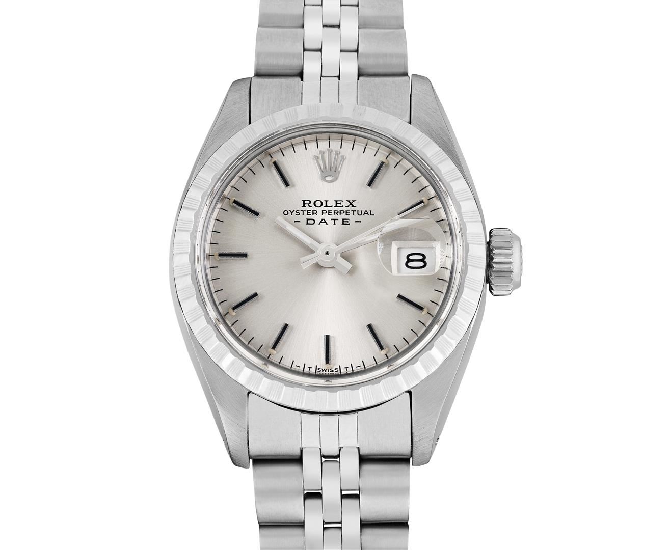 One Rolex Ladies Pre Owned Stainless Steel Date Wristwatch Polished Bright with Satin Finish, Serviced & Electronically Tested, Stainless Steel Case: 26mm, Stainless Steel Crown, Stainless Steel Engine Turn Bezel, Custom Crystal: New Acrylic With Magnifying Date Window. Custom Hands: New Luminescent Hands. Rolex Movement: Automatic Winding Movement 2030. Rolex Dial: Factory Silver Dial With Index Hour Markers And Lumi Dots. Date Window: 3 O'Clock Position Date Display, Model: Date. Condition: G-6 Extra Fine. Rolex Bracelet: Stainless Steel Jubilee Band. Bright Polish & Satin Finish. 6.0 Inch Length, Adjustable. Standard Clasp, With Rolex Logo. This Watch Has Been Serviced Time Tested And Is In Excellent Condition. It Is Free Of All Scratches And Dents. This Watch Comes With A Rolex Box.