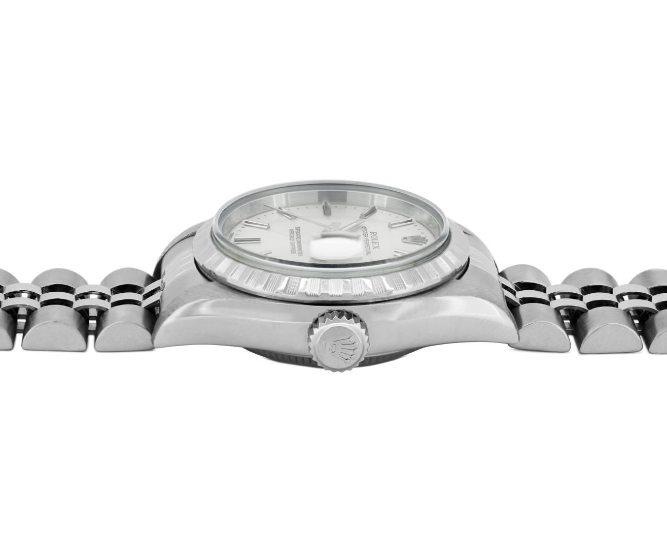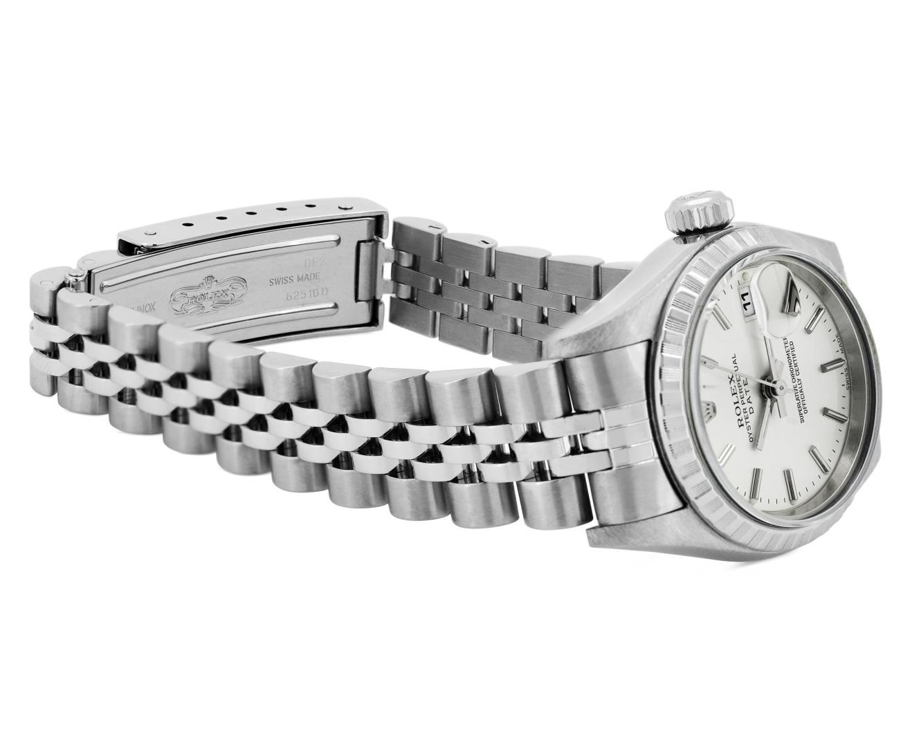One Rolex Ladies Pre Owned Quickset Stainless Steel Date Wristwatch Polished Bright with Satin Finish, Serviced And Electronically Tested, Stainless Steel Case: 26mm, Stainless Steel Crown, Rolex Stainless Steel Engine Turn bezel. Crystal: Sapphire With Magnified Date Window. Hands: Luminescent Hands. Rolex Movement: 2235 Automatic Winding Movement. Rolex Dial: Factory Silver With Index Hour Markers, Dash Track, And Lumi Dots. Date Window: 3 O'Clock Position Date Display, Model: Sapphire Date. Condition: G-6 Extra Fine. Rolex Bracelet: Stainless Steel Jubilee Band. Bright Polish & Satin Finish. 6.0 Inch Length, Adjustable. Standard Clasp, With Rolex Logo. This Watch Has Been Serviced And Time Tested. It Is In Excellent Condition, Free Of All Scratches And Dents. This Watch Comes With A Rolex Box.